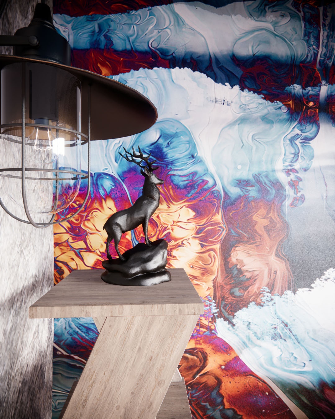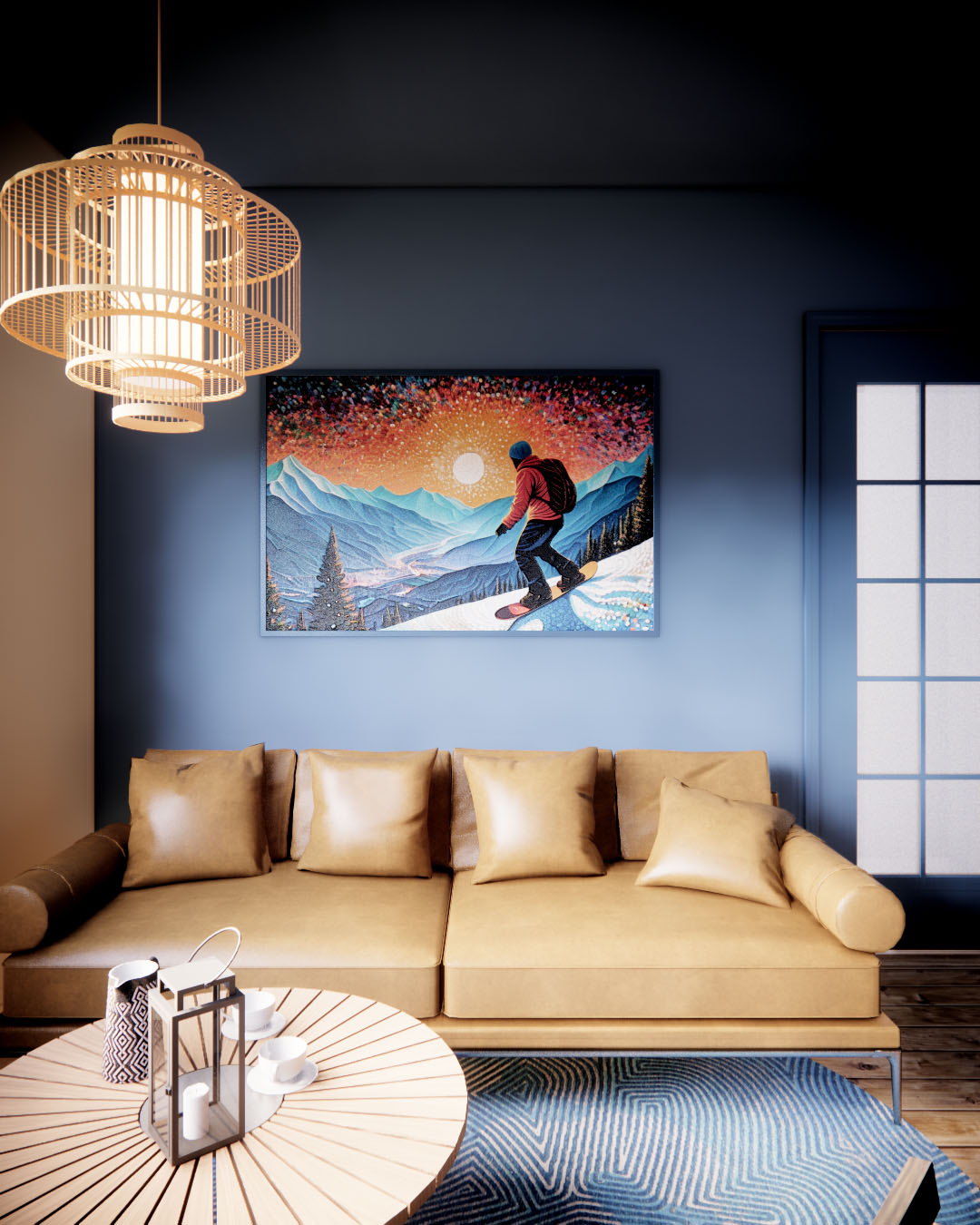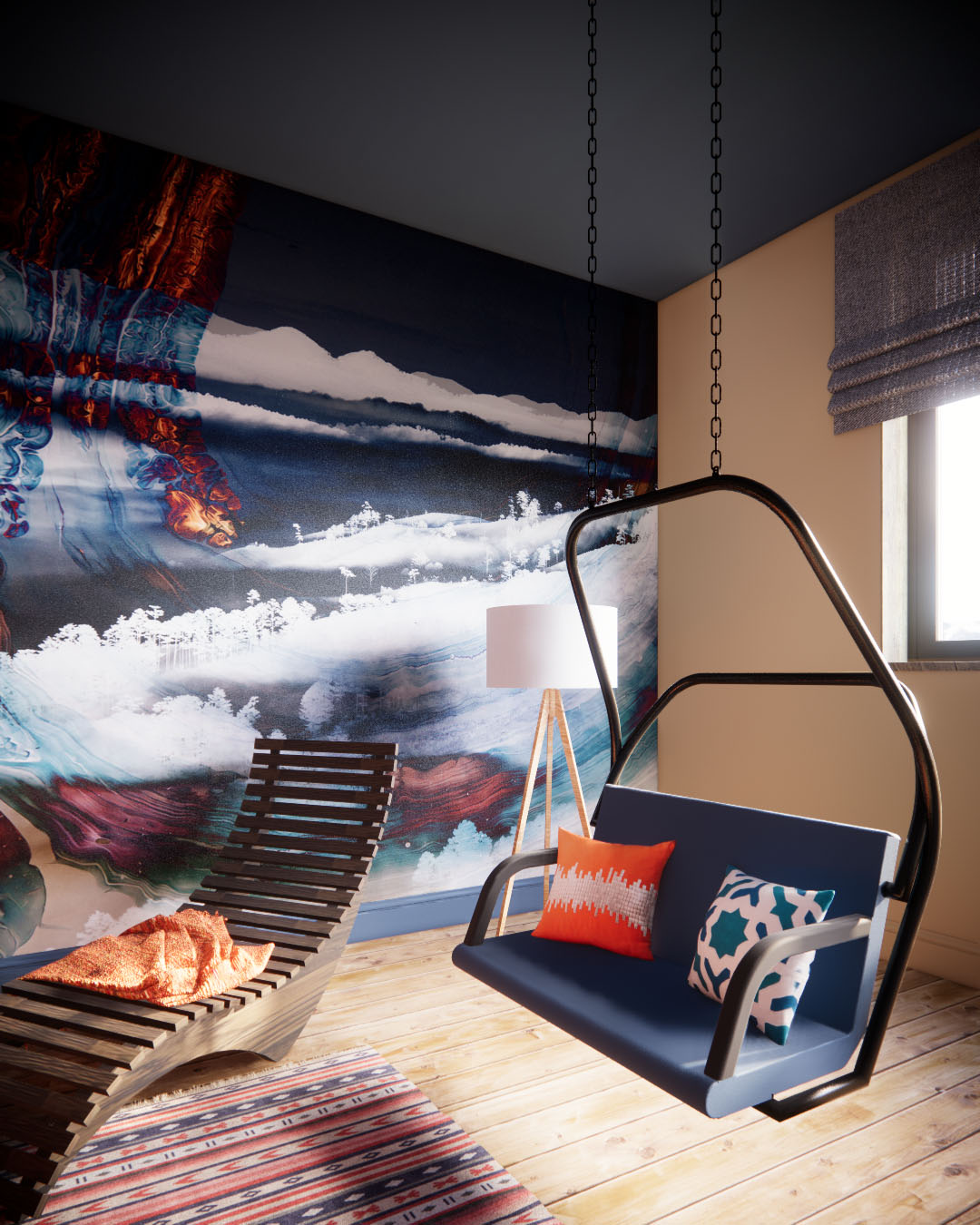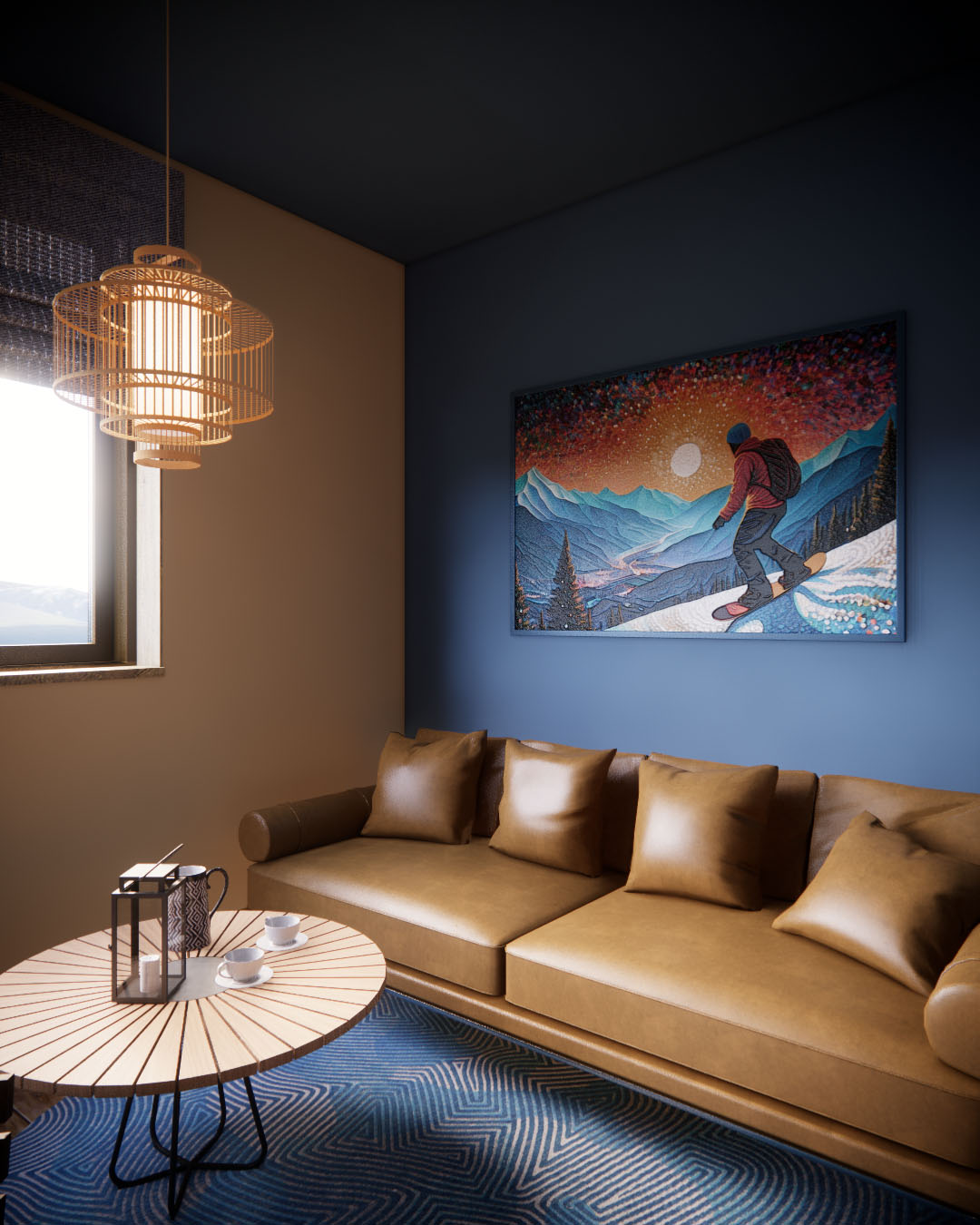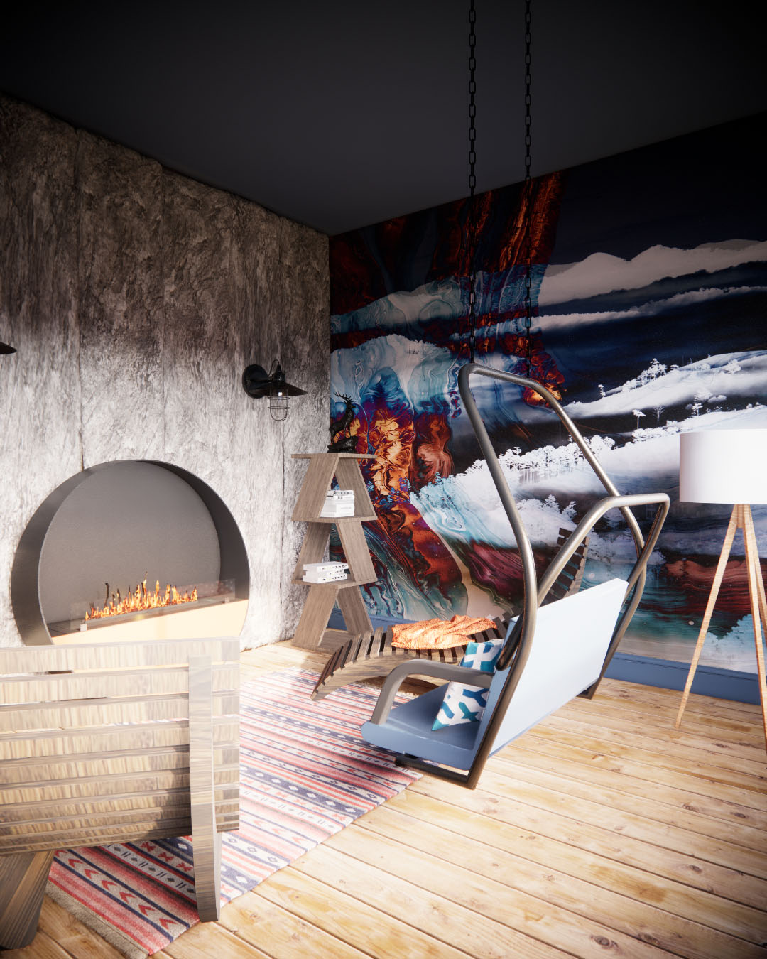 Интерьер с атмосферой горных склонов, где ощущается уют зимнего отдыха. Материалы отражают природу и эстетику горных регионов: дерево, камень и металл. Стены и потолок напоминают ночное небо, а обои с ярким рисунком — энергию горнолыжного вайба. Удобный кожаный диван, шезлонги, пледы и подушки в теплых тонах добавляют уют и комфорт.
