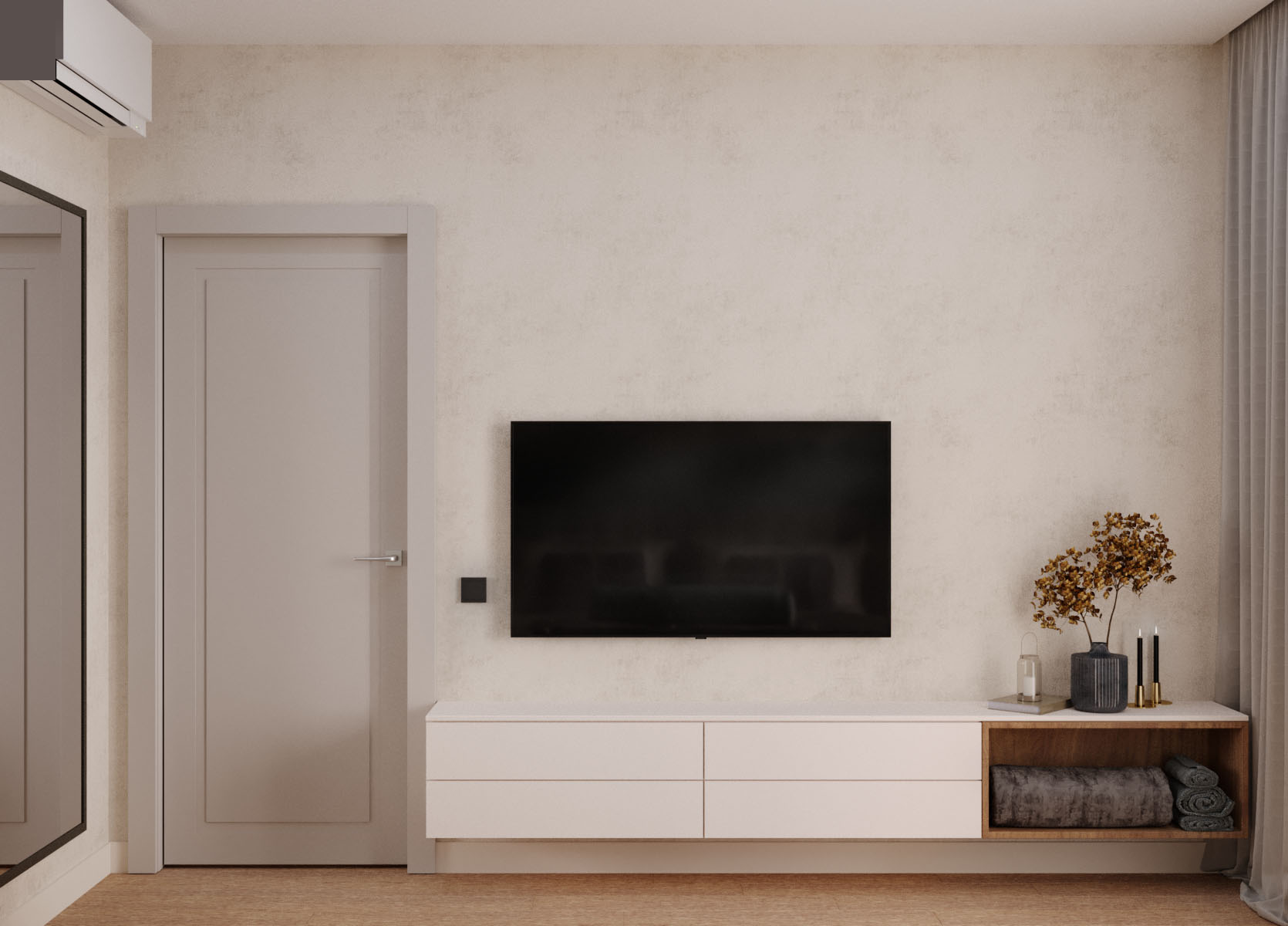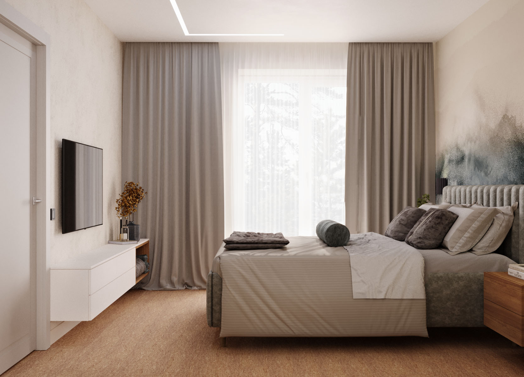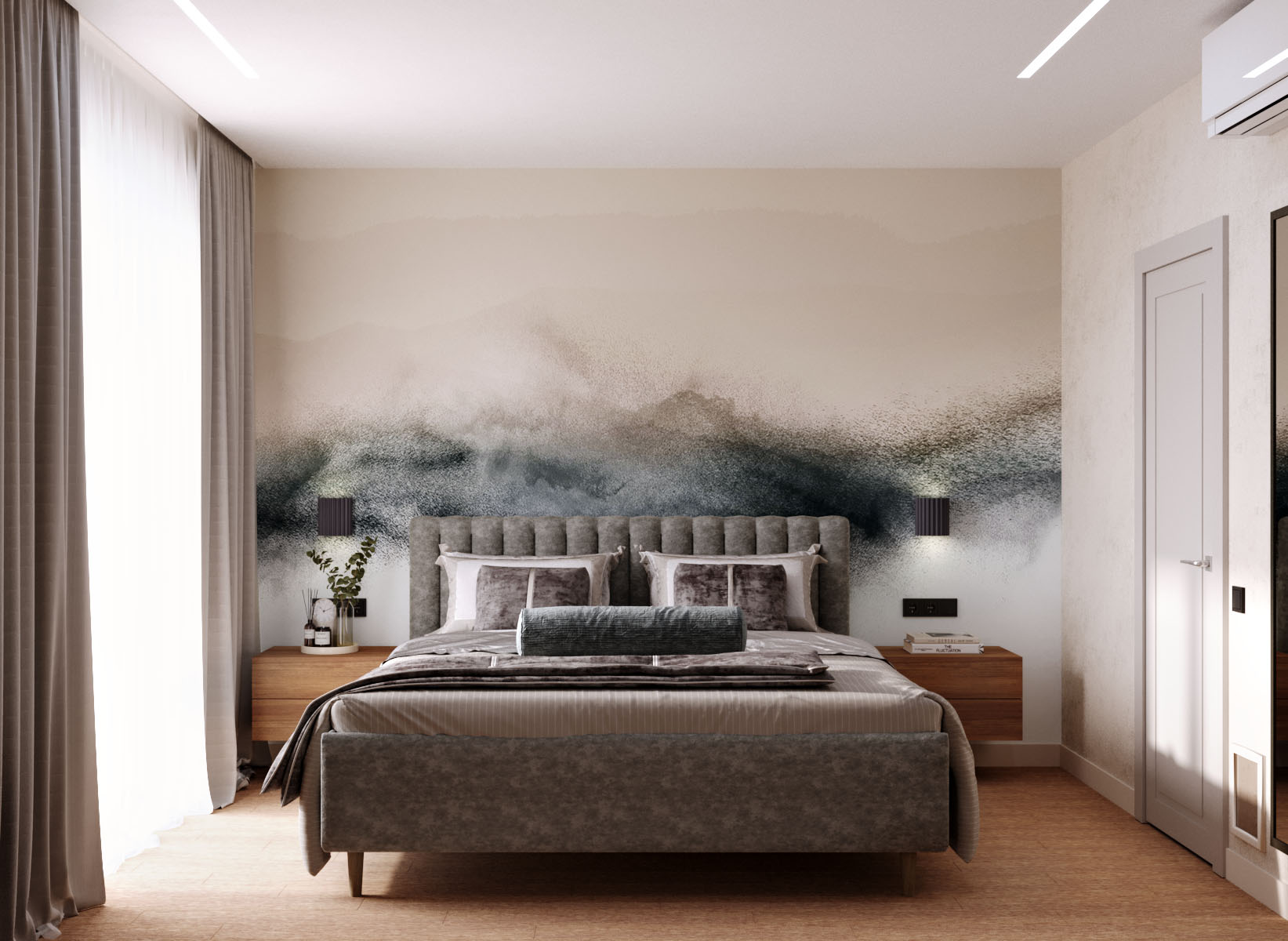 Спальня площадью 12,5 м² из проекта квартиры в зеленой зоне Академгородка, г. Новосибирск. Фреска из коллекции EUPHORIA отлично подхватила природные мотивы.