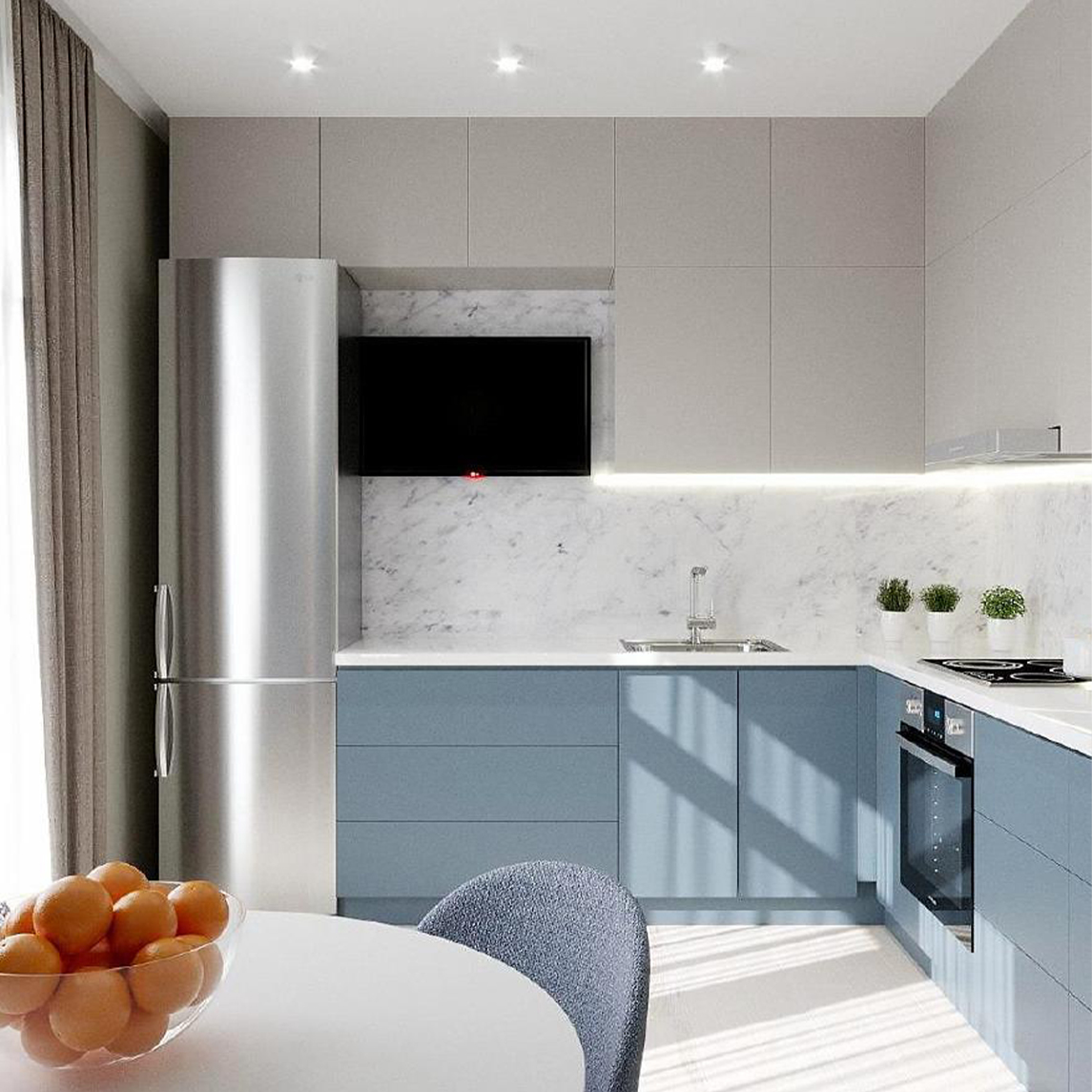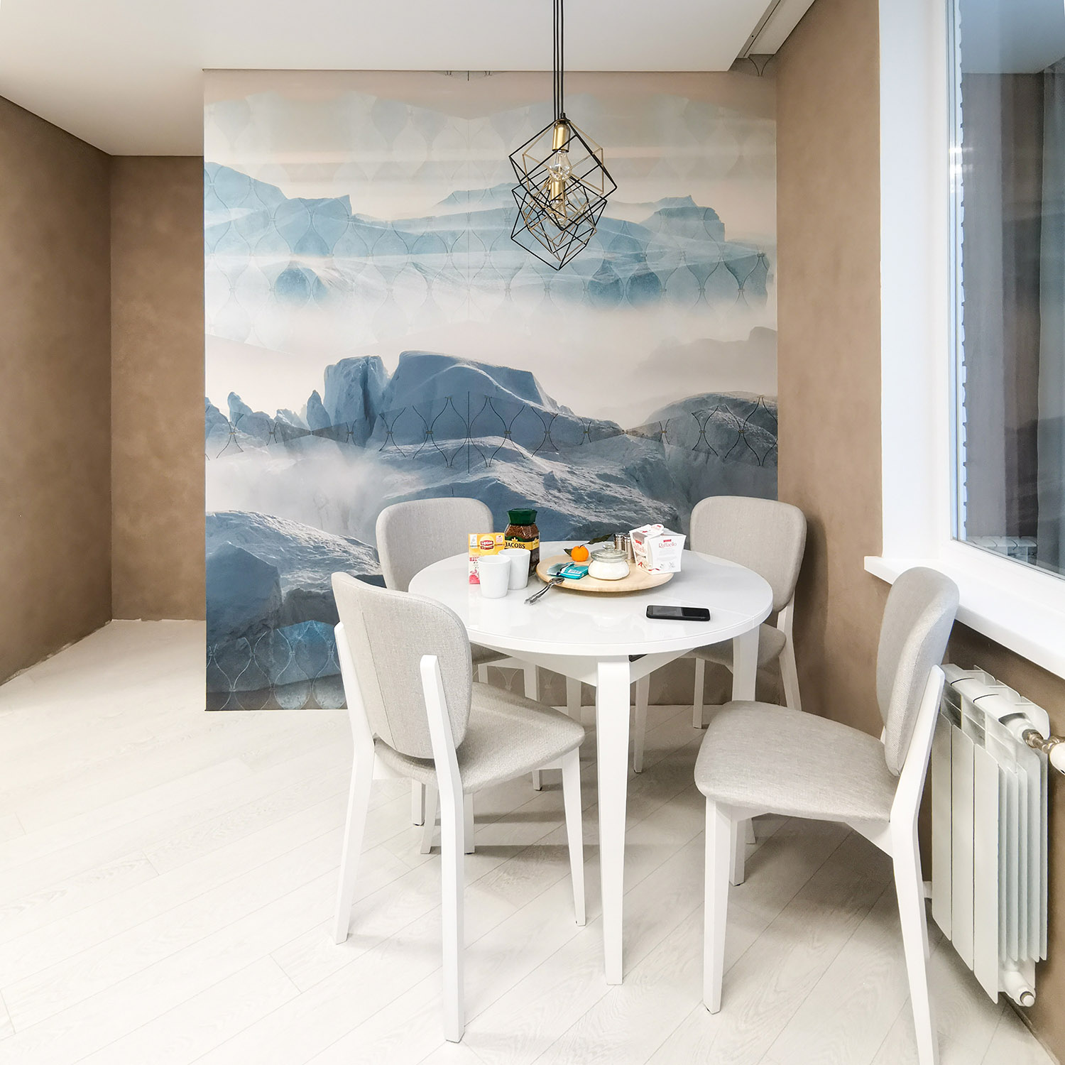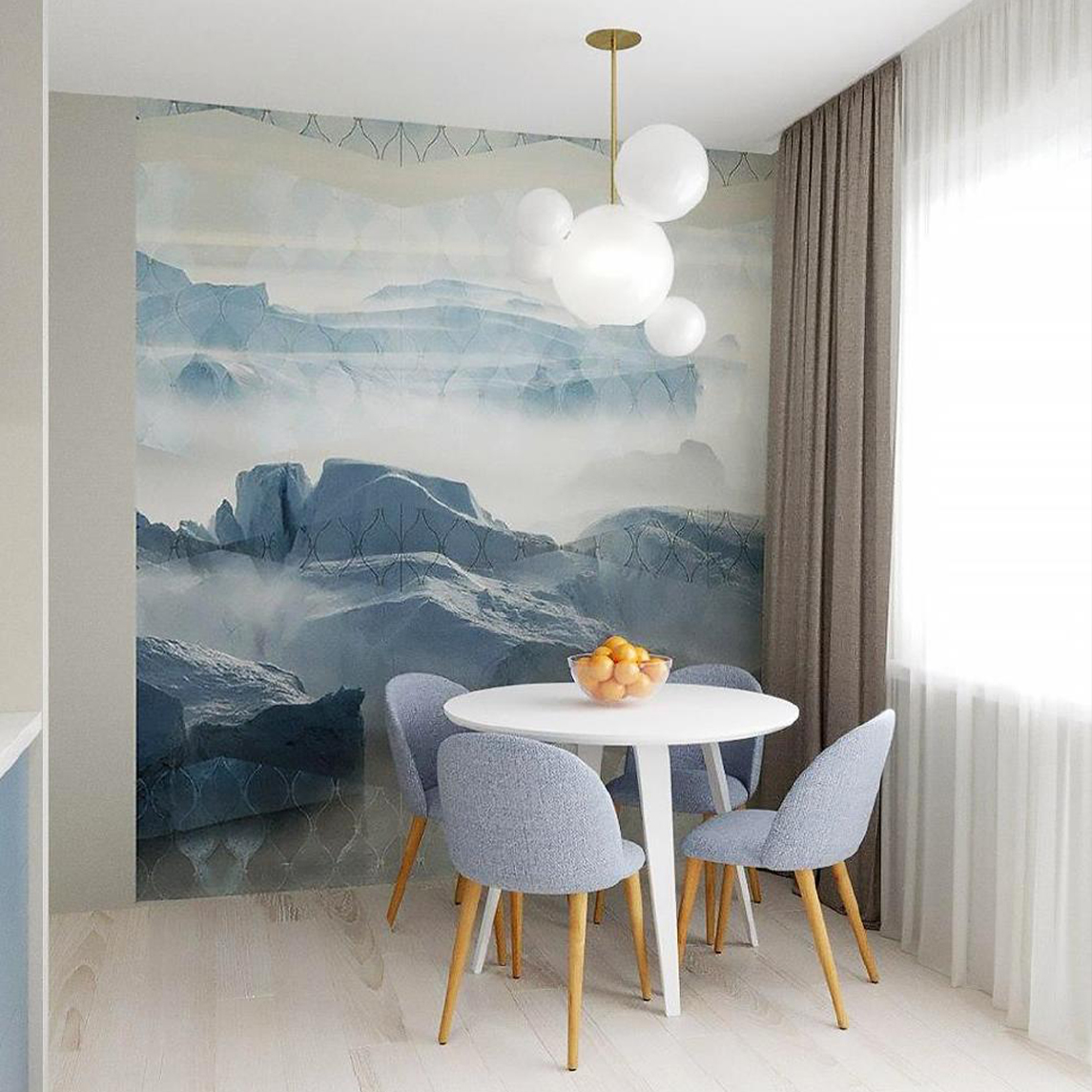 Кухня-гостиная для семьи из трех человек из Белгорода. В квартире будут жить мама, папа и сын-подросток. Заказчики хотели спокойный светлый интерьер и полностью доверились дизайнеру. Фреска из коллекции Euphoria определила цветовую гамму и помогла создать нужное настроение.