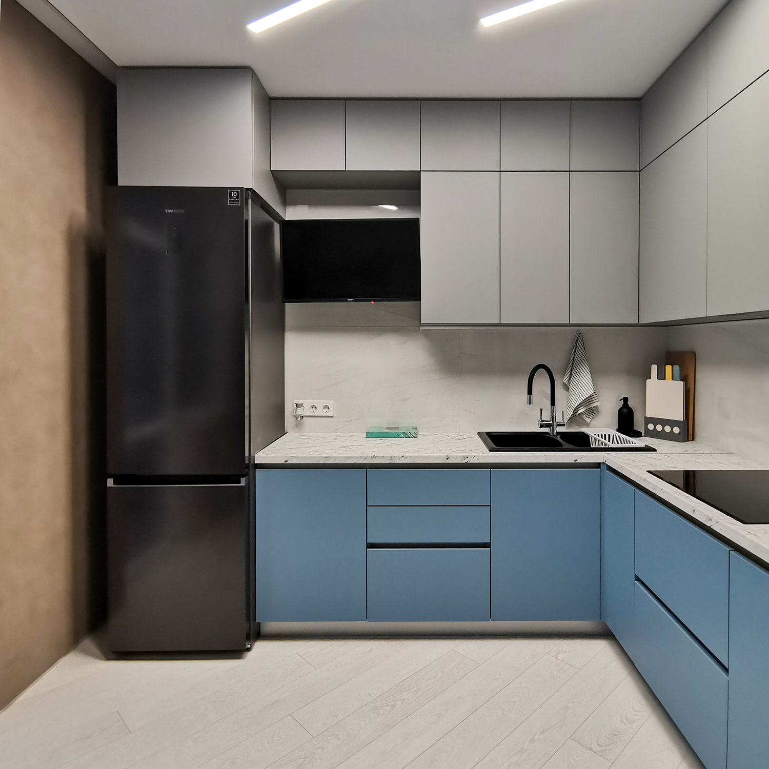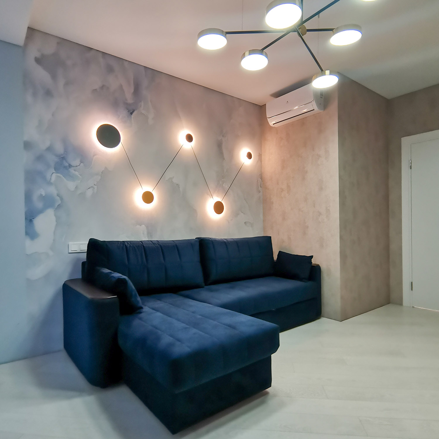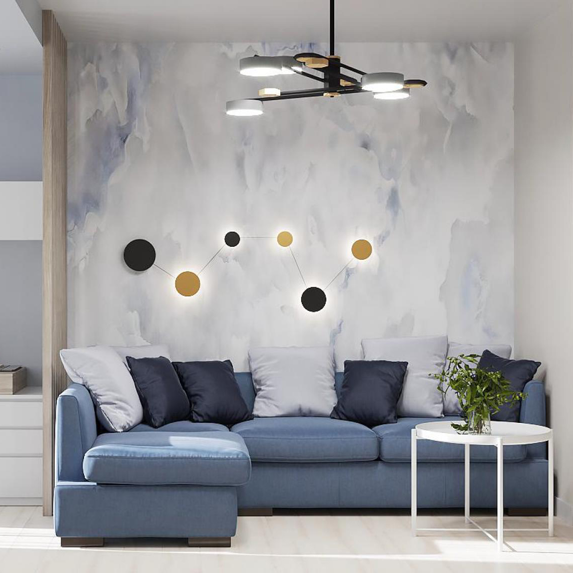 Кухня-гостиная для семьи из трех человек из Белгорода. В квартире будут жить мама, папа и сын-подросток. Заказчики хотели спокойный светлый интерьер и полностью доверились дизайнеру. Фреска из коллекции Euphoria определила цветовую гамму и помогла создать нужное настроение.