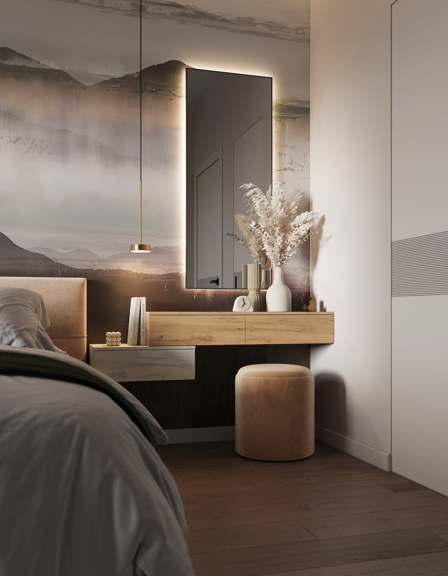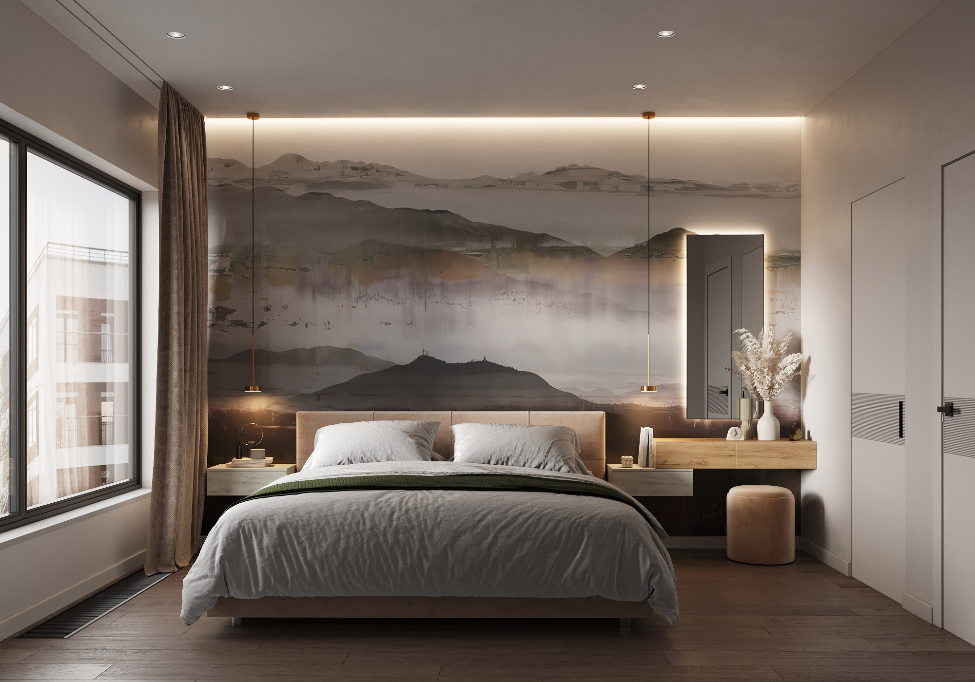 Дизайн-проект сделан для апартаментов под сдачу в Hiil 8. В зоне спальни стена за изголовьем кровати выделена обоями из коллекции Euphoria. В ней всё наполнено акварельной лёгкостью, и изображения расплываются, словно облака, рождающие свои личные образы. Что же там вдали? Горы? Города? Другая планета? Пусть ясность и конкретность подождёт. Насладитесь абстрактной неопределенностью образов этой удивительной коллекции.