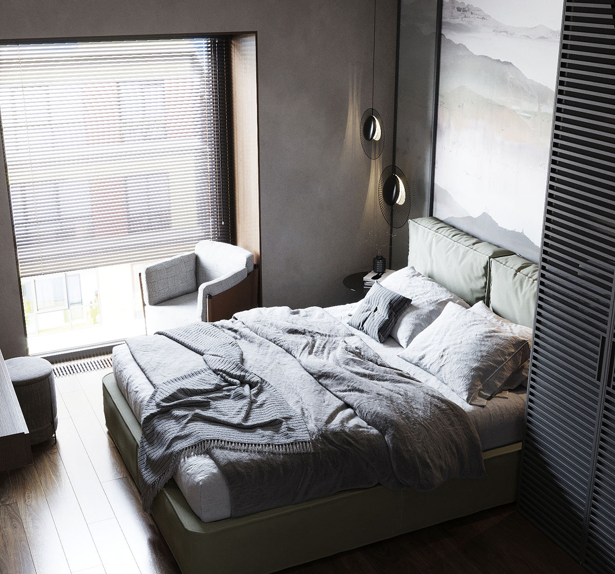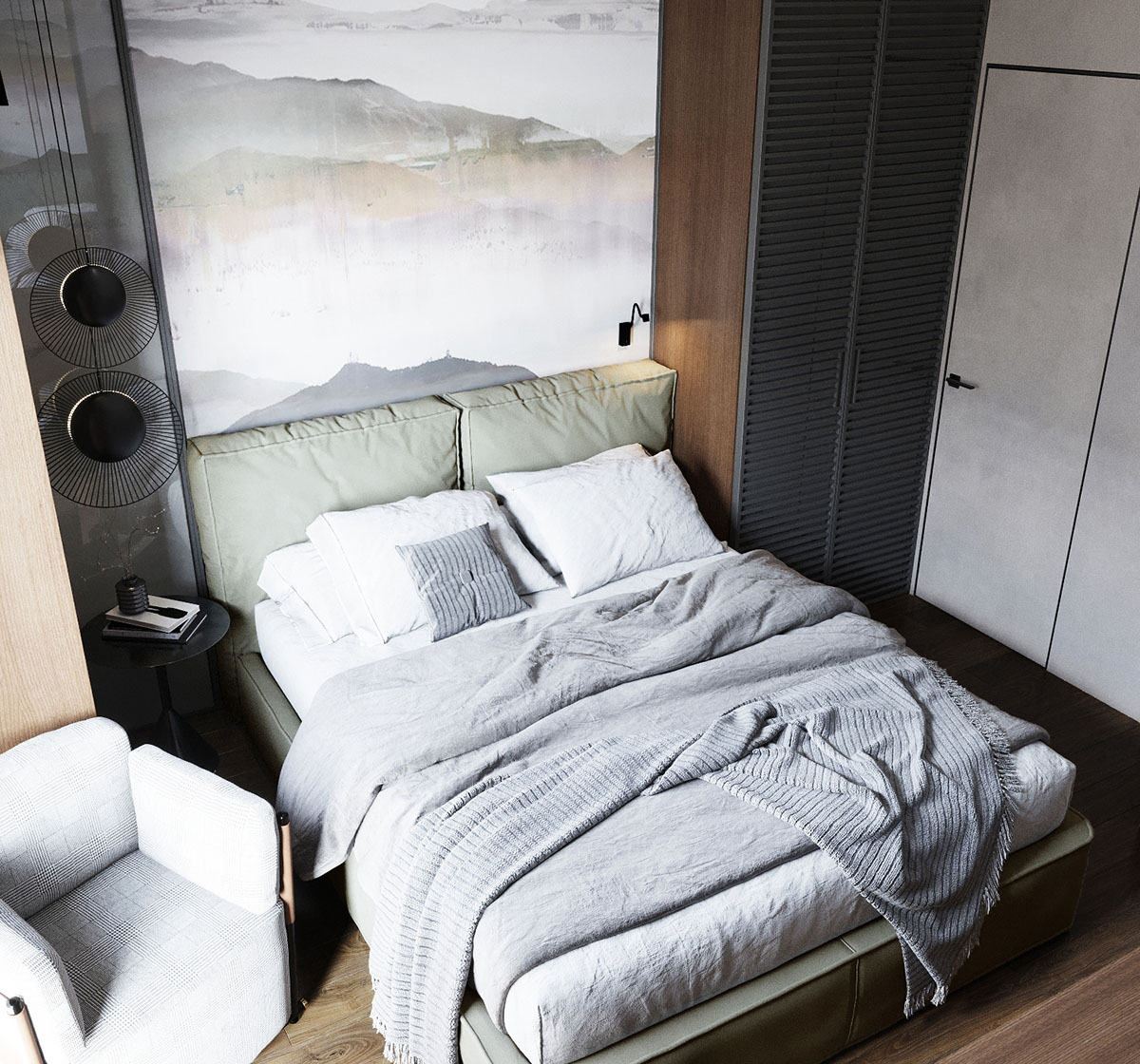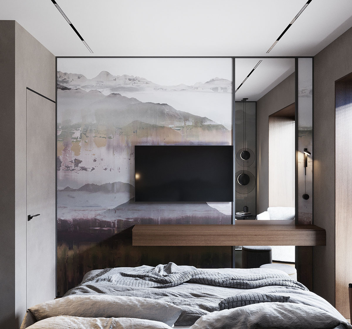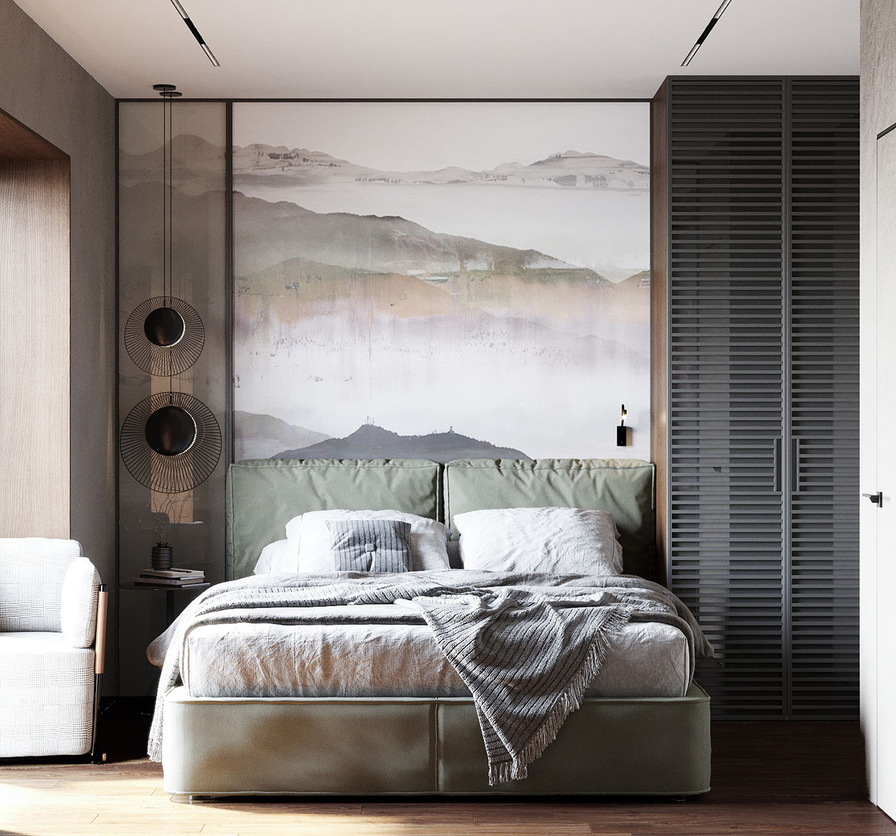 Перед вами мастер-спальня из проекта квартиры, расположенной в г. Москва. Площадь помещения — 12 м². Проект выполнялся для многодетной семьи. Данная хозяйская спальня решена в приятных приглушенных природных тонах, а основной визуальный акцент помещению придают стильные дизайнерские обои от студии Wall Street — коллекция EUPHORIA. Они особенно пришлись по душе хозяевам квартиры. Интерьер получился очень спокойным, умиротворяющим и располагающим к приятному времяпрепровождению.