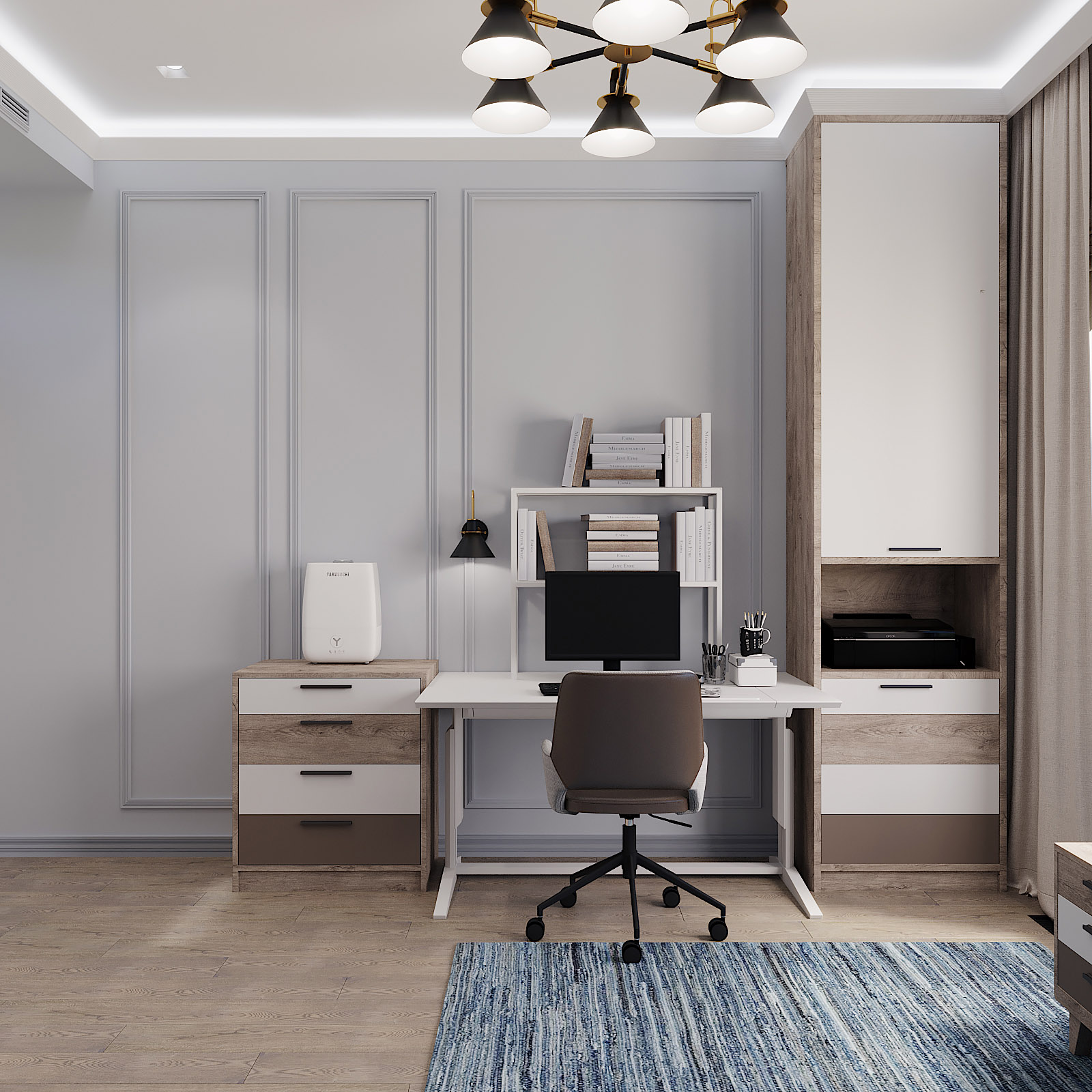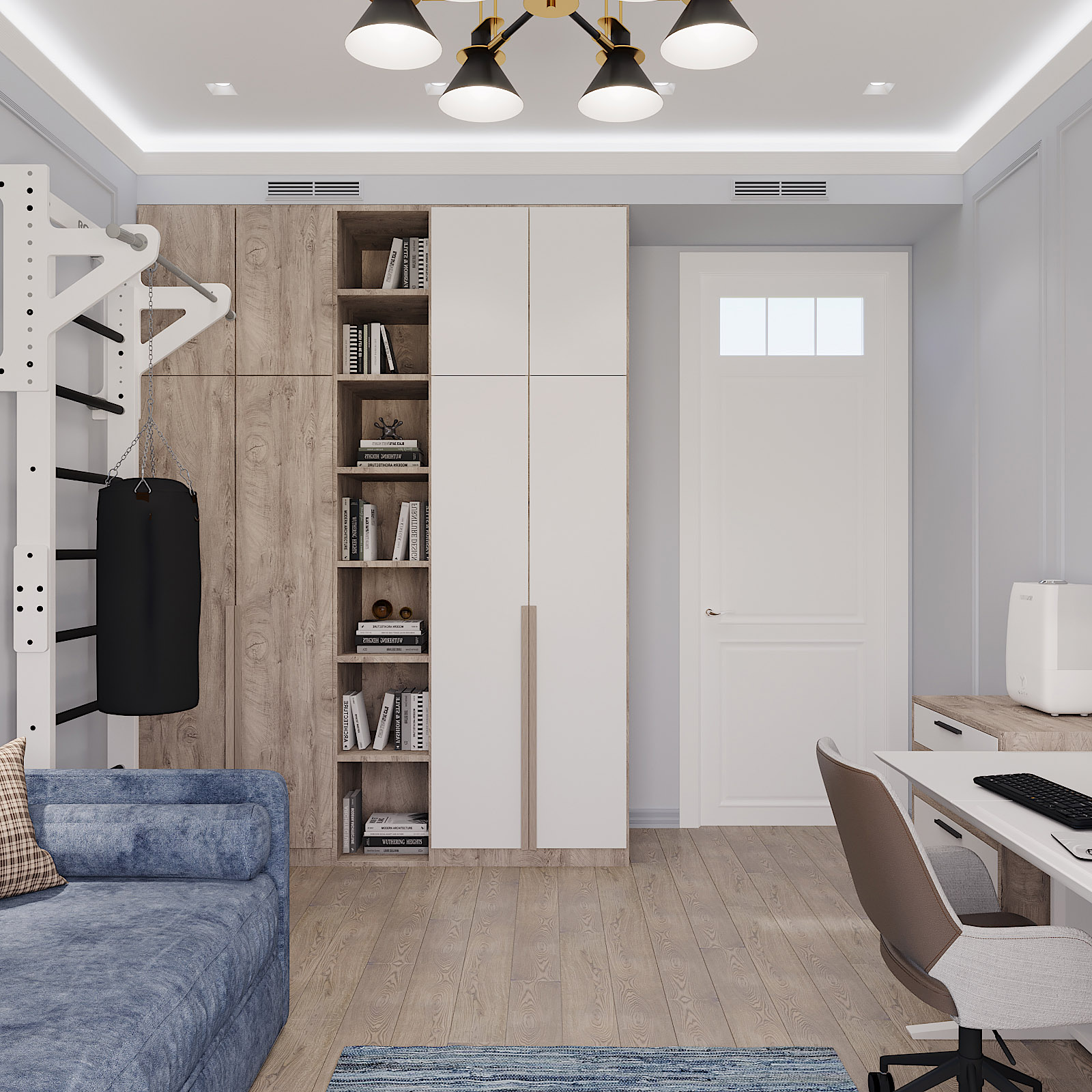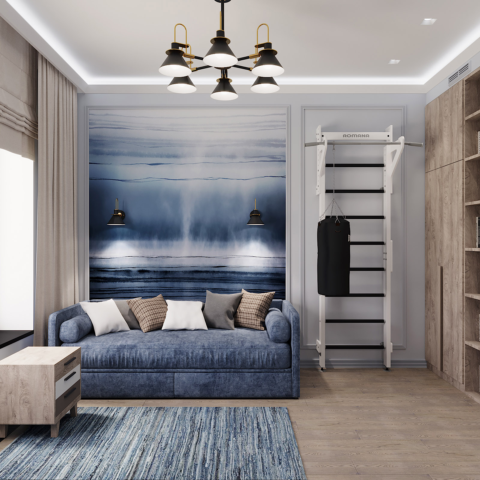 Проект комнаты подростка в ЖК «Джаз» для молодого студента, увлекающегося спортом. Площадь комнаты 14 м². Цветовое решение комнаты определили обои из коллекции «Euphoria», став отправной точкой всего проекта.