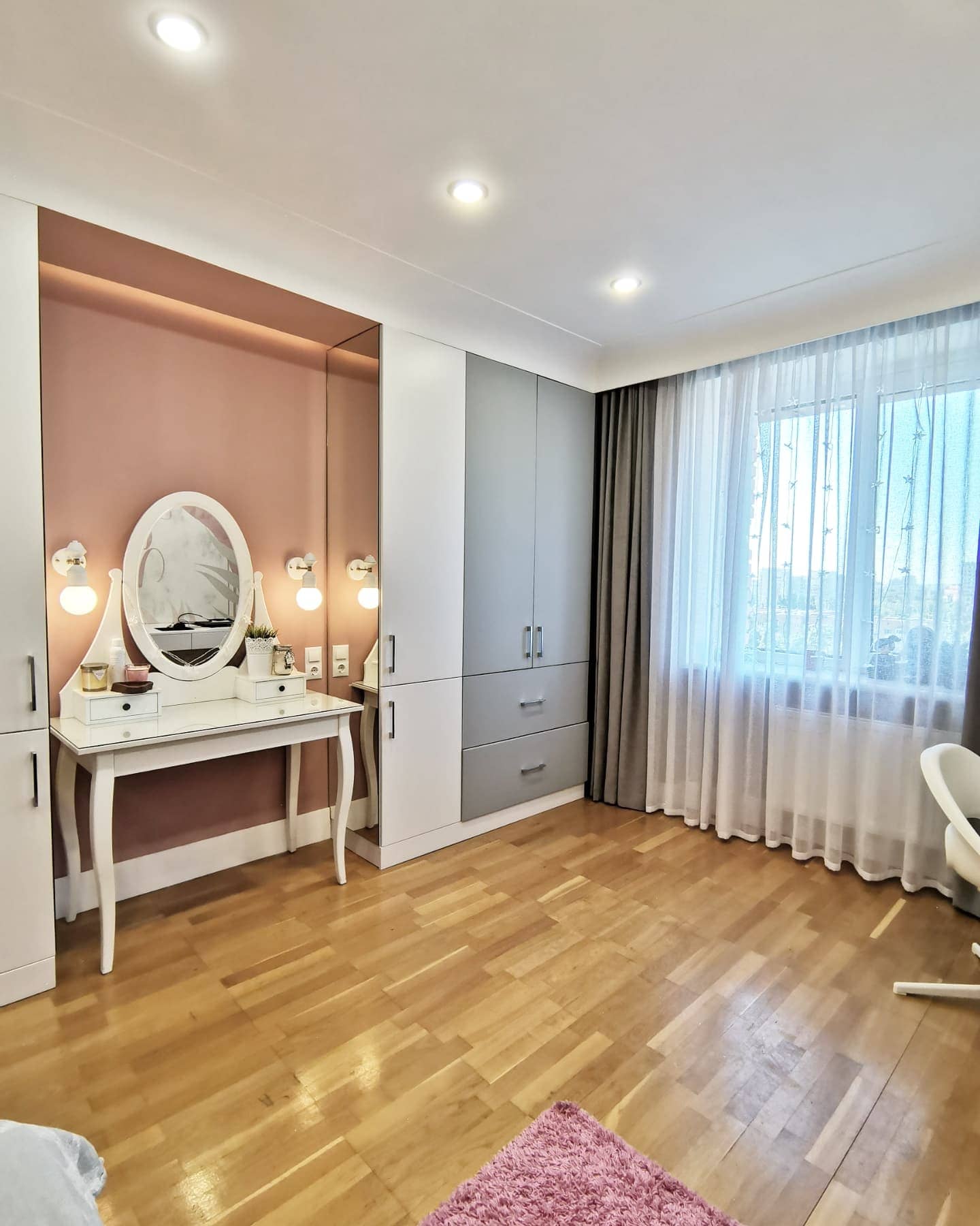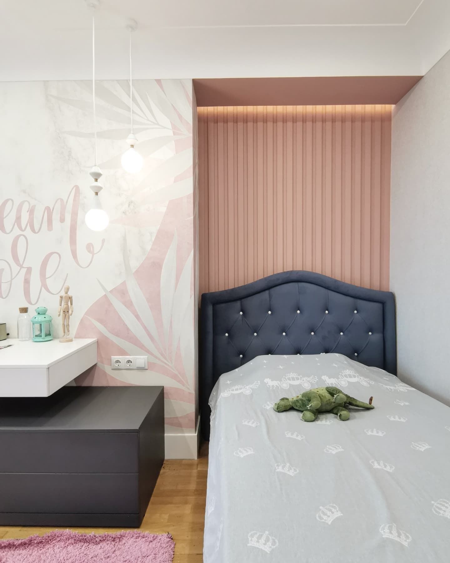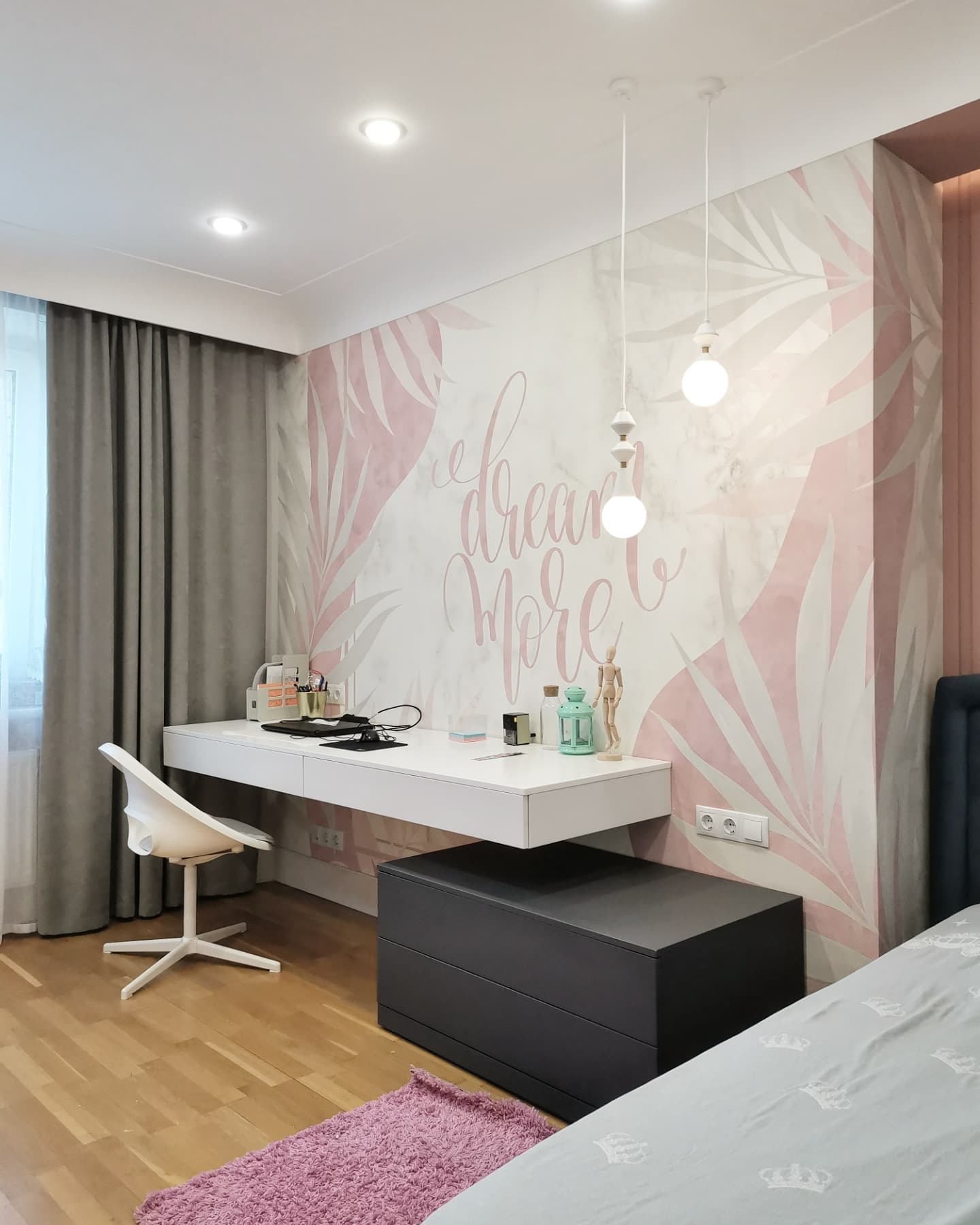 Интерьер комнаты для девочки-подростка, г. Тольятти. Площадь комнаты — 14,3 м². Реализация проекта шла согласно всем пожеланиям заказчиков. Из неизменного оставались полы, а всё остальное красили, меняли, клеили. Серые и пудровые оттенки в отделке отлично подчеркнули обои Exquisito, а разбавила всё это черничная кровать в каретной стяжке. Заказчики остались полностью довольны результатом и уже давно обжили этот интерьер!