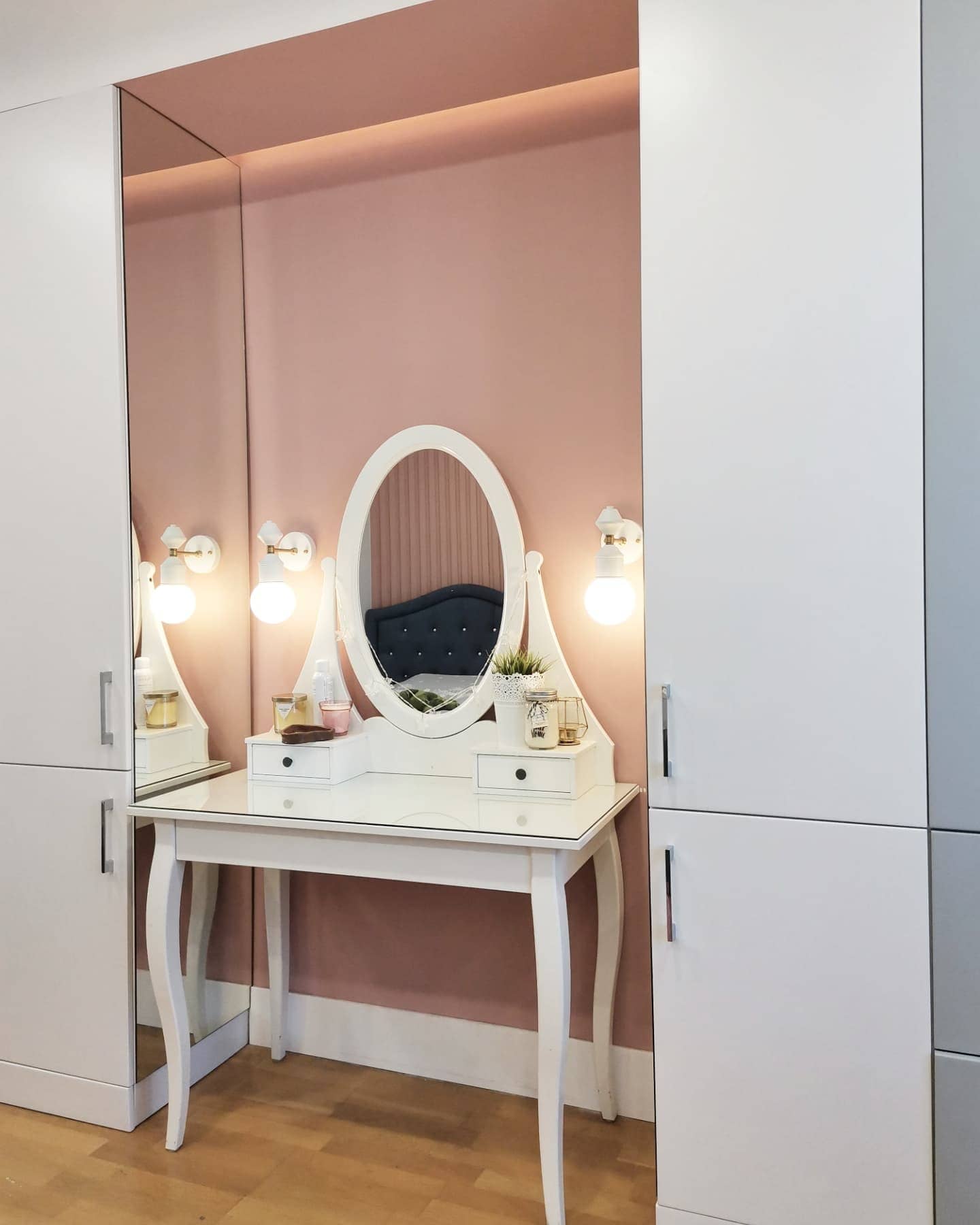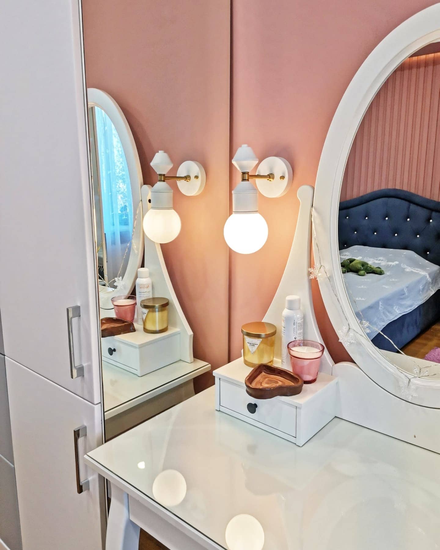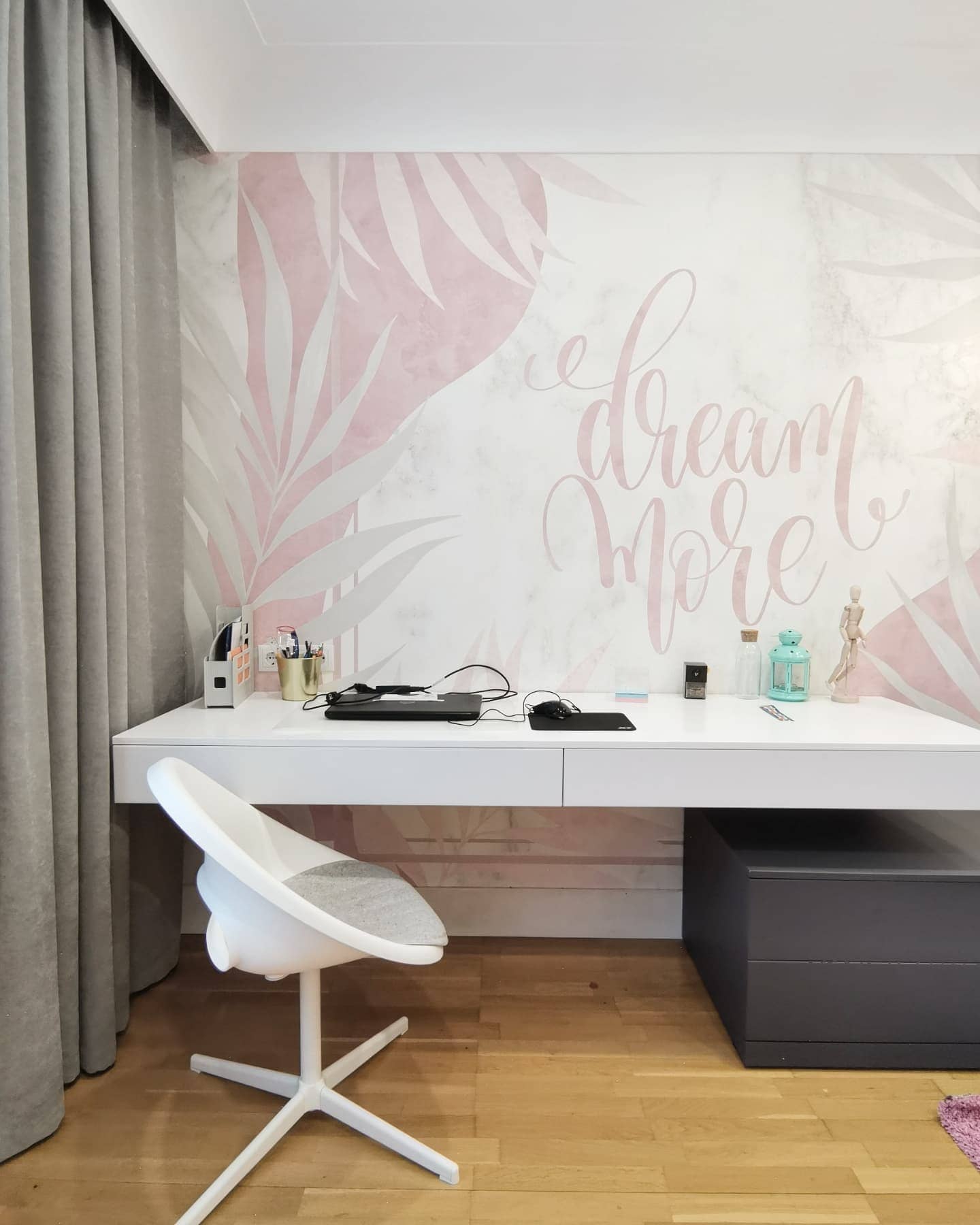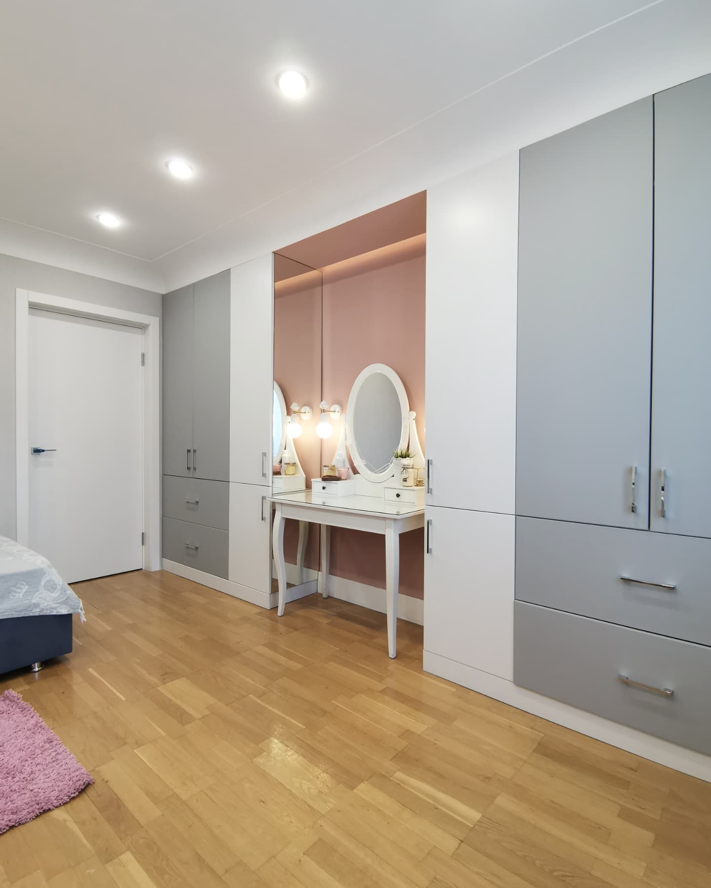 Интерьер комнаты для девочки-подростка, г. Тольятти. Площадь комнаты — 14,3 м². Реализация проекта шла согласно всем пожеланиям заказчиков. Из неизменного оставались полы, а всё остальное красили, меняли, клеили. Серые и пудровые оттенки в отделке отлично подчеркнули обои Exquisito, а разбавила всё это черничная кровать в каретной стяжке. Заказчики остались полностью довольны результатом и уже давно обжили этот интерьер!