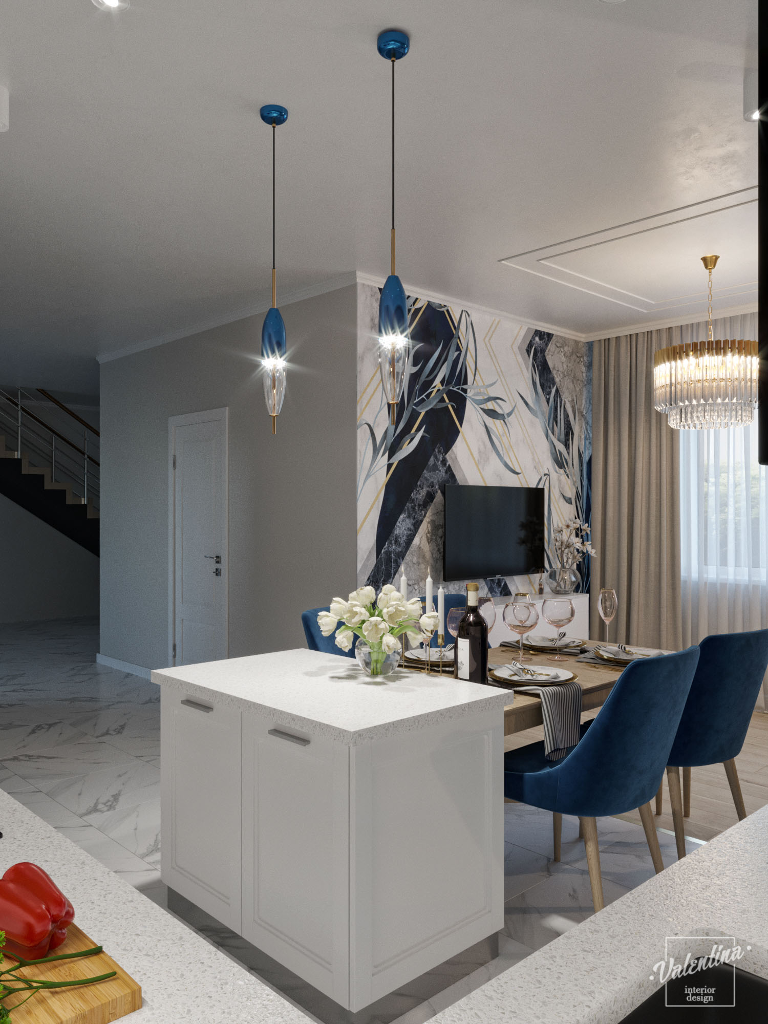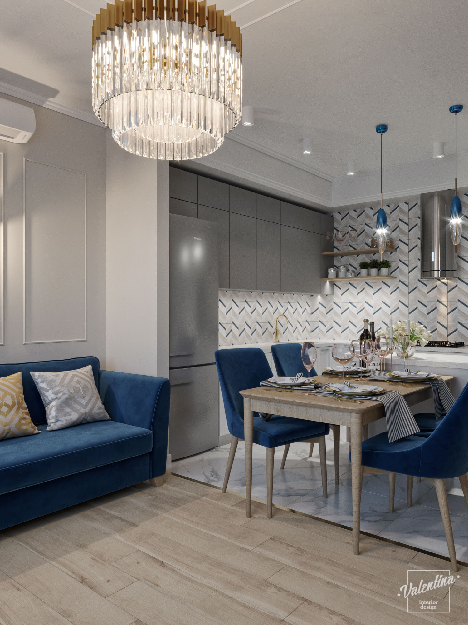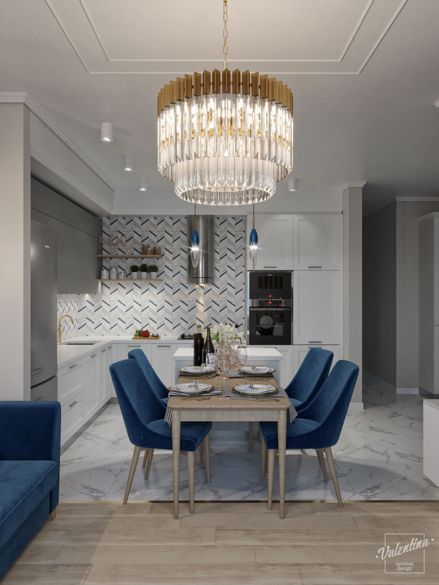 Проект дома разработали в бело-синей гамме и добавили теплое дерево. И в кухне отлично вписались обои с синим акцентом «Exquisito». Дом для молодой семьи. Здесь будут собираться на праздники, а хозяйка дома будет отдыхать. По этой причине диван предназначается только для хозяйки и ее подруг.