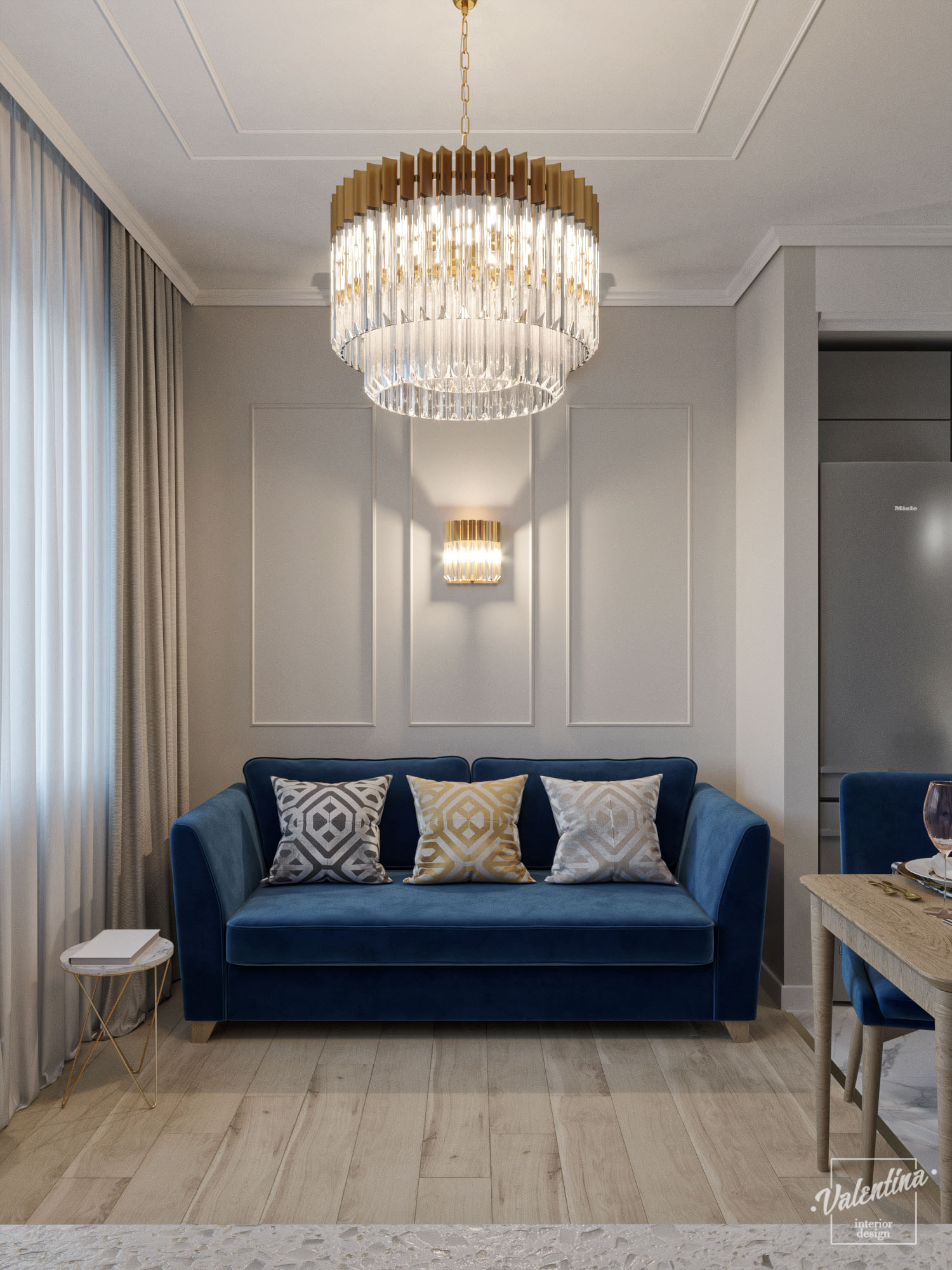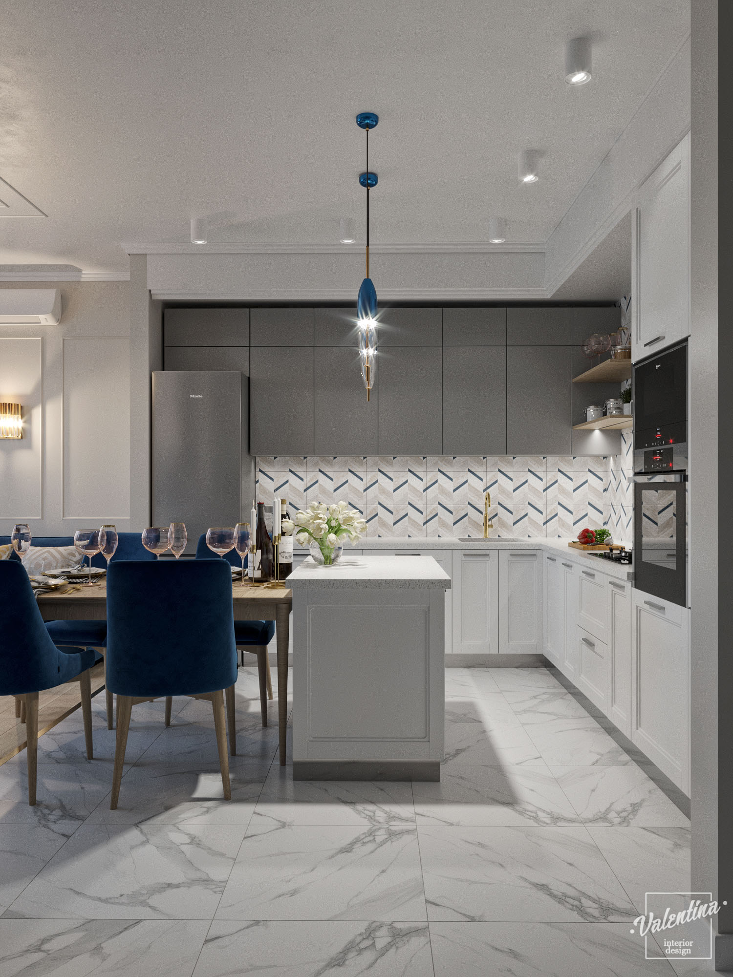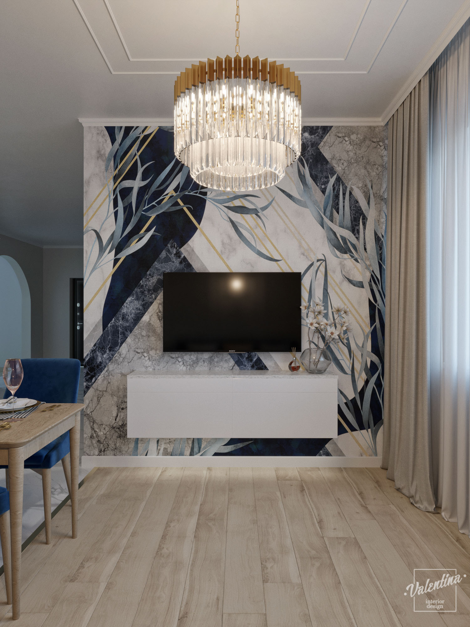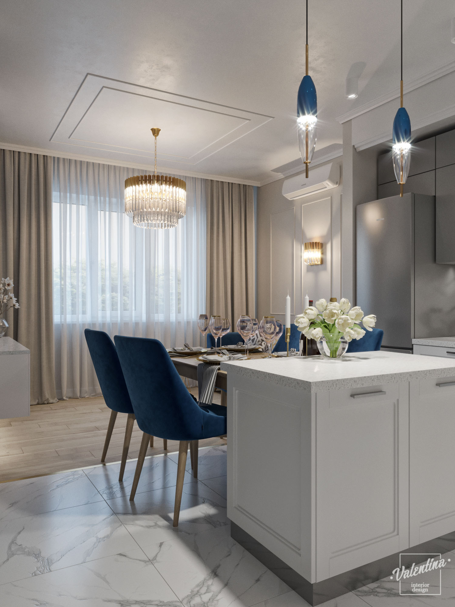 Проект дома разработали в бело-синей гамме и добавили теплое дерево. И в кухне отлично вписались обои с синим акцентом «Exquisito». Дом для молодой семьи. Здесь будут собираться на праздники, а хозяйка дома будет отдыхать. По этой причине диван предназначается только для хозяйки и ее подруг.