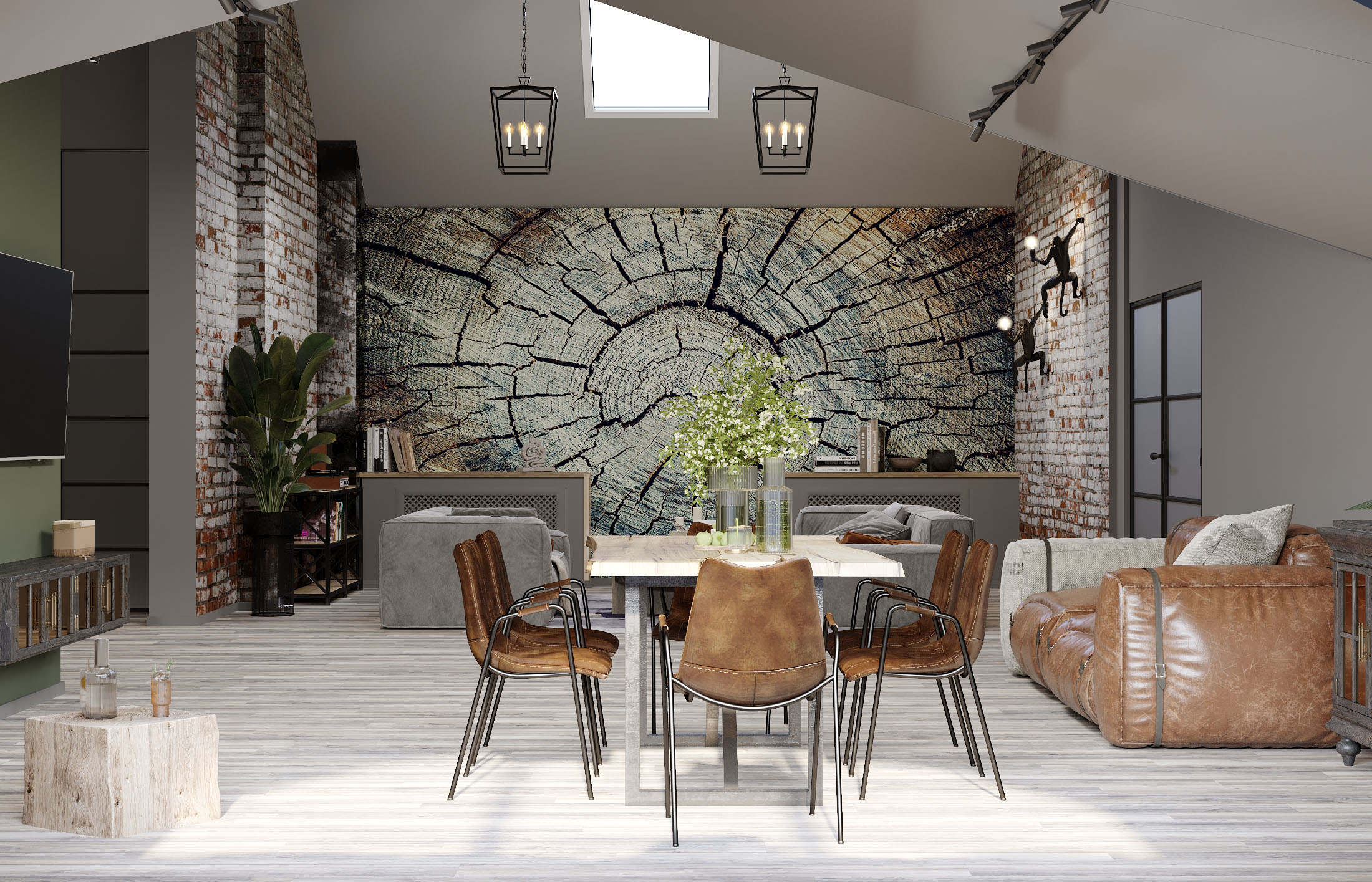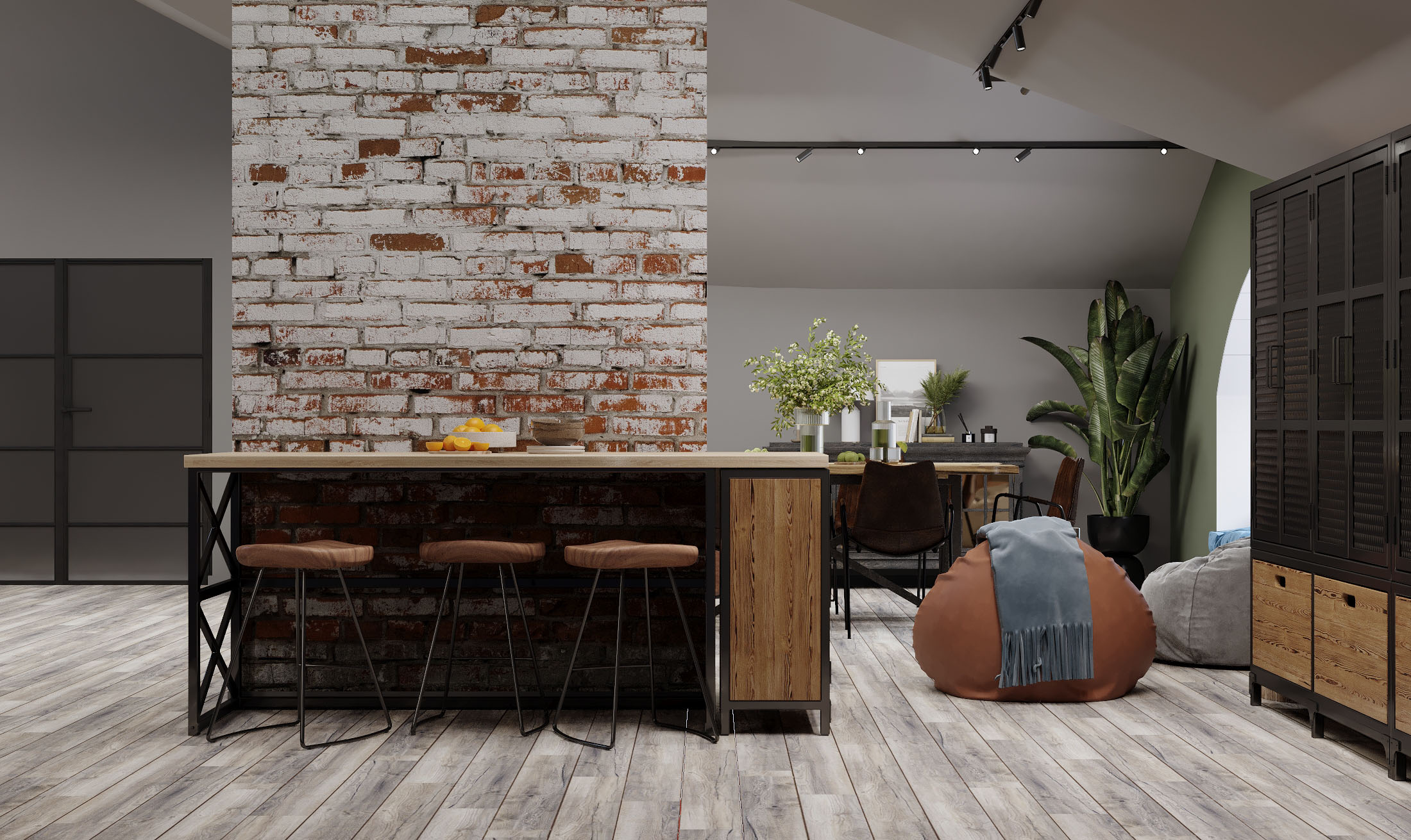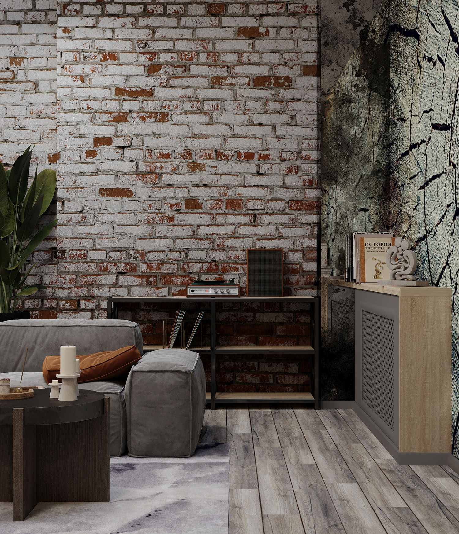 Кухня-гостиная на мансардном этаже. Обои из коллекции «Faktura». В этой коллекции сошлись бетон и камень, холодный мрамор и теплое дерево, высокое искусство и уличные рисунки. Дизайнеры наполнили коллекцию Faktura невероятно стильными изображениями в приятной цветовой гамме. Принты настолько реалистичные, что хочется провести по ним рукой и ощутить текстуру.