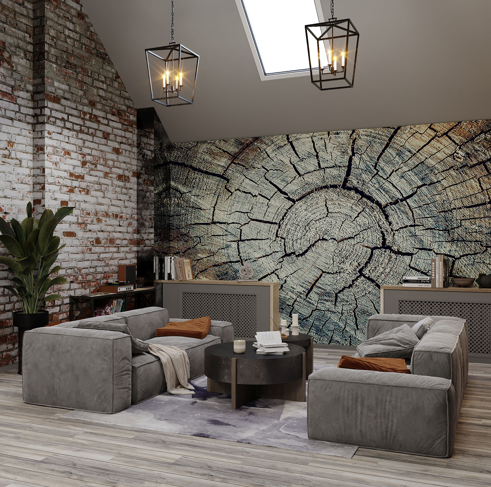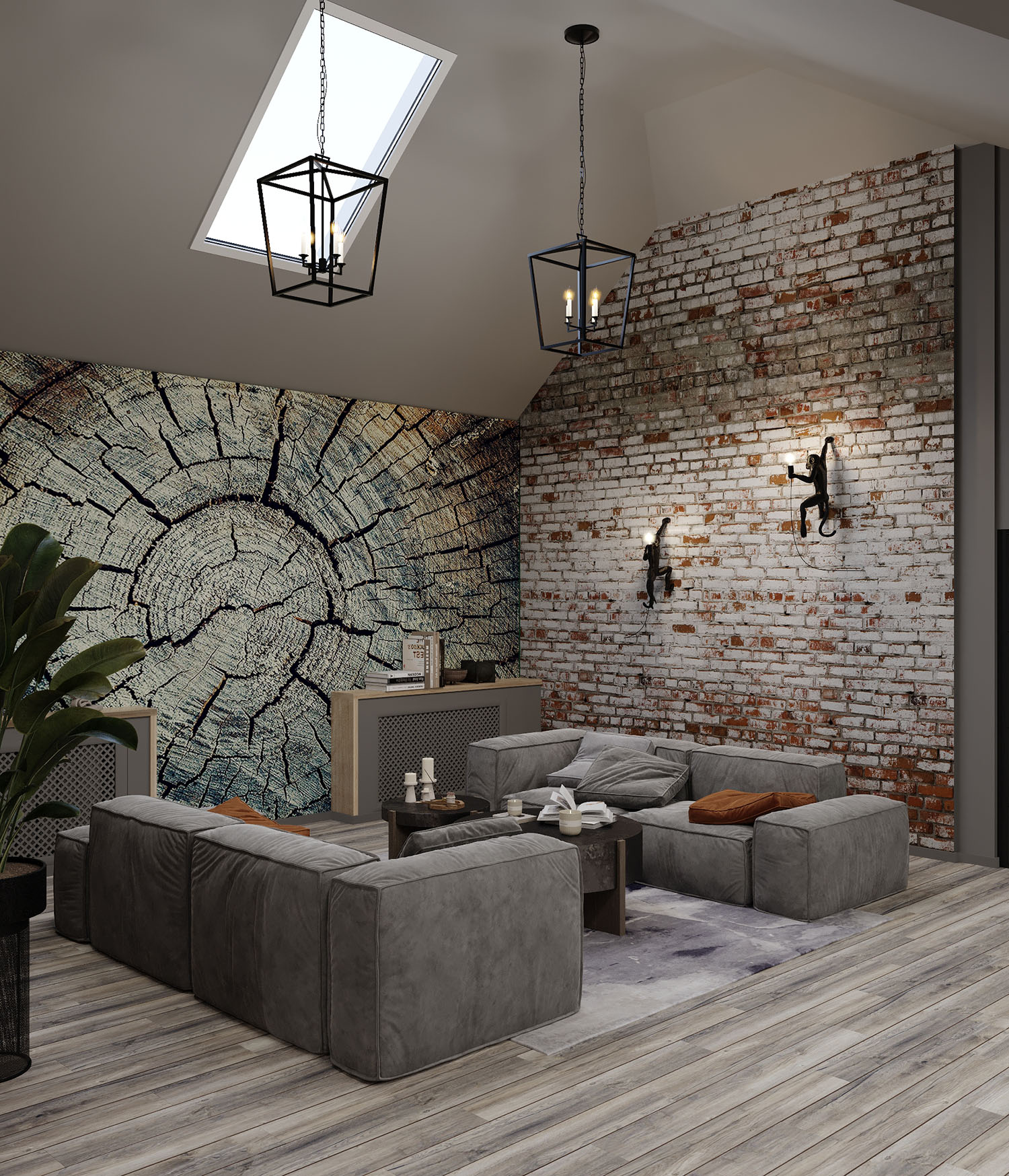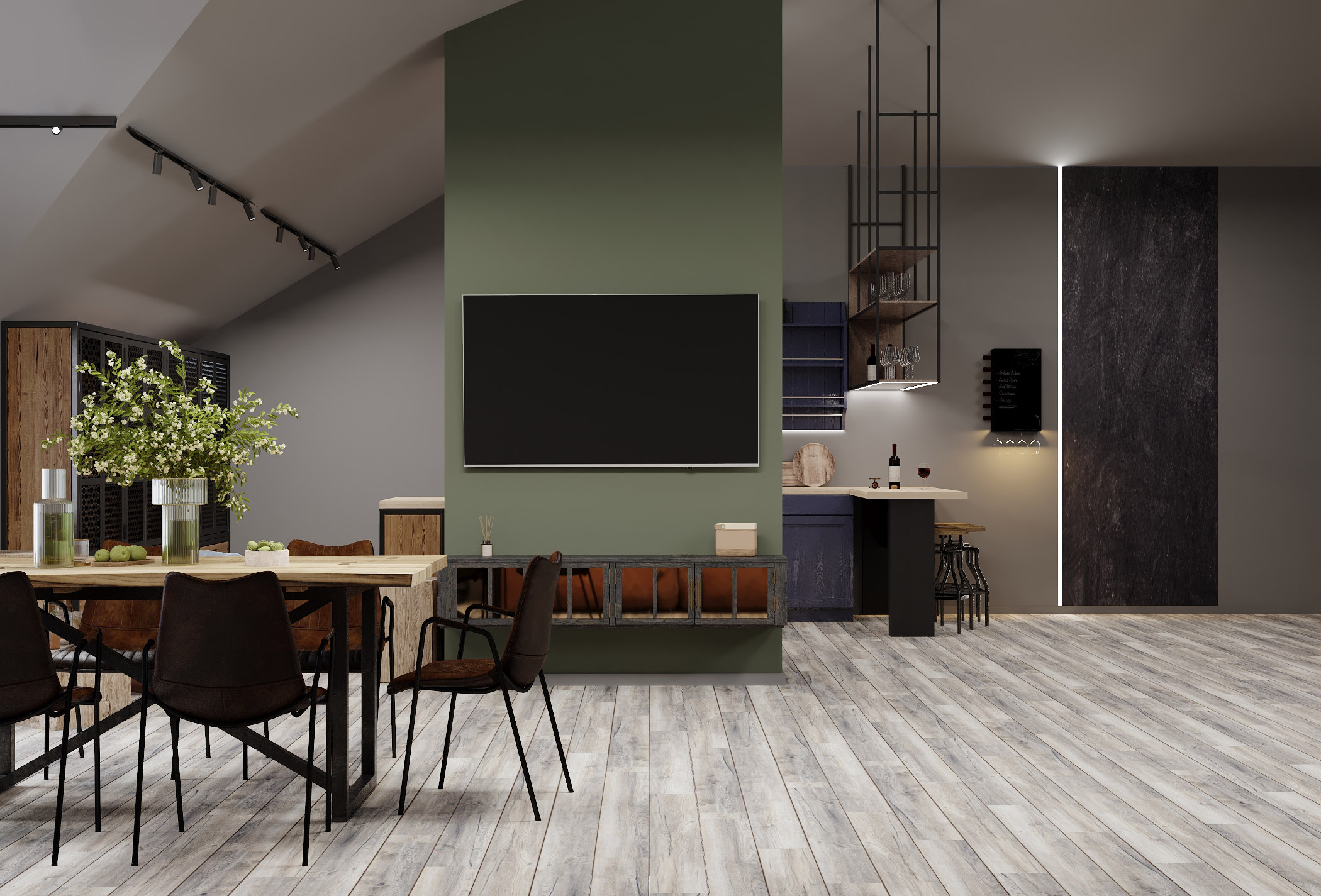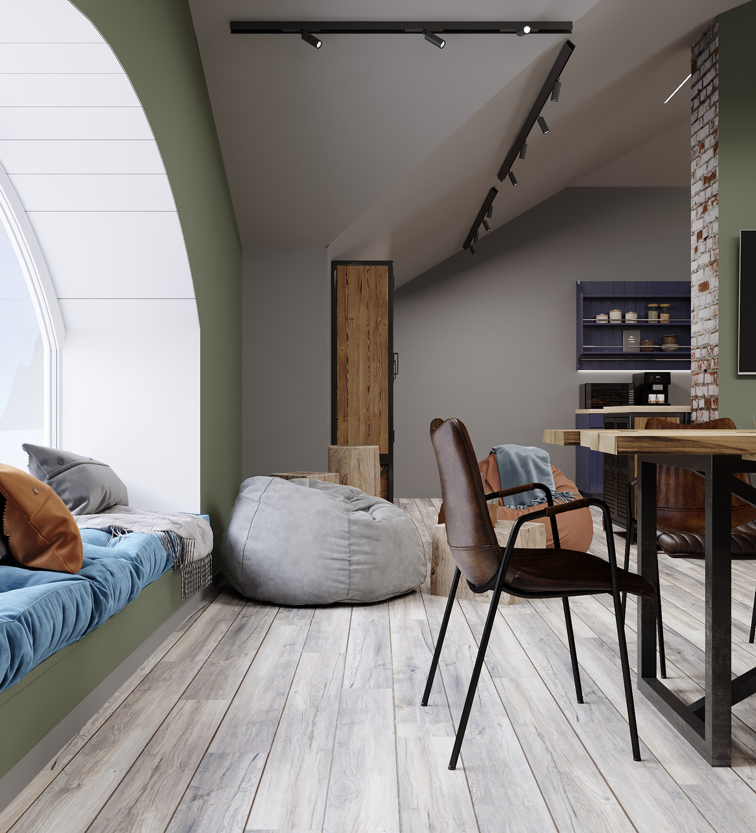 Кухня-гостиная на мансардном этаже. Обои из коллекции «Faktura». В этой коллекции сошлись бетон и камень, холодный мрамор и теплое дерево, высокое искусство и уличные рисунки. Дизайнеры наполнили коллекцию Faktura невероятно стильными изображениями в приятной цветовой гамме. Принты настолько реалистичные, что хочется провести по ним рукой и ощутить текстуру.
