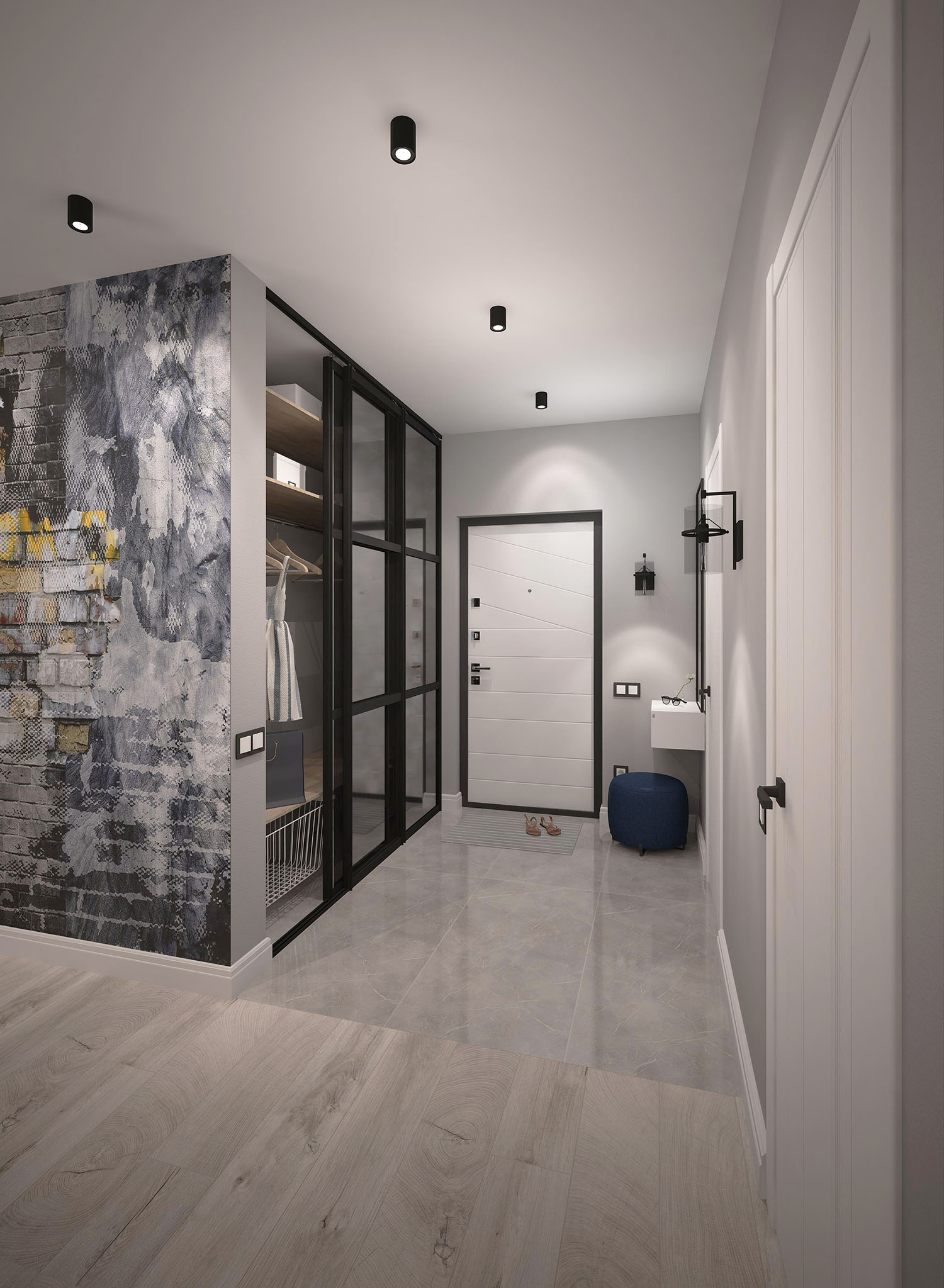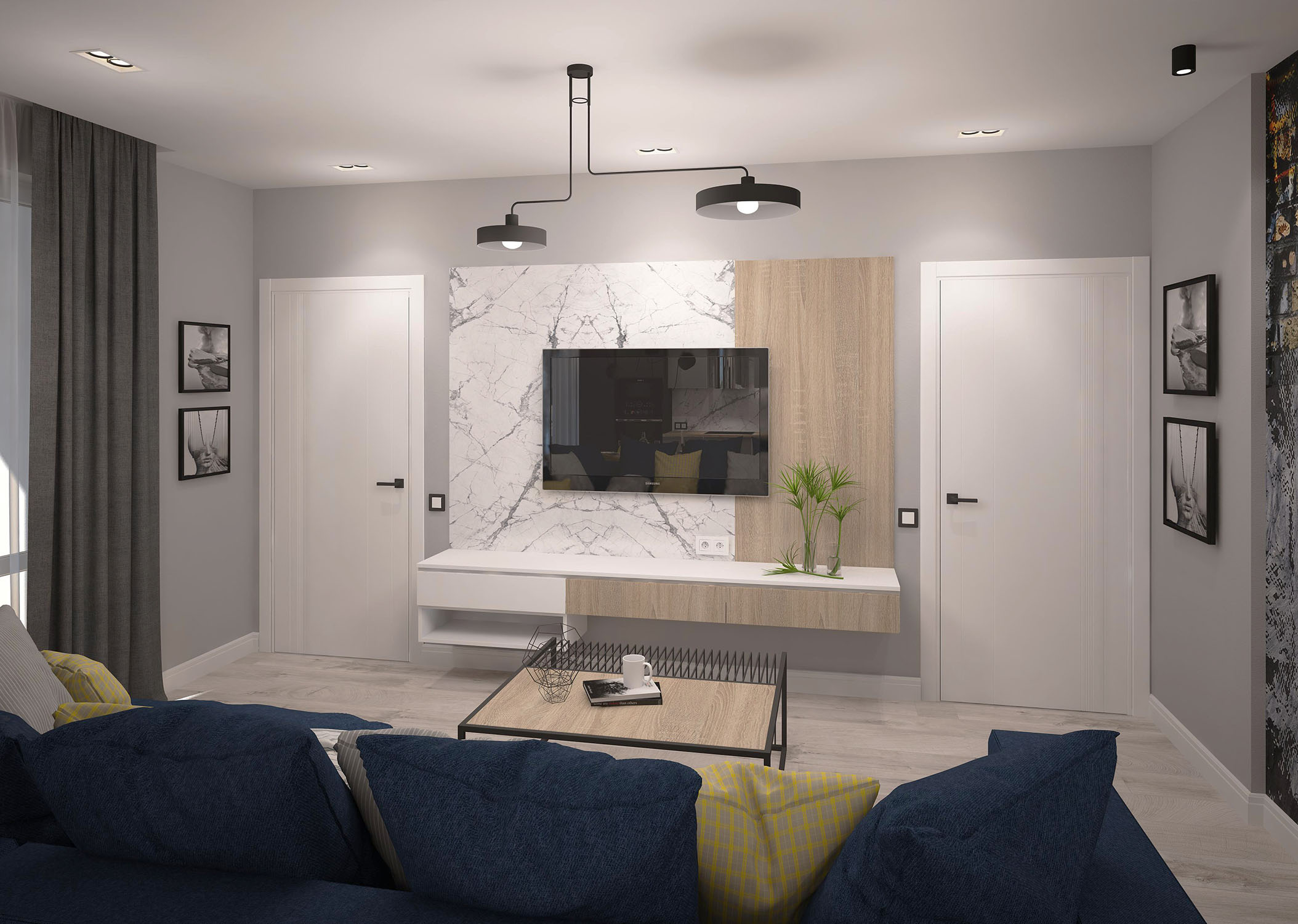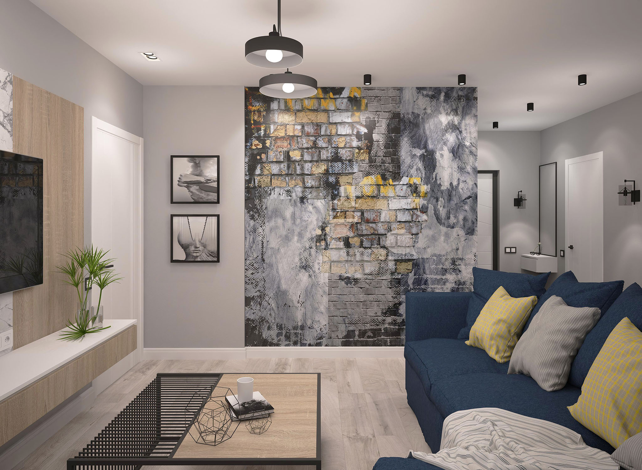 Кухня-гостиная из проекта трехкомнатной квартиры в Пензе для активной молодой пары, любящей спорт и отдых с друзьями. Ребята хотели современную гостиную для посиделок большой компанией. Когда дизайнер предложил вариант с активной серо-желтой стеной и фреской — идея зашла на ура!