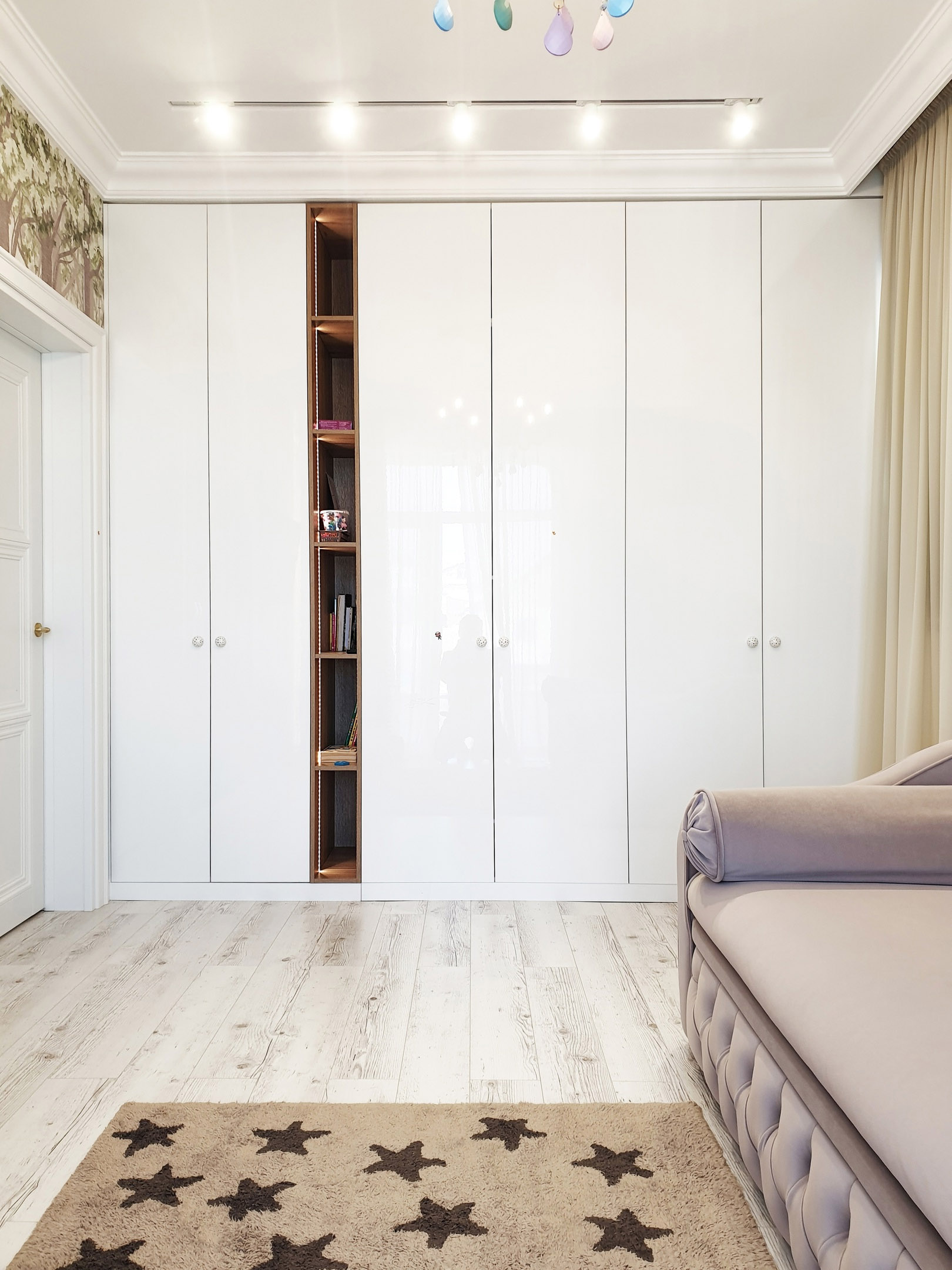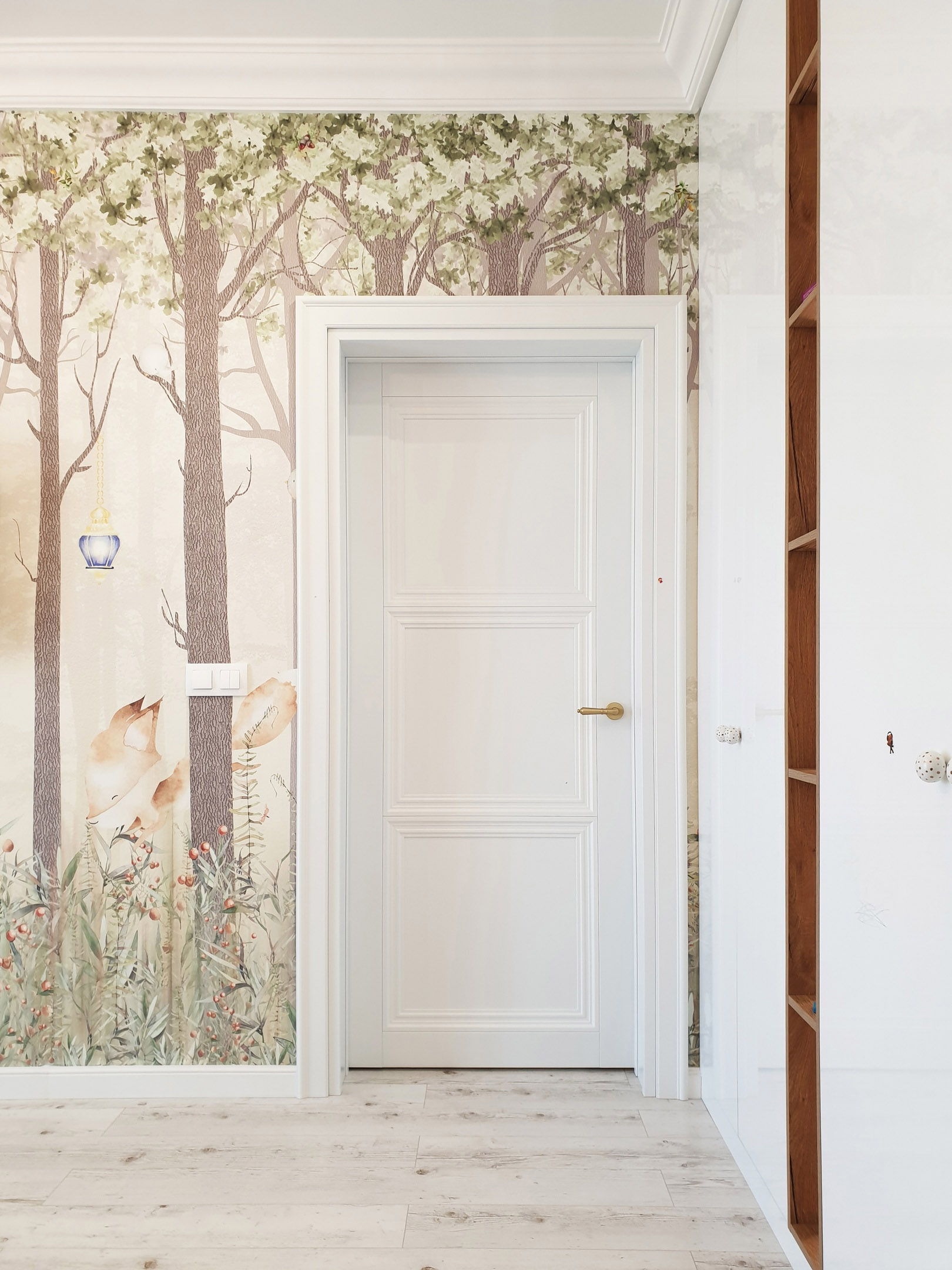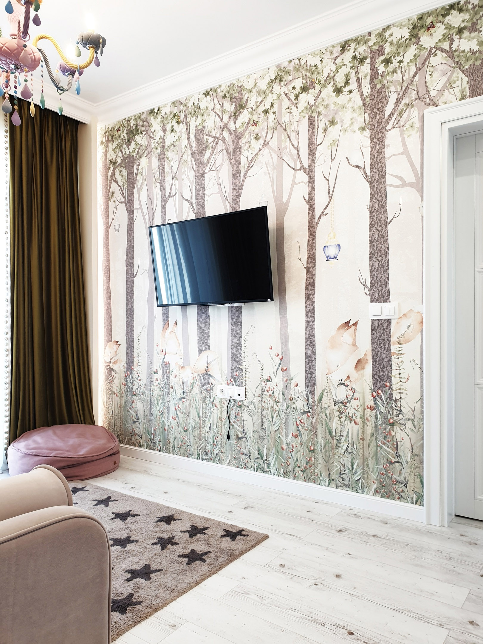 Детская игровая комната для девочки в коттедже по ул. Солнечная, г. Ханты-Мансийск. Обои из коллекции «Fairy Foxes». Каждый родитель хочет, чтобы их детей окружало всё самое лучшее. Коллекция Fairy Foxes, созданная с большой любовью и отрисованная вручную в акварельной технике, будет радовать и увлекать малышей своей историей. Загляните в гости к сказке, чтобы подружиться с маленькими волшебными персонажами, которые обитают в нашем сказочном лесу!