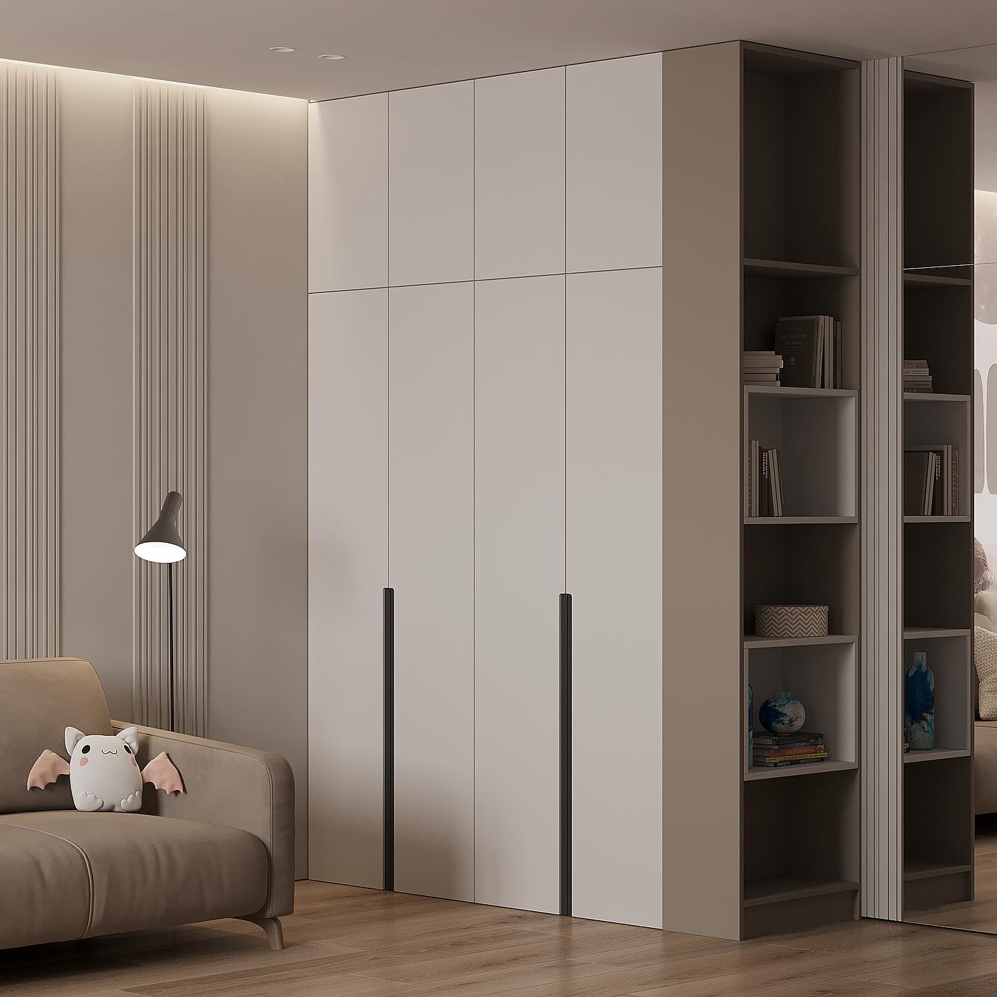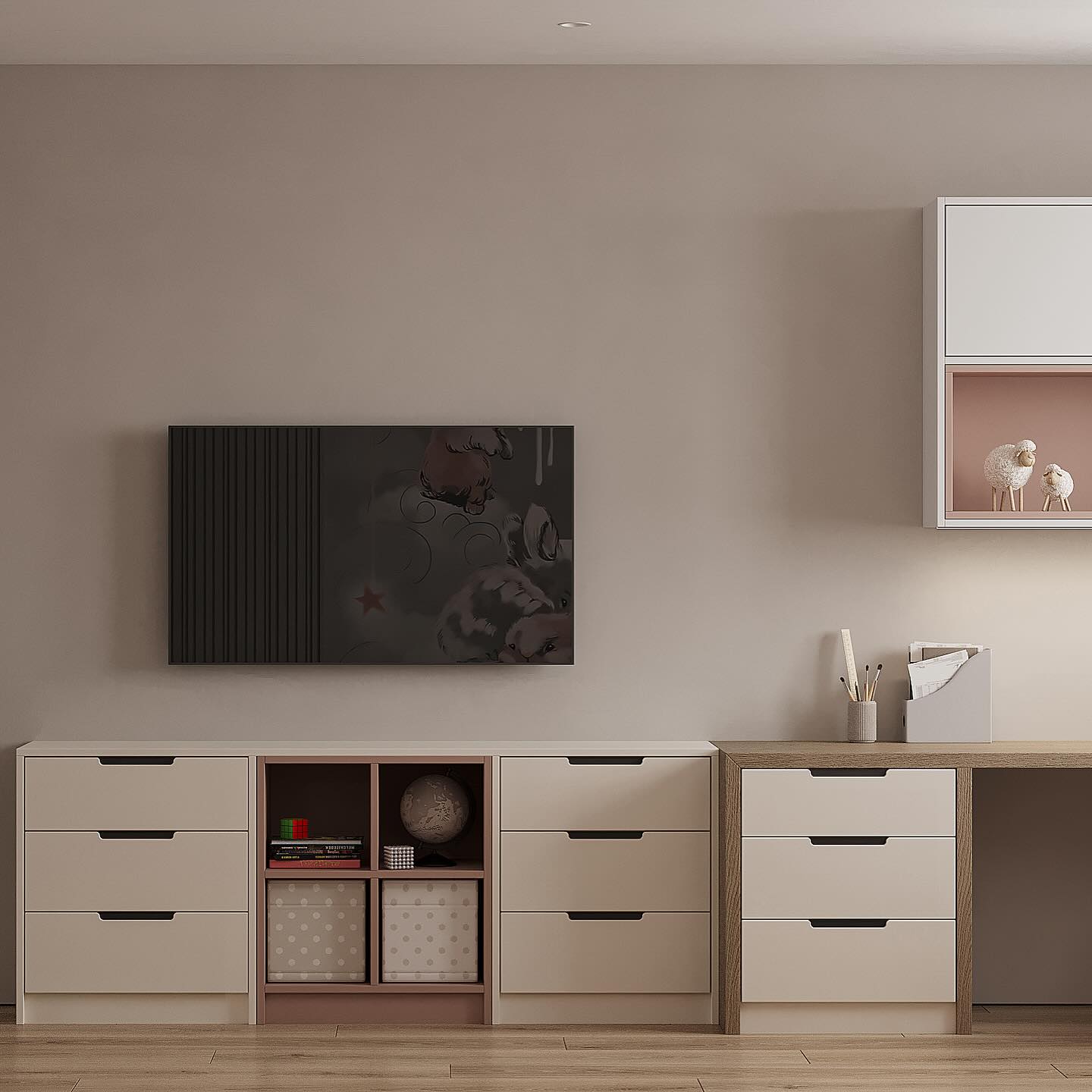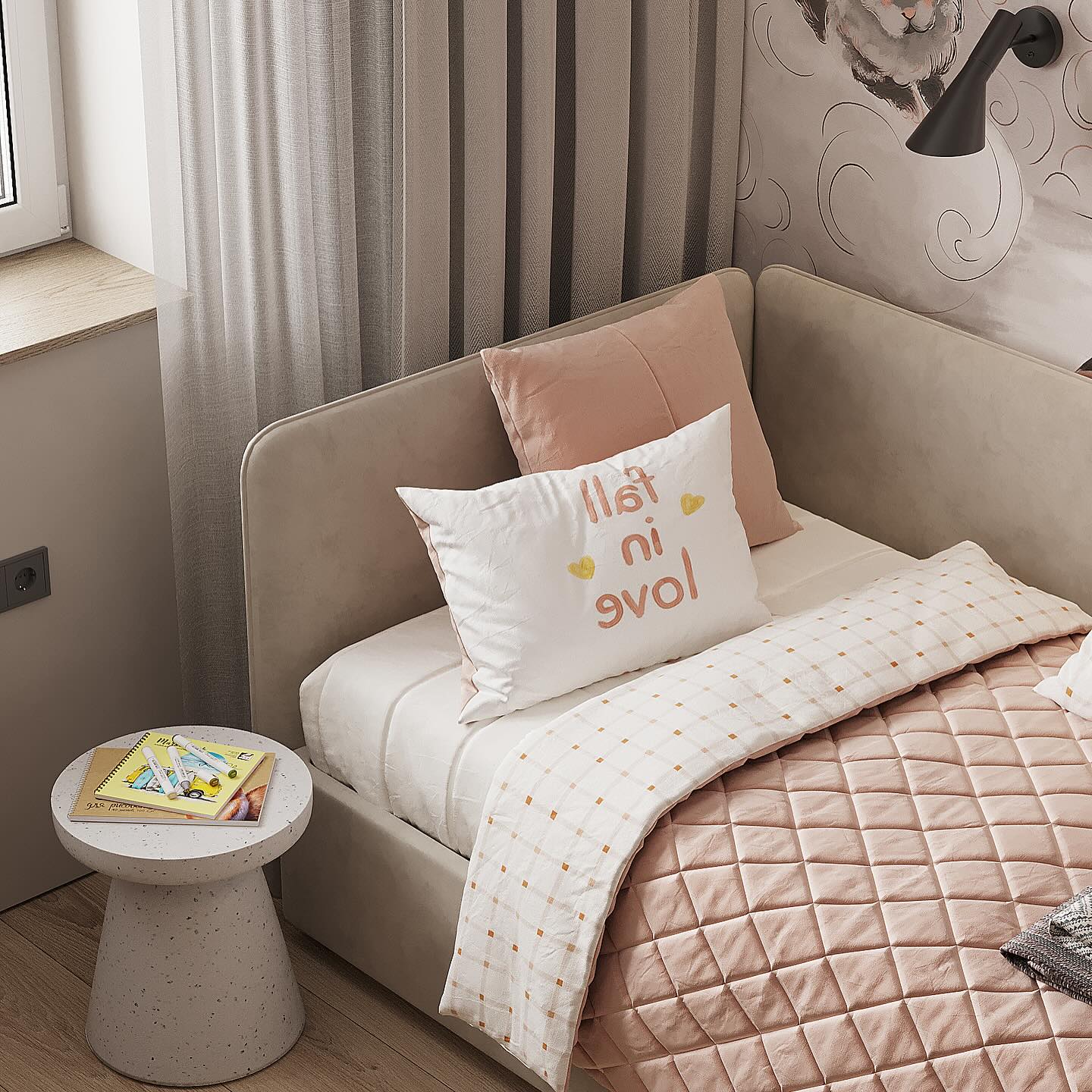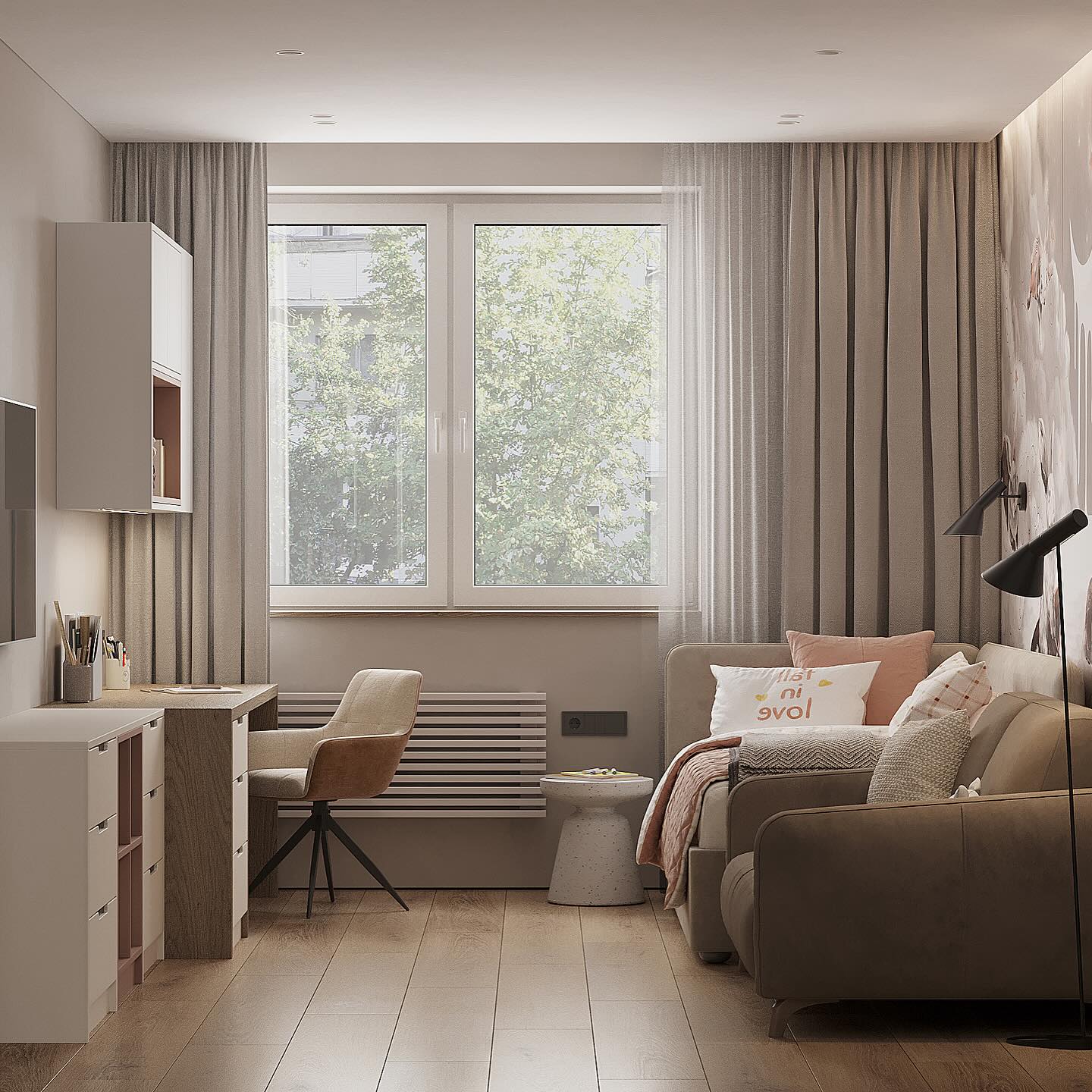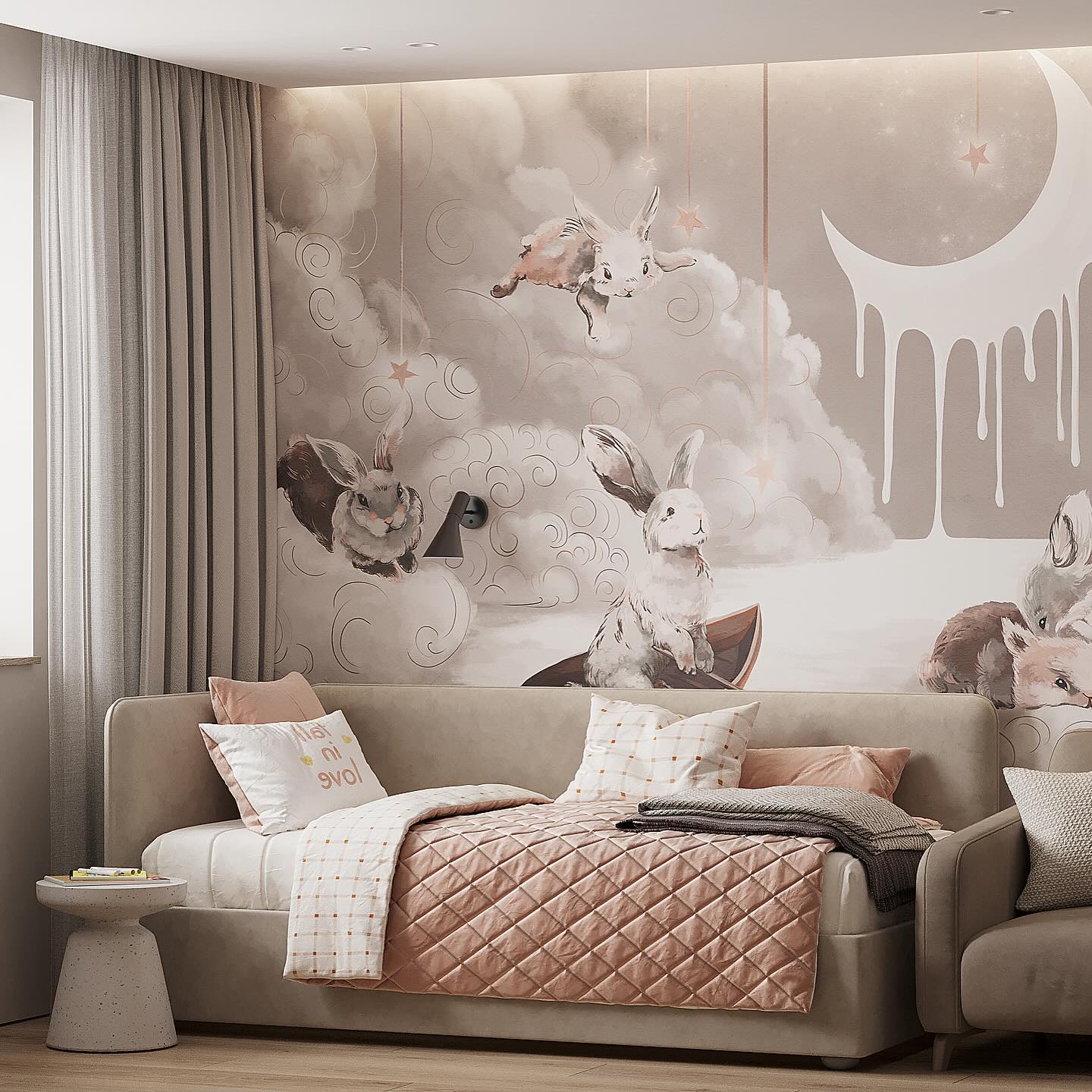 Детская комната для девочки в проекте квартиры общей площадью 120 м² в г. Ярославль. Обои из коллекции FANTASY. В ней мы создали чудесный мир, где живут: феи и единороги, пушистые зайчики и грациозные олени; где Дюймовочка летит на сове над загадочным лесом; где добрые дракончики зажигают по вечерам светящиеся огоньки. В этой коллекции обоев каждый ребёнок найдёт своих персонажей. С ней оживают сказки и начинаются приключения.