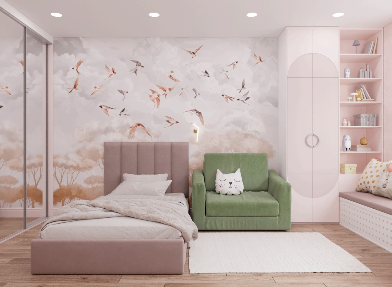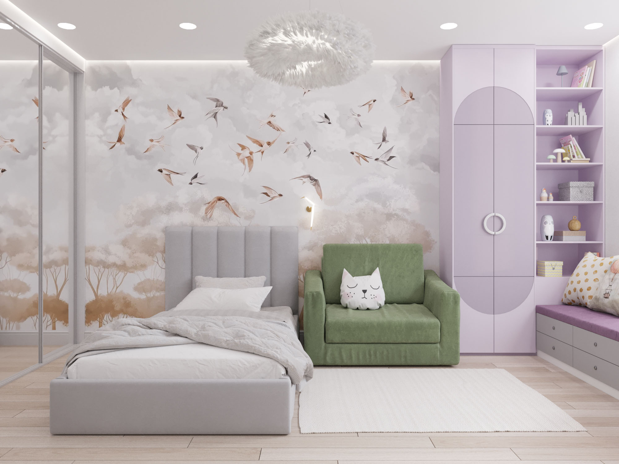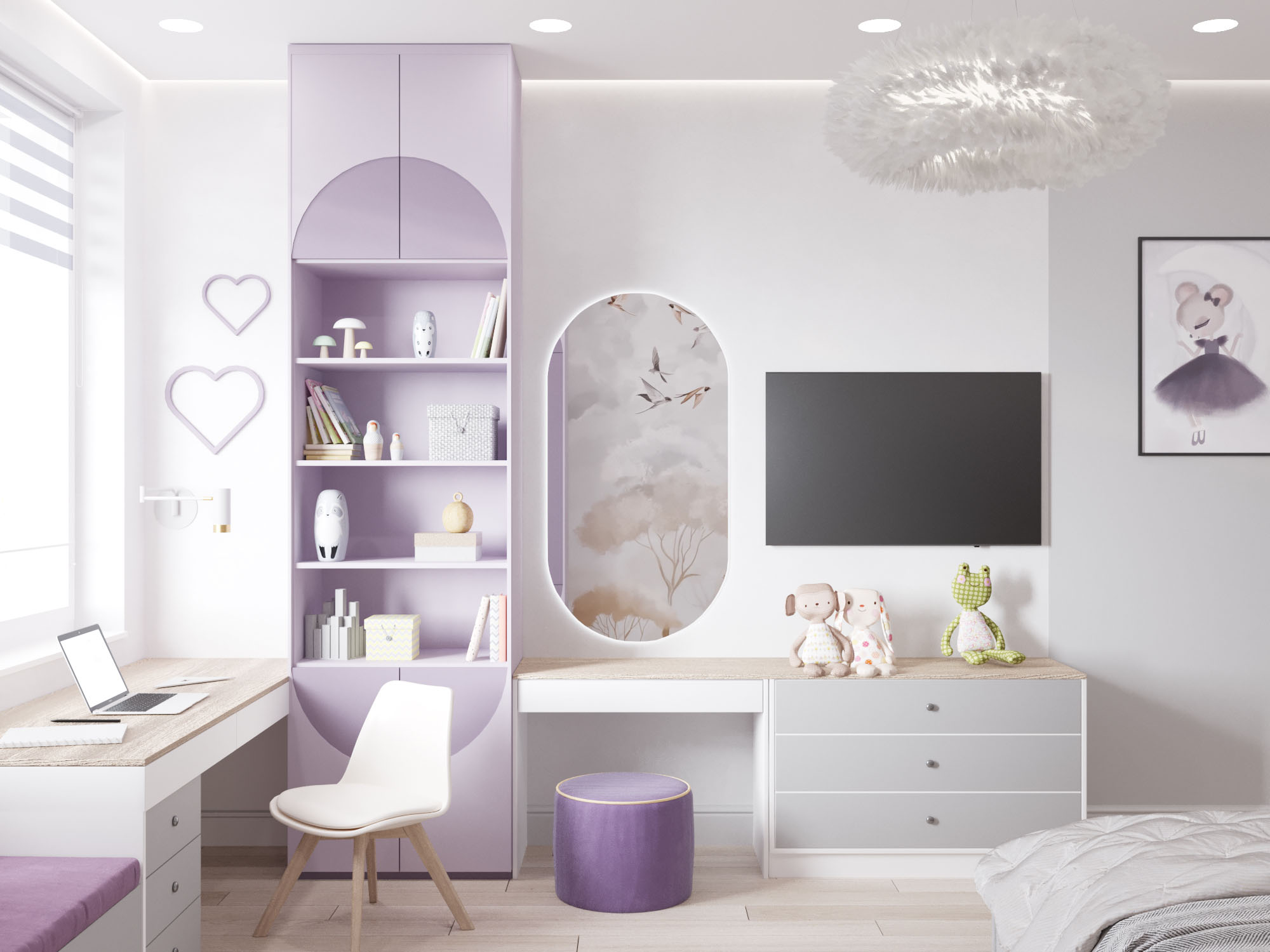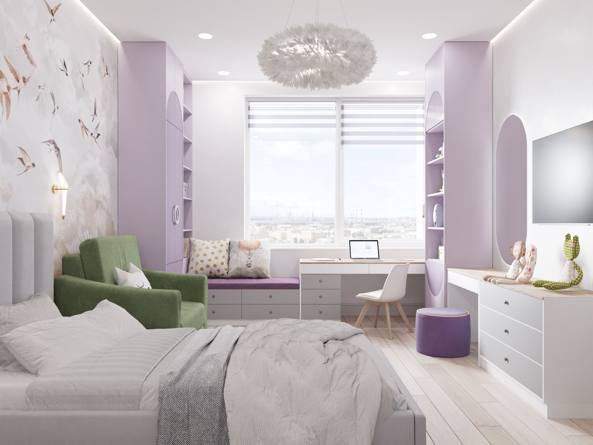 Детская комната в двух цветовых решениях для 9-летней девочки в Санкт-Петербурге. Площадь комнаты — 17 м². Девочке хотелось розово-сиреневую комнату с акцентной стеной и сиденьем у окна. Дизайнер предложил поиграть с цветами, в результате чего получилось два варианта: сиреневый и нежно-персиковый. Оба они отлично подошли к обоям.
