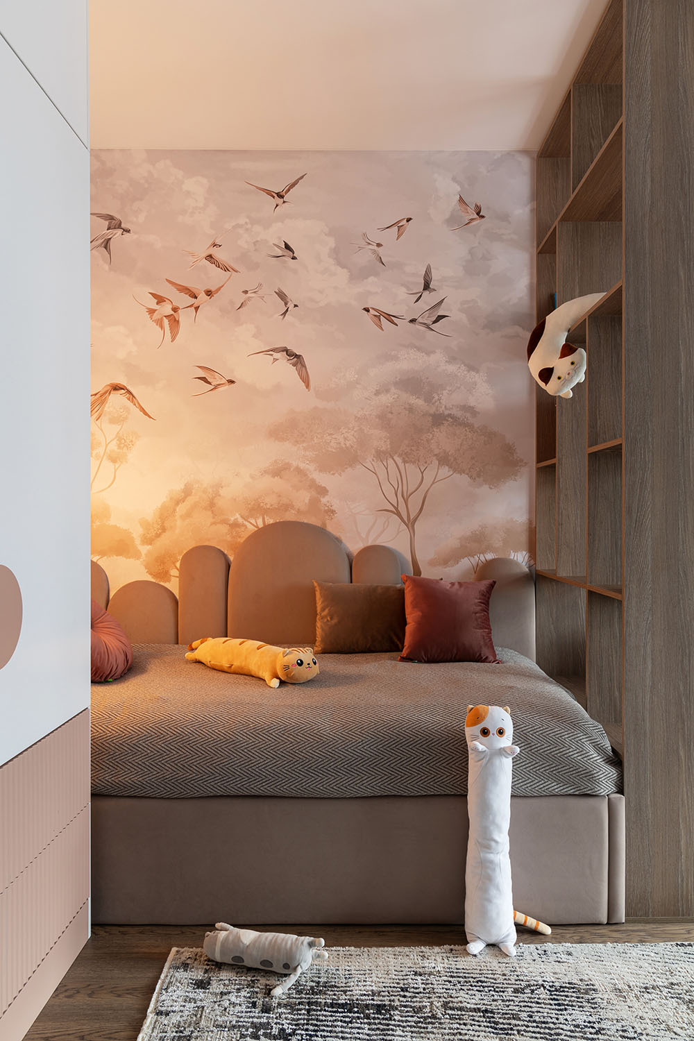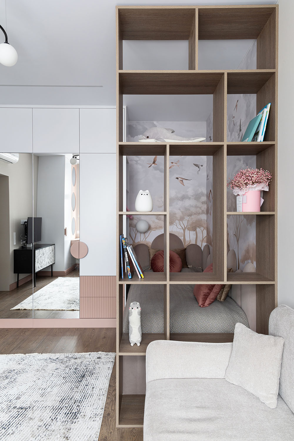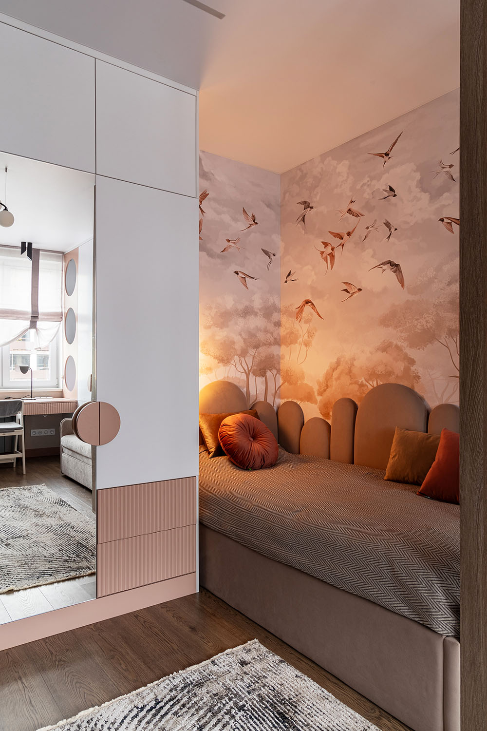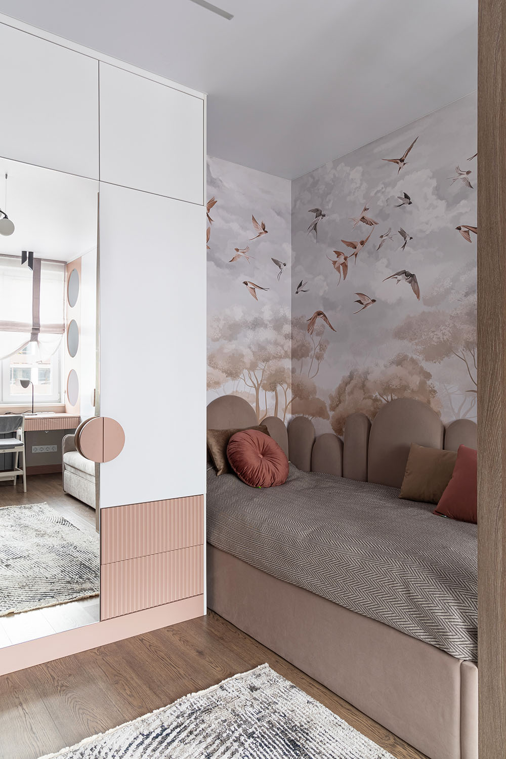 Детская комната с необычными деталями. Необычная форма изголовья кровати, сделанной на заказ. Интересная корпусная мебель с рифлеными зеркальными дверками шкафов и большими отверстиями в фасадах в рабочей зоне. И конечно, необычные обои из коллекции FAUNA.