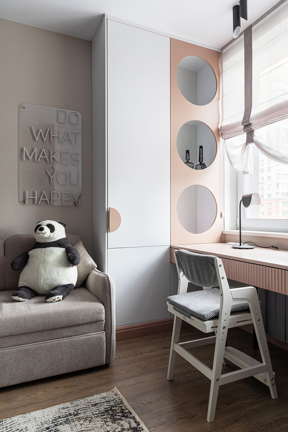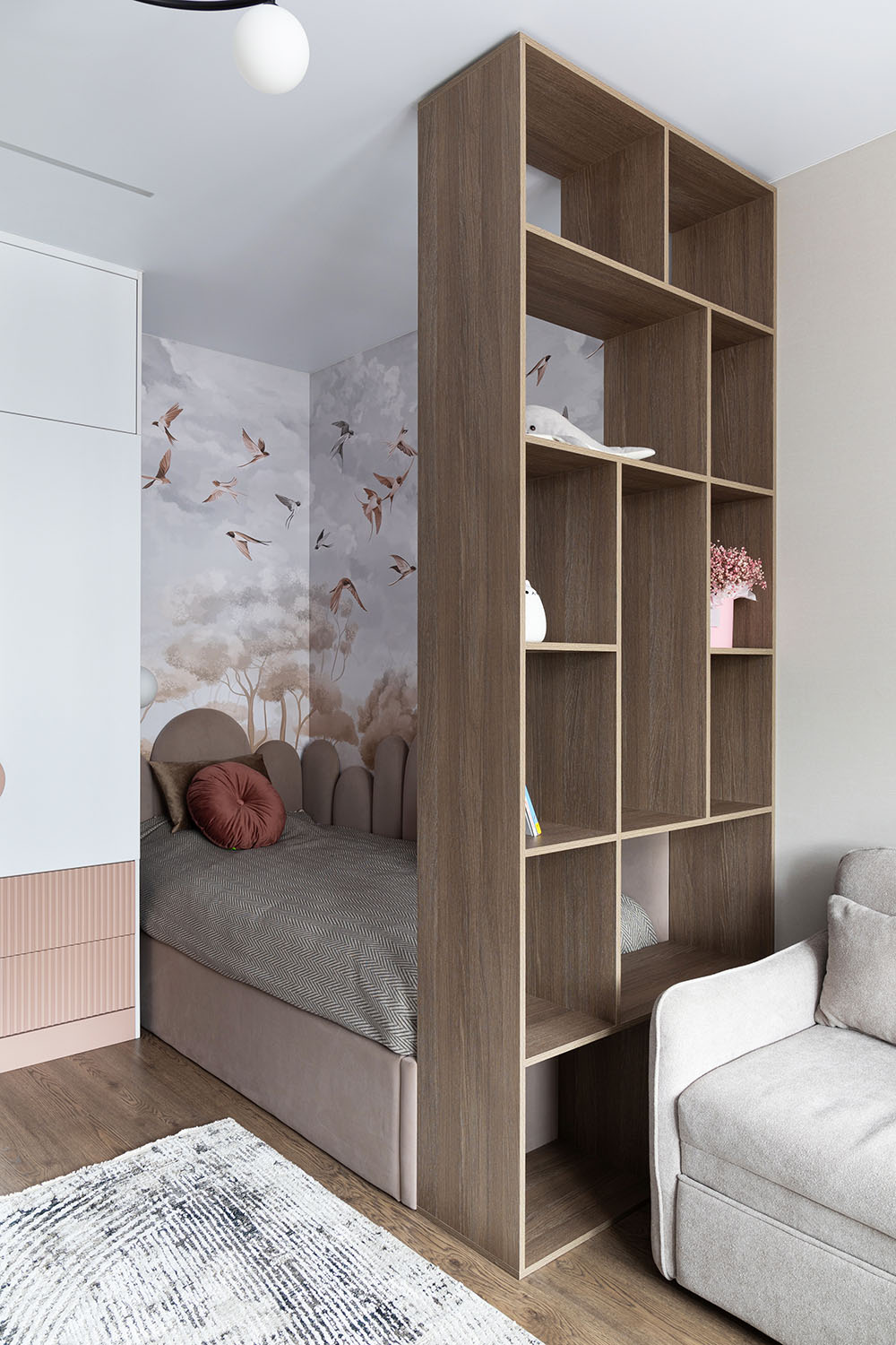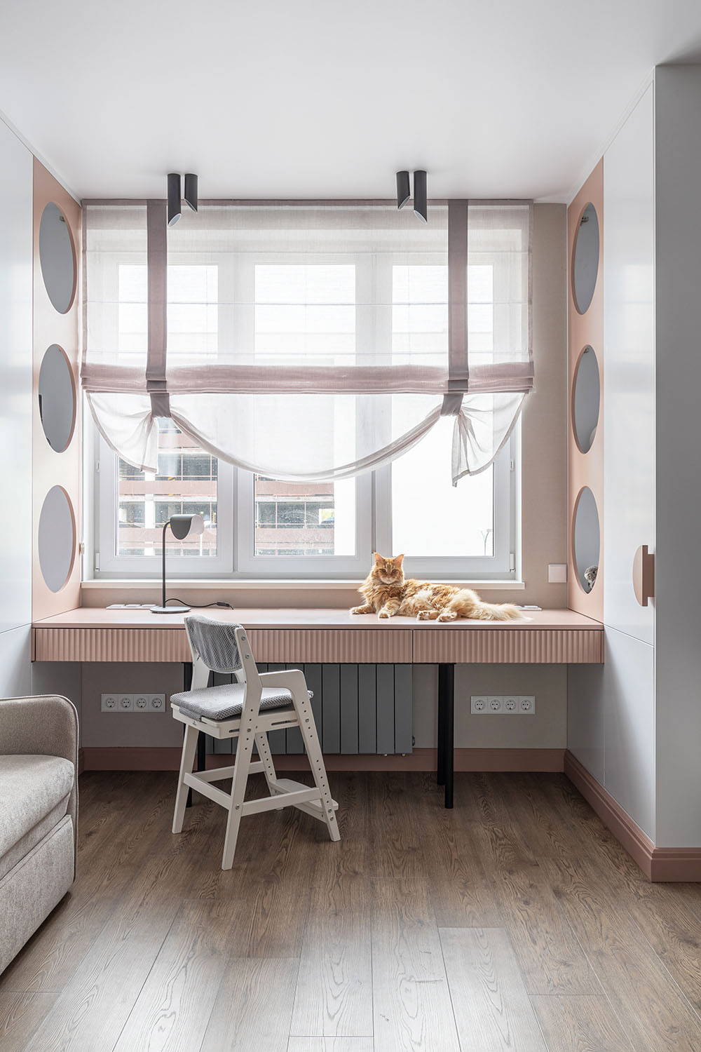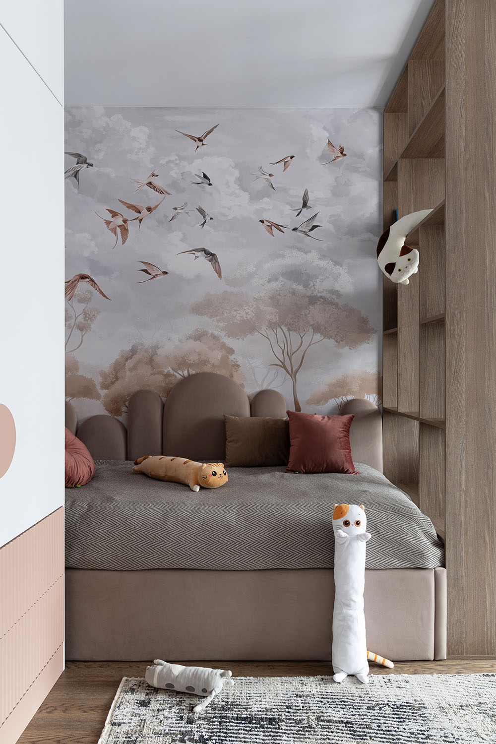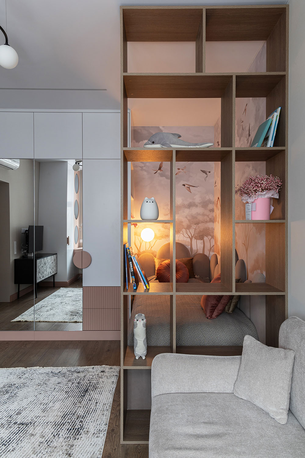 Детская комната с необычными деталями. Необычная форма изголовья кровати, сделанной на заказ. Интересная корпусная мебель с рифлеными зеркальными дверками шкафов и большими отверстиями в фасадах в рабочей зоне. И конечно, необычные обои из коллекции FAUNA.