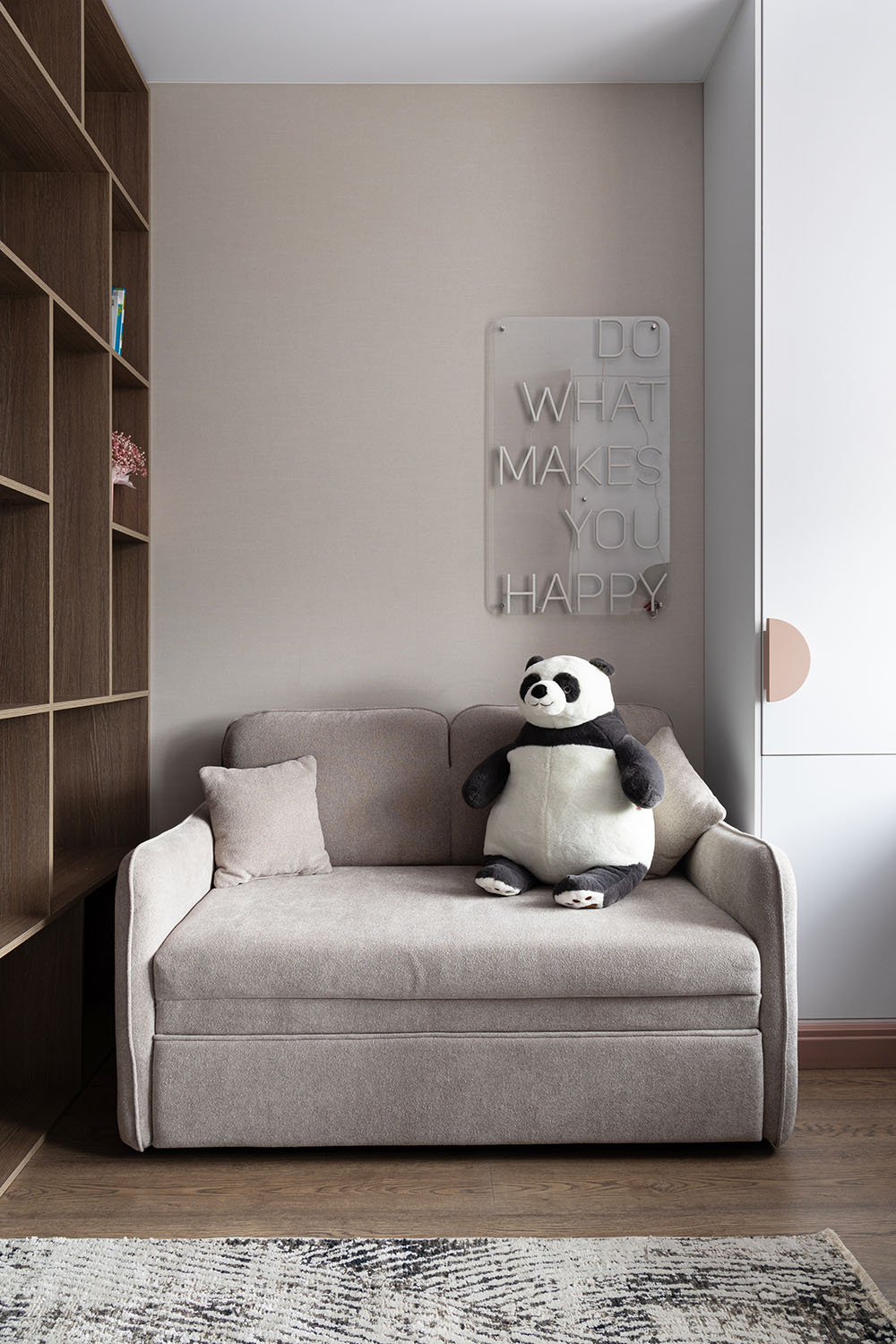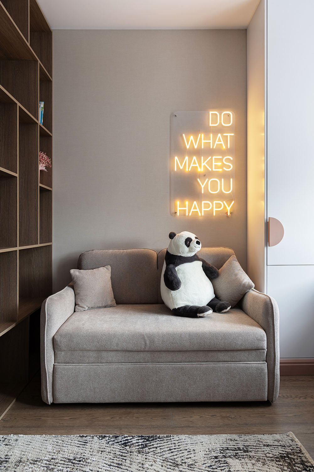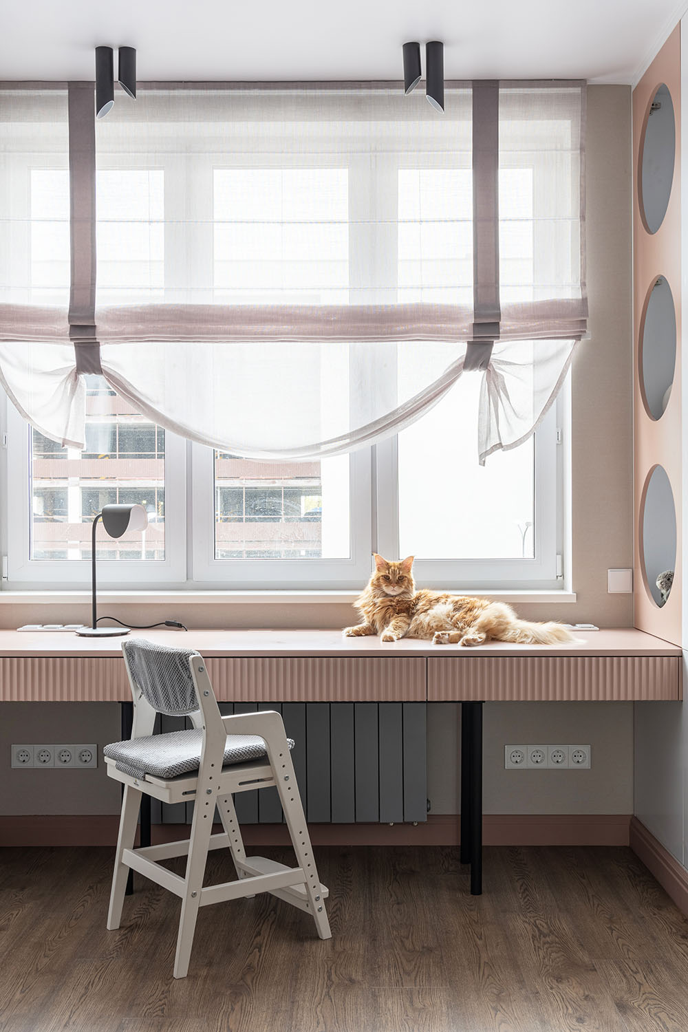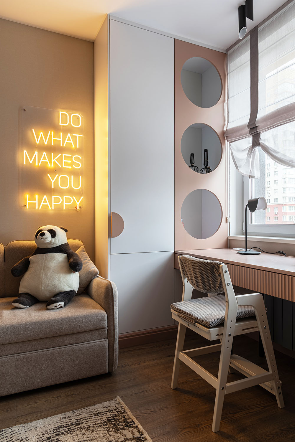 Детская комната с необычными деталями. Необычная форма изголовья кровати, сделанной на заказ. Интересная корпусная мебель с рифлеными зеркальными дверками шкафов и большими отверстиями в фасадах в рабочей зоне. И конечно, необычные обои из коллекции FAUNA.