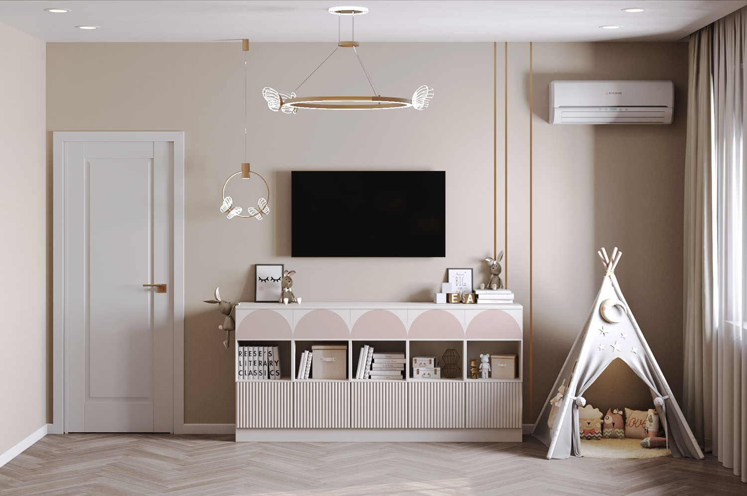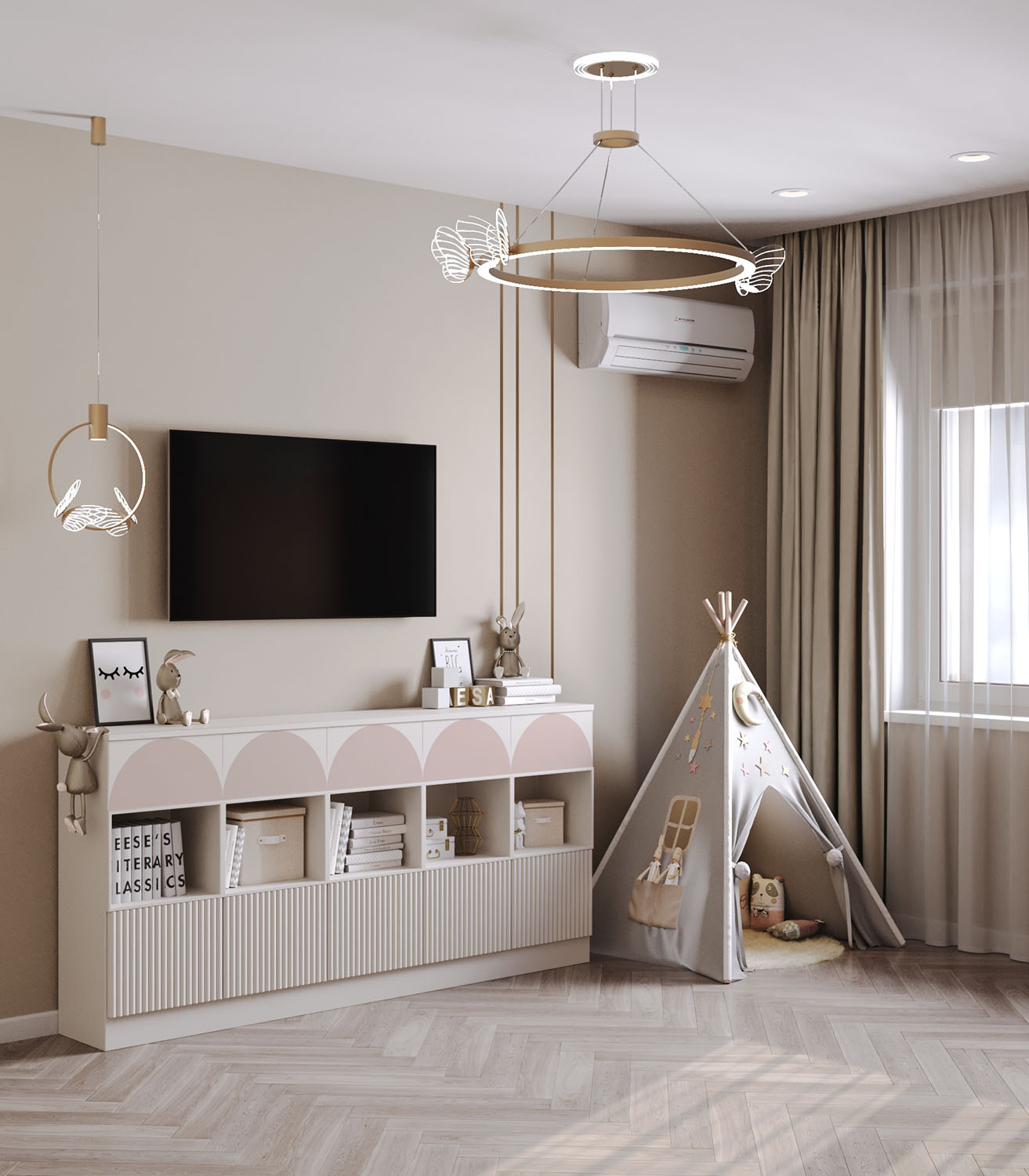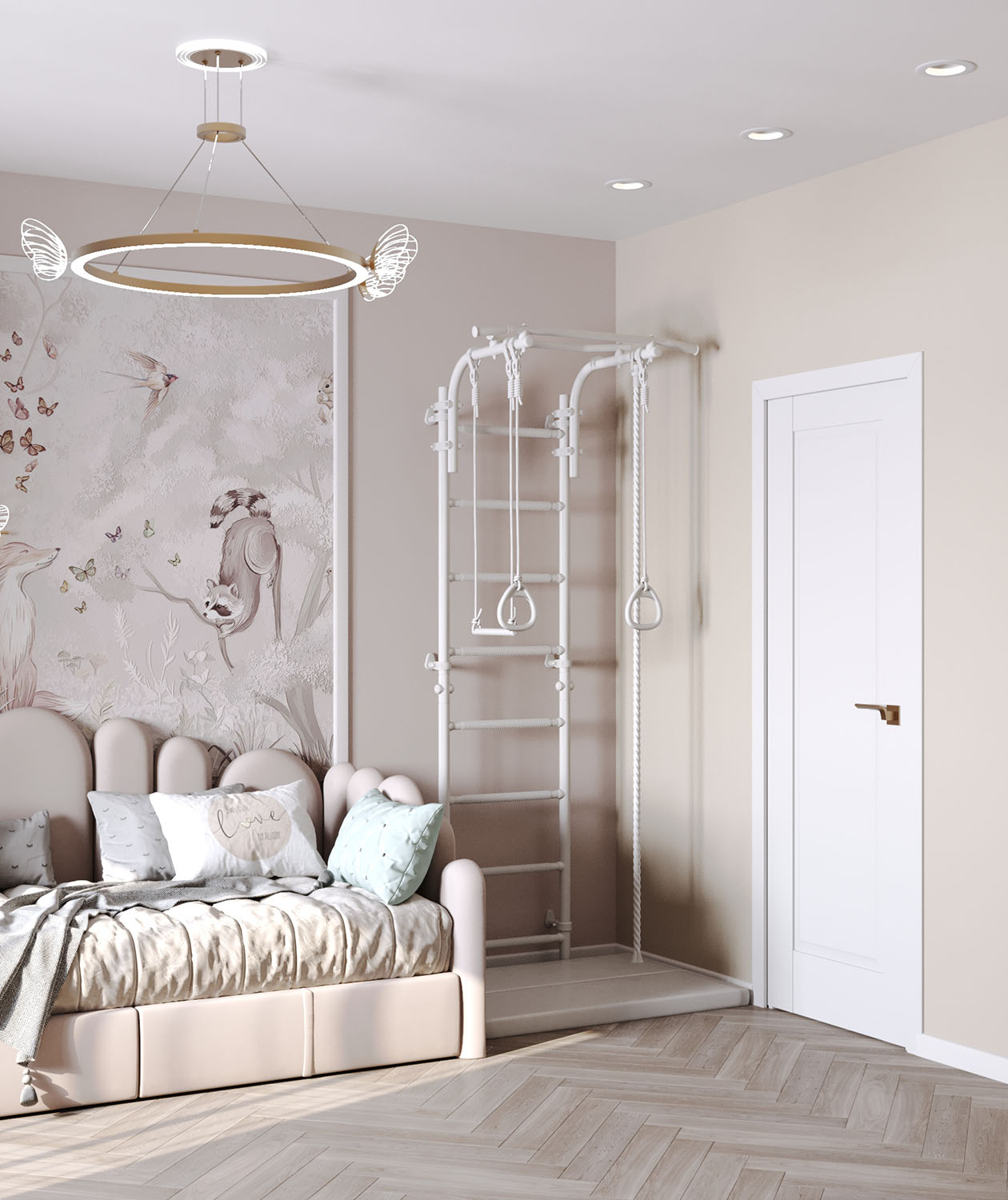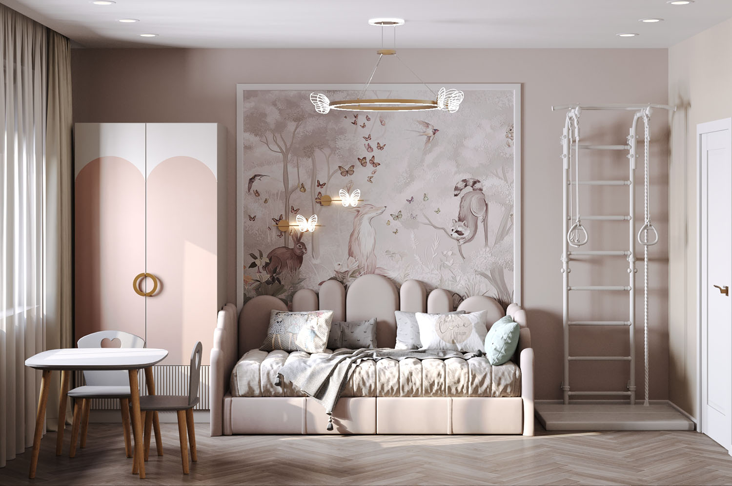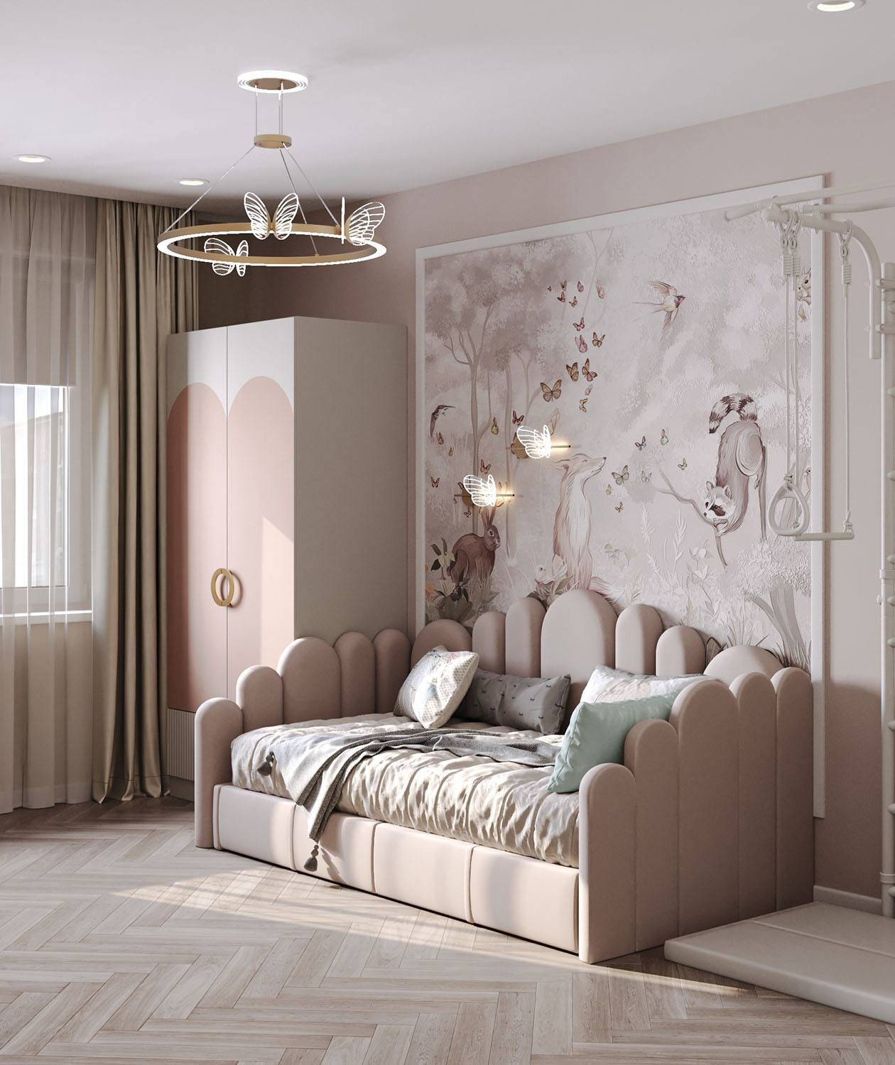 Проект детской для семьи с маленькой девочкой. Площадь комнаты — 14 м². Весь интерьер квартиры выдержан в светлых оттенках с вкраплением золотых деталей. Для детской выбрали нежную фреску из коллекции FAUNA со зверятами. Рисунок поддержали цветом мебели и стен, мягкими формами, светильниками с бабочками.