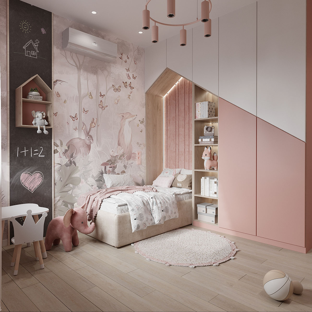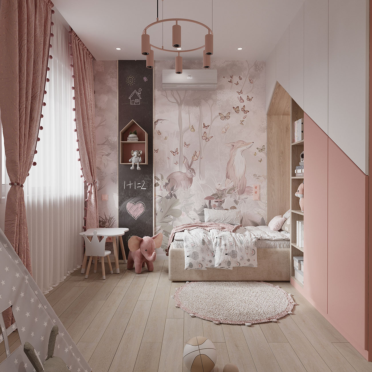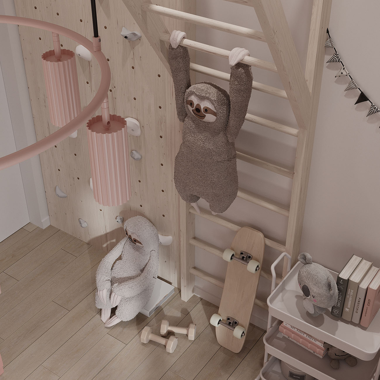 В этой детской есть все необходимое для малышки. Пространство играть и ползать, рисовать на меловой/магнитной доске и развивать своё творчество. Просыпаться и засыпать «в сказочном лесу» дизайнерских обоев, находясь в уютном и функциональном «домике» с кроватью и системой хранения. А также стульчик с короной, чтобы девочка почувствовала себя принцессой на троне. Покататься на пуфике-слонёнке и ощутить себя покорительницей джунглей, спрятаться от всех в секретном месте, повисеть на шведской стенке со скалодромом вместе с дружелюбными ленивцами.
