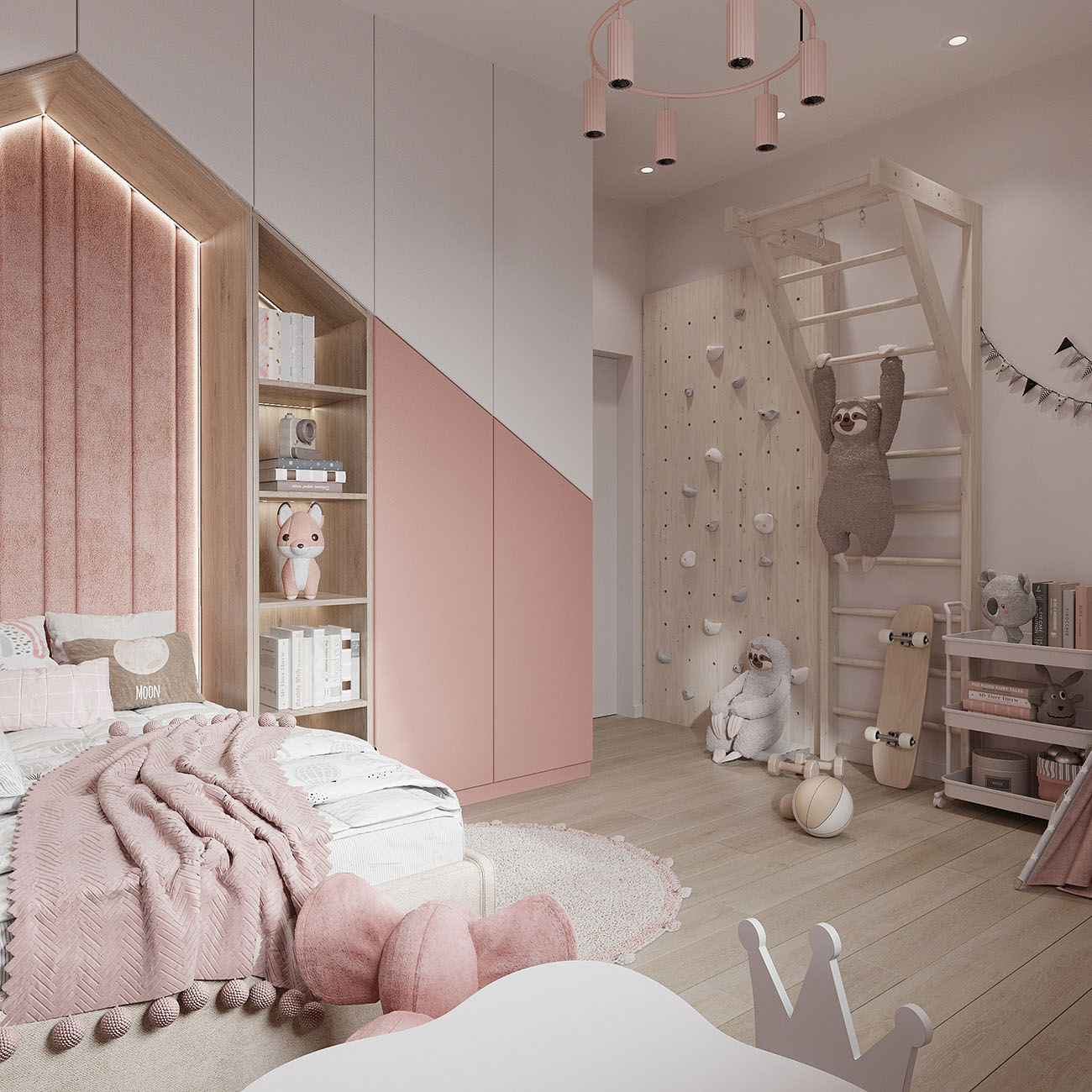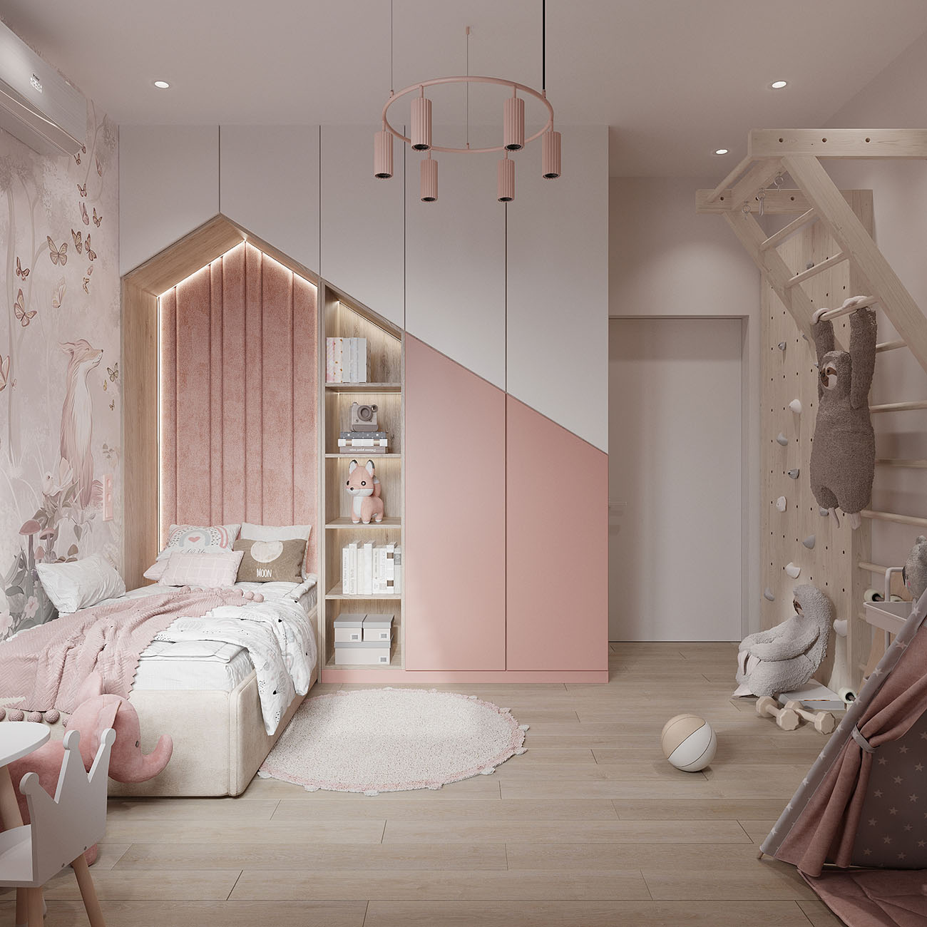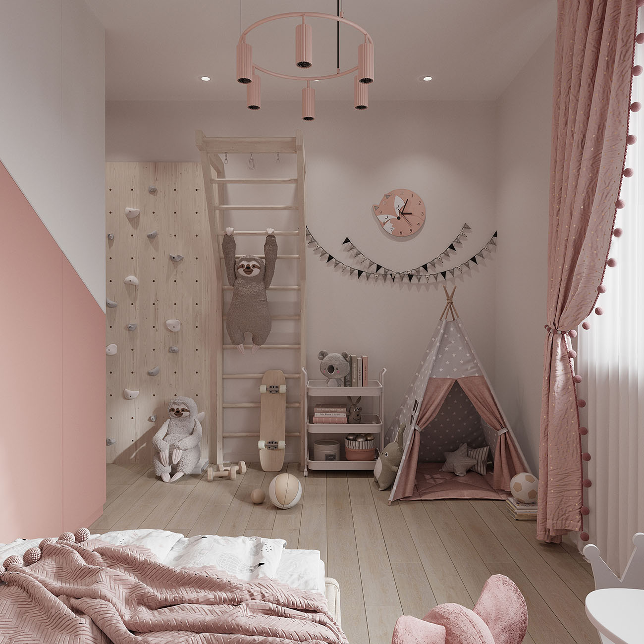 В этой детской есть все необходимое для малышки. Пространство играть и ползать, рисовать на меловой/магнитной доске и развивать своё творчество. Просыпаться и засыпать «в сказочном лесу» дизайнерских обоев, находясь в уютном и функциональном «домике» с кроватью и системой хранения. А также стульчик с короной, чтобы девочка почувствовала себя принцессой на троне. Покататься на пуфике-слонёнке и ощутить себя покорительницей джунглей, спрятаться от всех в секретном месте, повисеть на шведской стенке со скалодромом вместе с дружелюбными ленивцами.