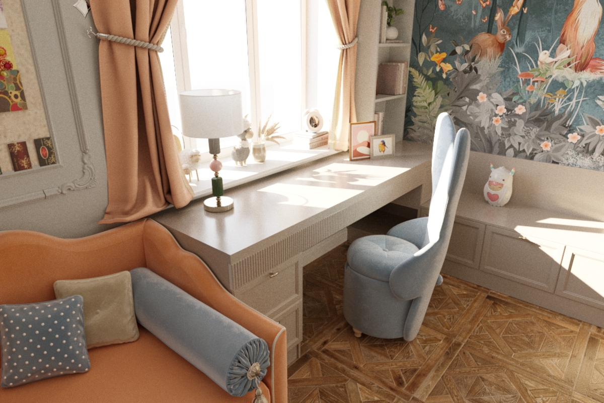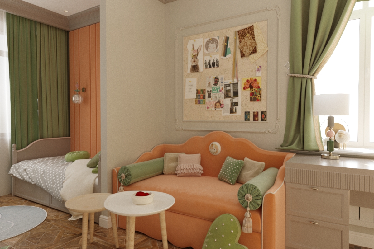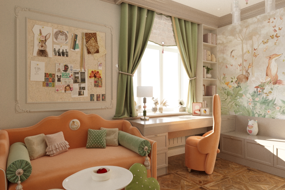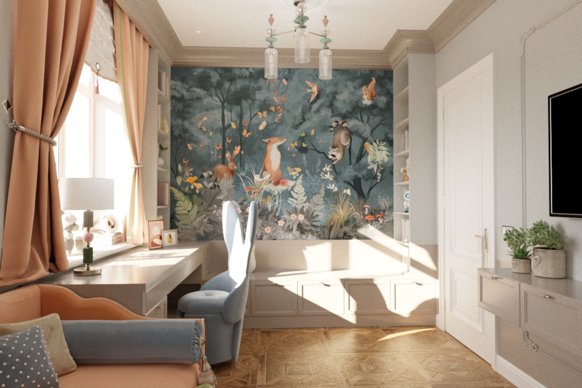 Два цветовых решения детской комнаты для девочки 3-х лет, г. Тамбов. Проект разработан с проекцией на будущее, с учетом пожеланий ее мамы. Площадь комнаты — 20 м². Обои выбрали из коллекции Fauna. Став ярким акцентом, они подчеркнули нежное сочетание цветов интерьера.