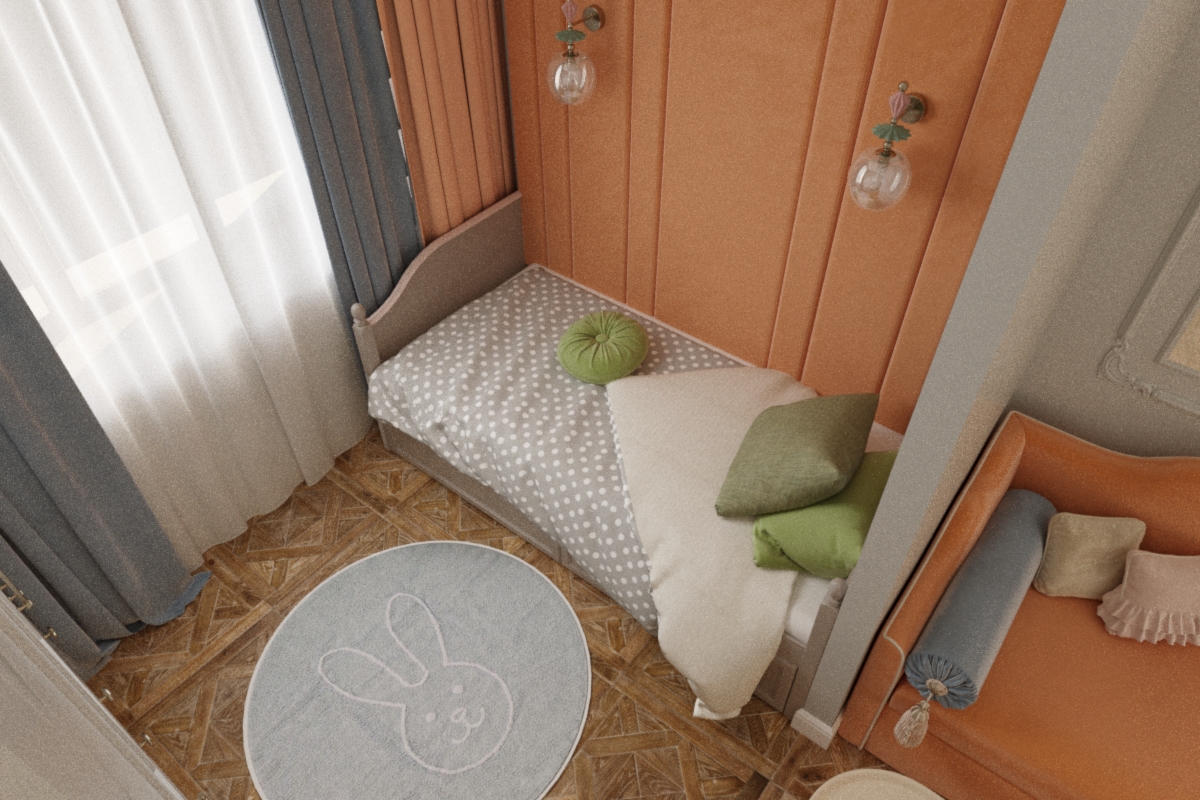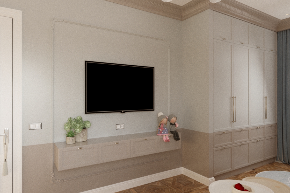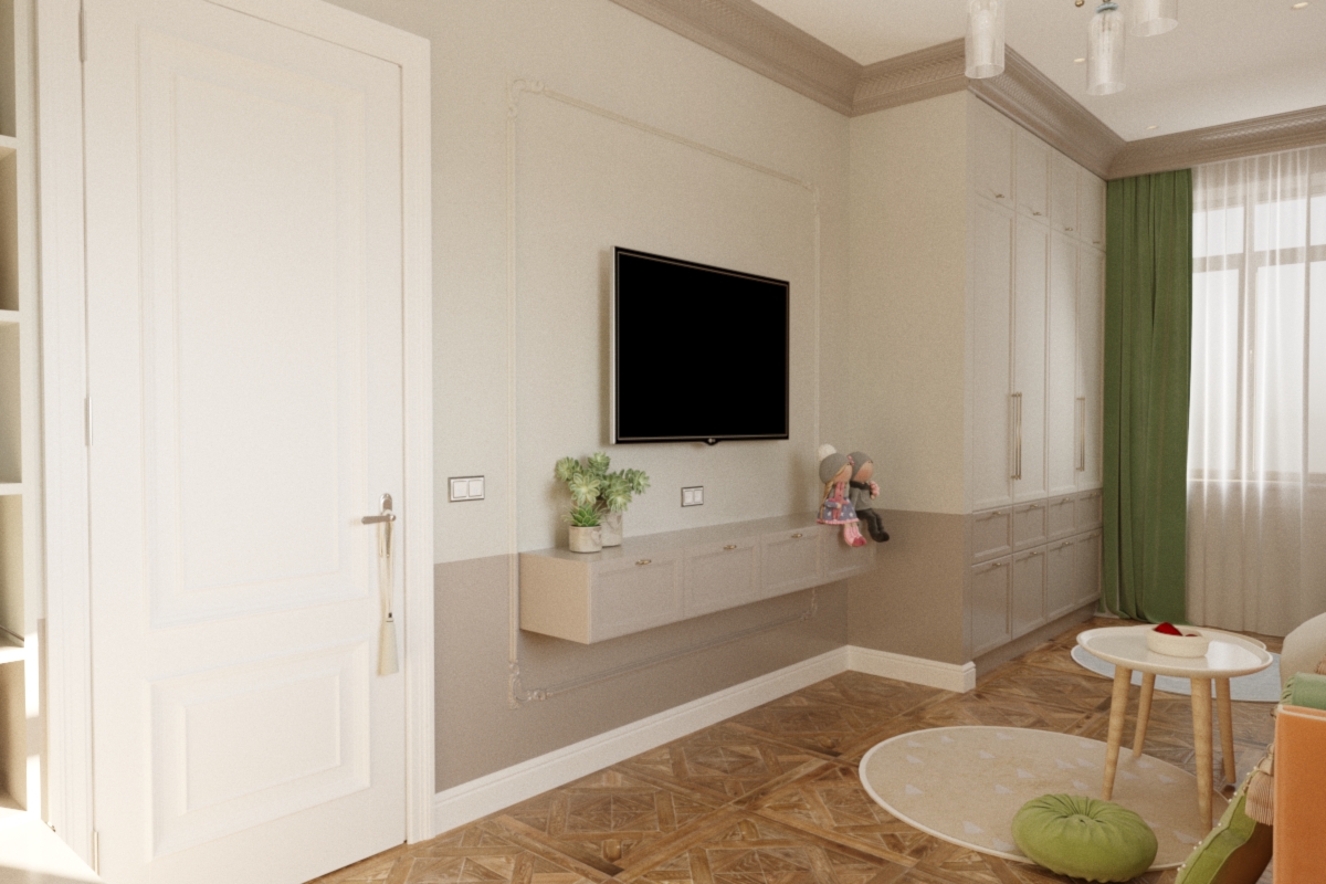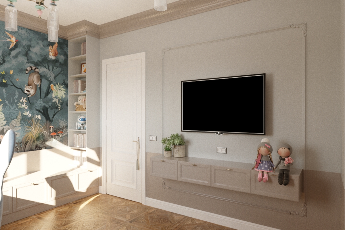 Два цветовых решения детской комнаты для девочки 3-х лет, г. Тамбов. Проект разработан с проекцией на будущее, с учетом пожеланий ее мамы. Площадь комнаты — 20 м². Обои выбрали из коллекции Fauna. Став ярким акцентом, они подчеркнули нежное сочетание цветов интерьера.
