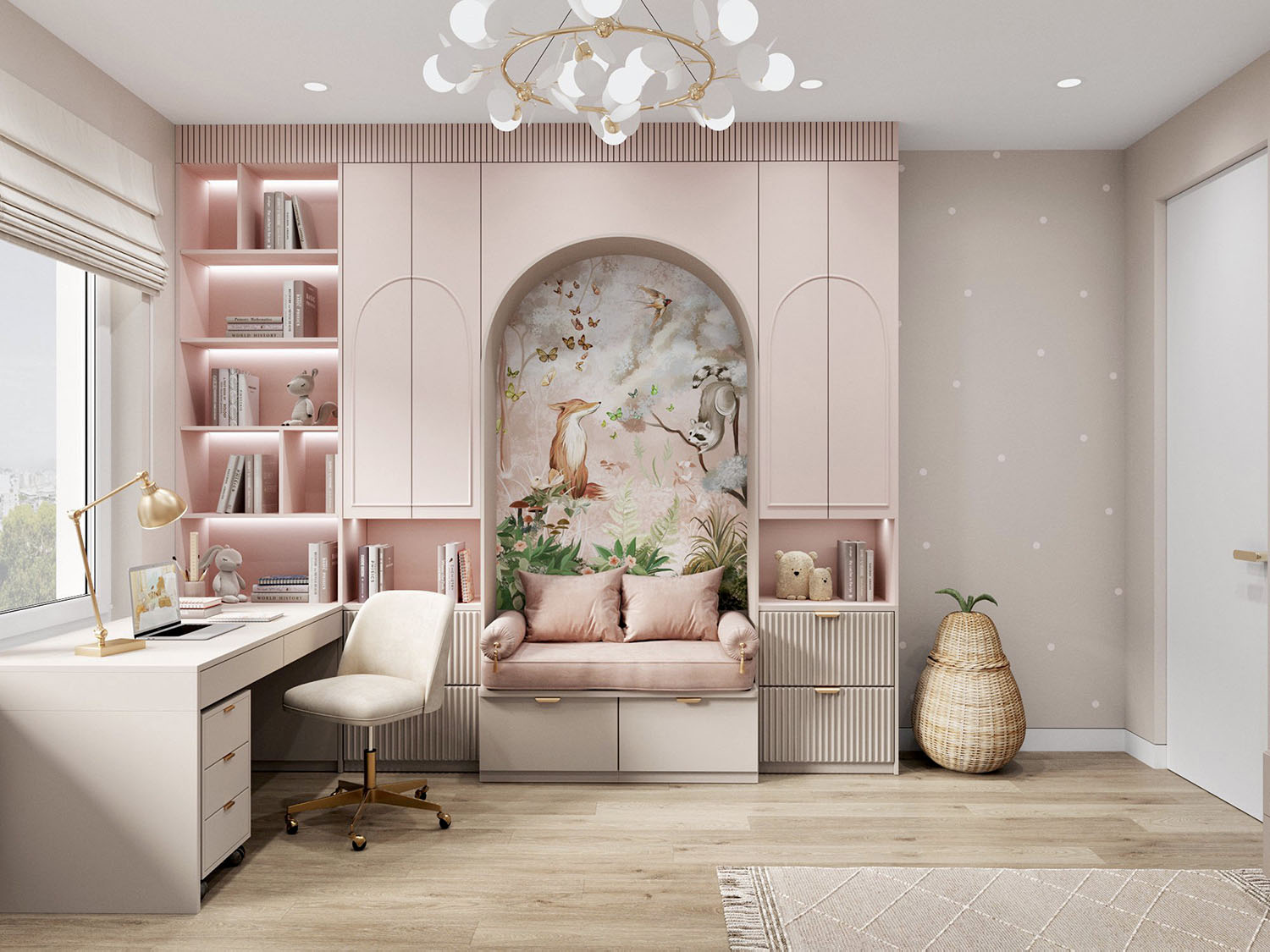 В данном проекте дизайнер предусмотрел систему встроенных стеллажей с выкатными ящиками и полками. Центром данной композиции стала игровая арка с диванчиком и красивым панно внутри. Диванчик используется для игр с подругами, а система стеллажей позволяет упорядочить книги и разделить это все с игрушками.