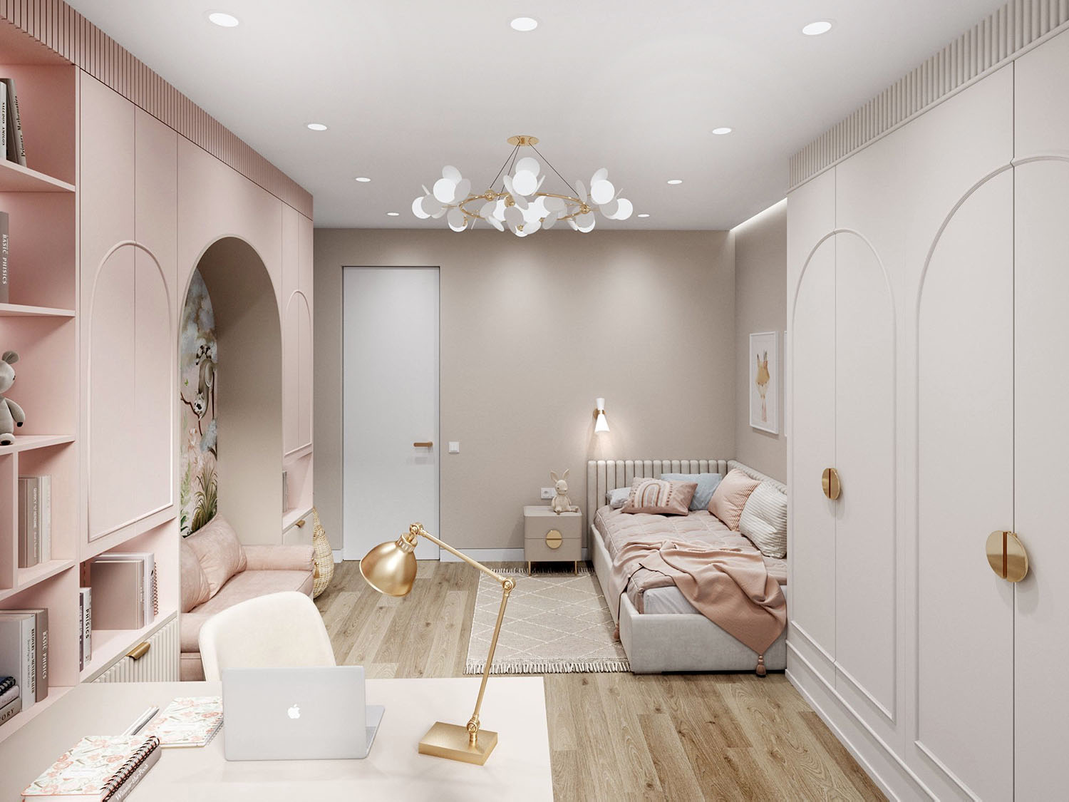 Детская комната площадью 10 м² разрабатывалась для девочки 7 лет, которая пошла в первый класс. Пожеланием родителей было сделать комнату соответствующей возрасту ребенка, а не на вырост. Хотелось побольше зон хранения игрушек, книг и одежды.