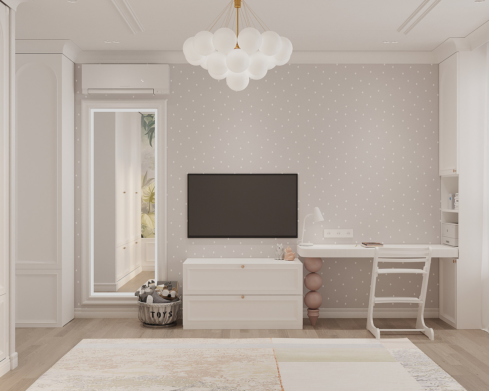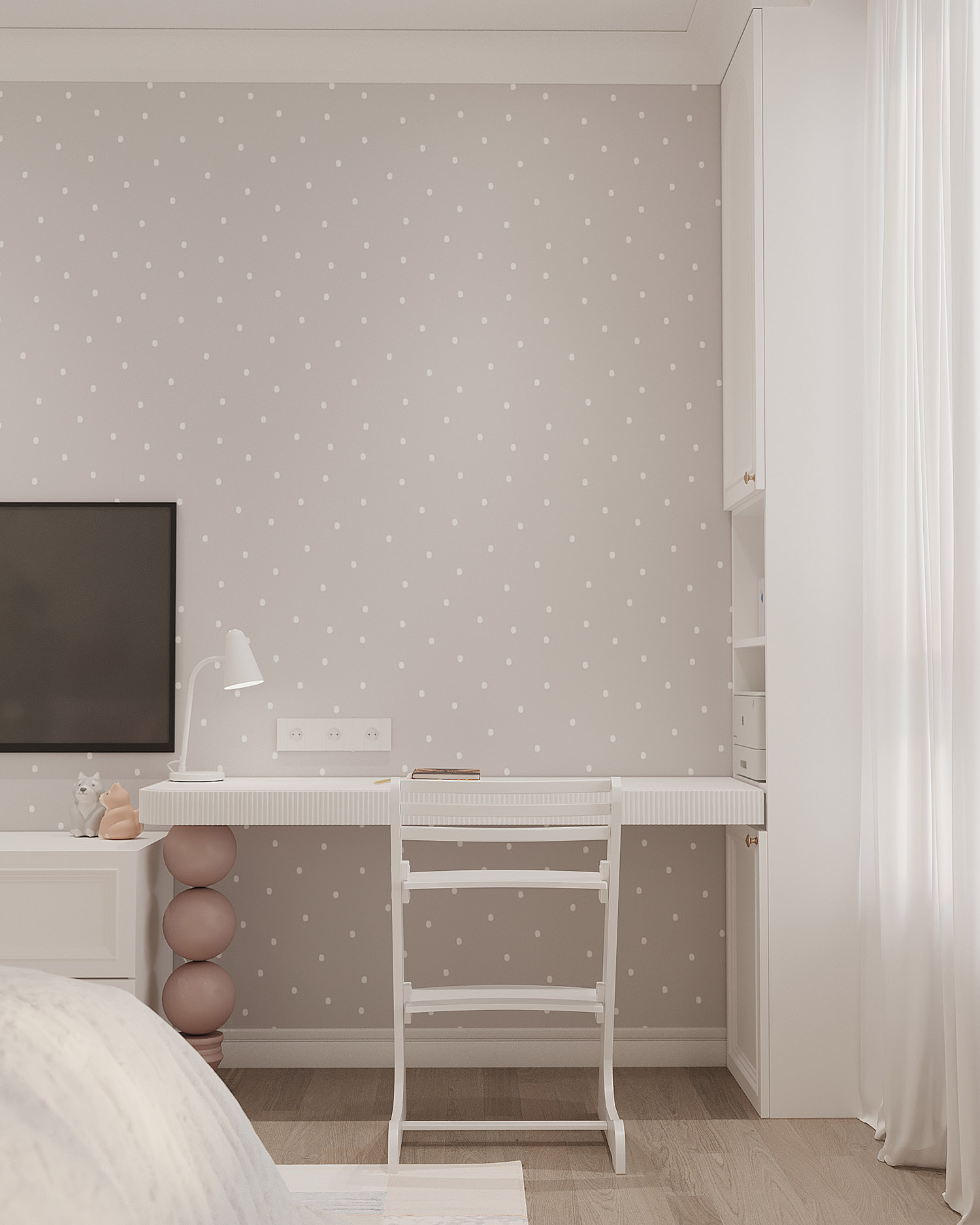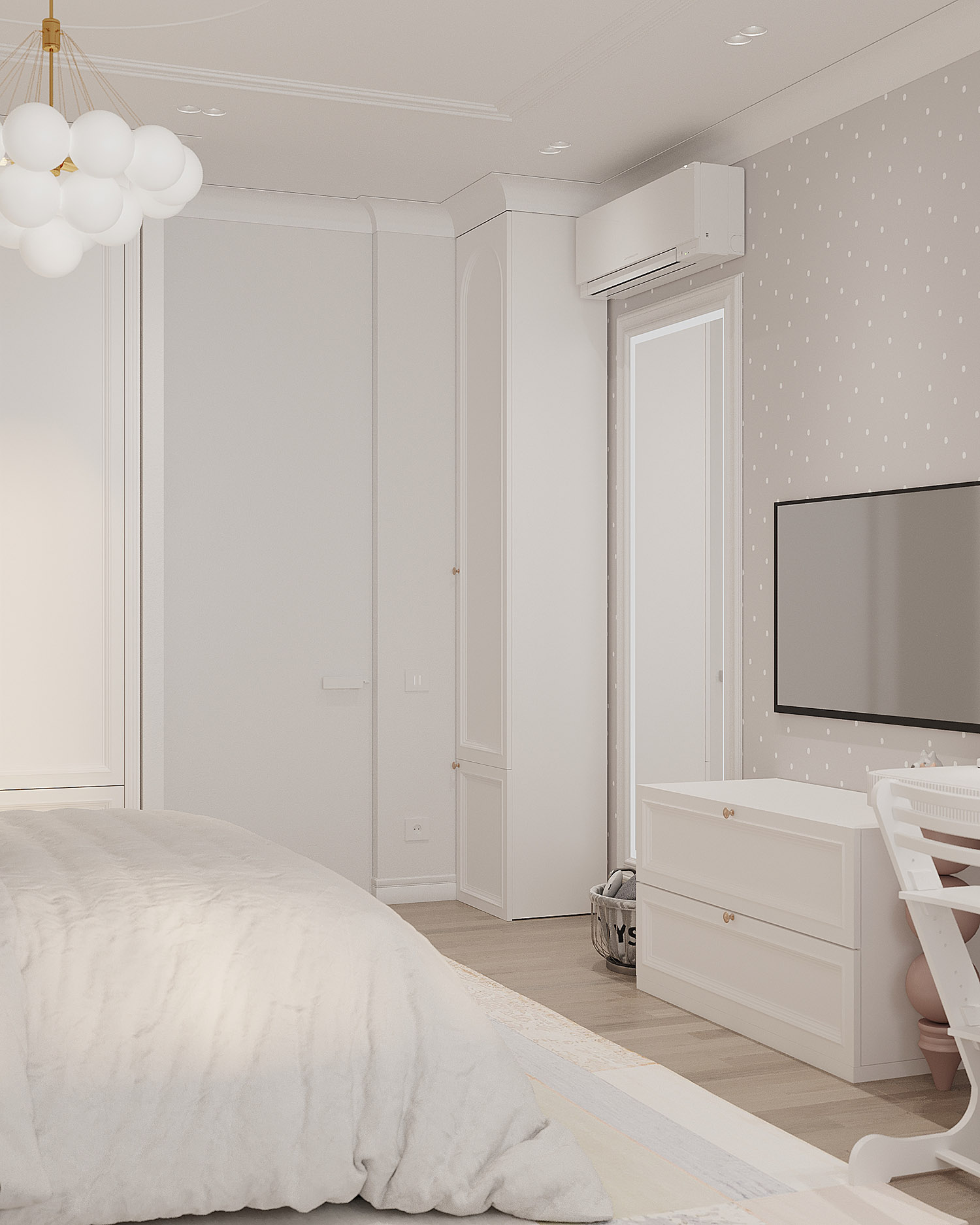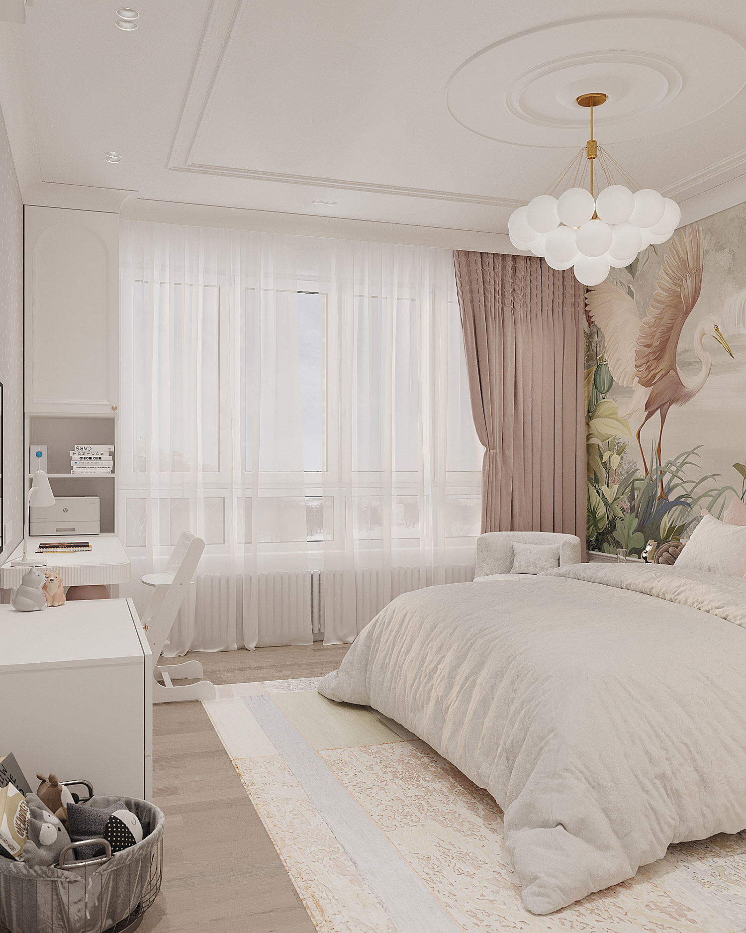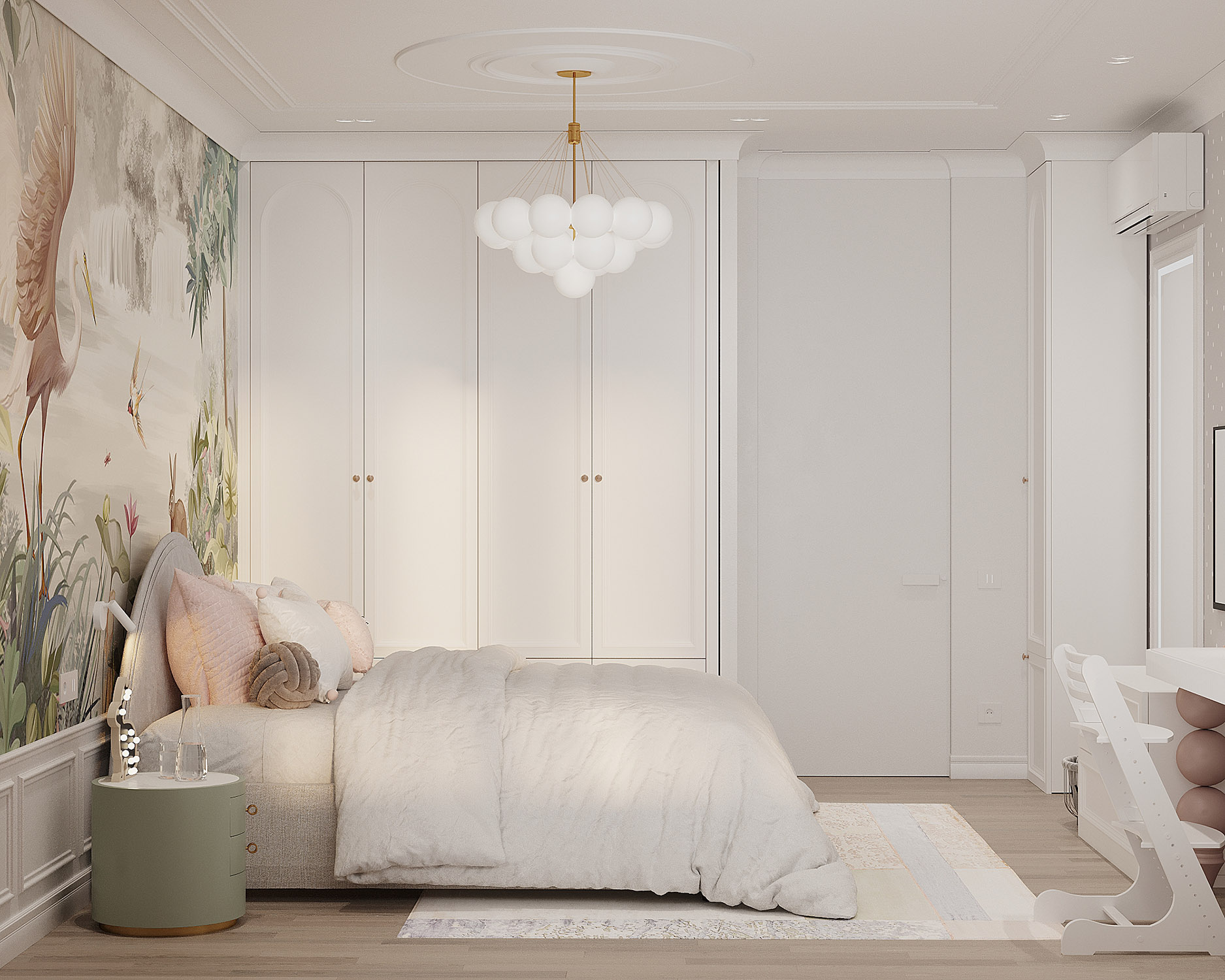 Комната для юной любительницы сказок, мечтательной и нежной девочки. Пожеланием заказчиков было сохранить светлое, открытое пространство, при этом не уйти в зефирно-розовый интерьер, добавить умеренной яркости.