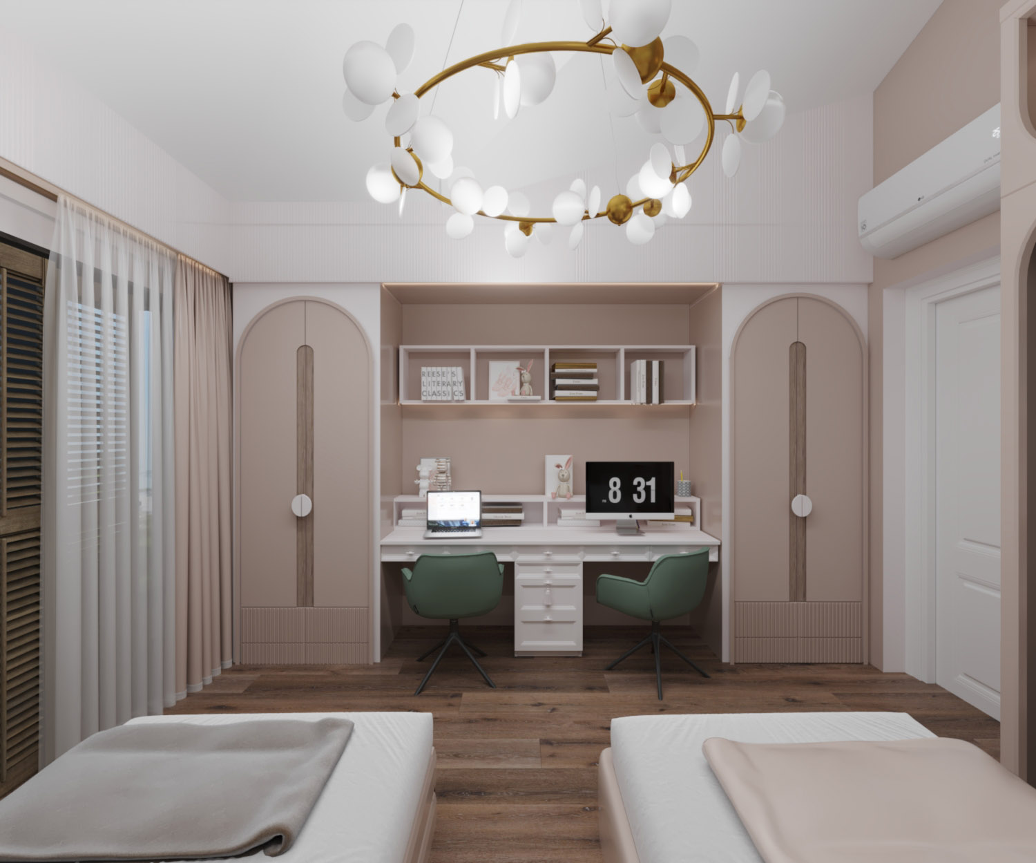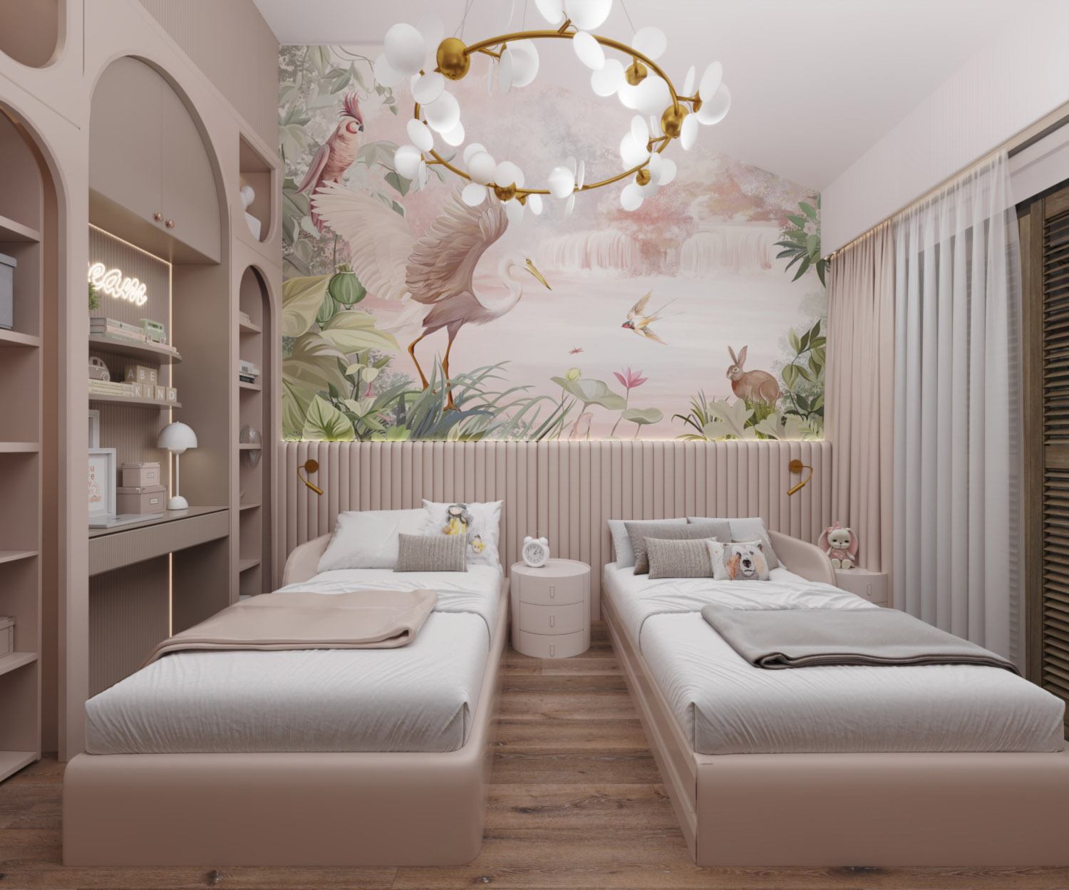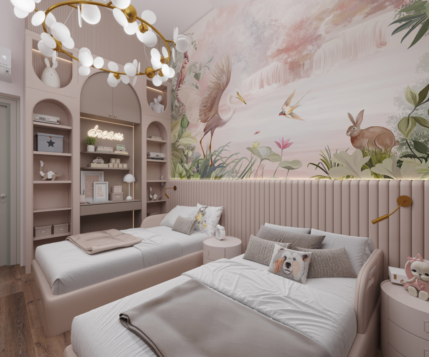 Мягкое изголовье объединяет кровати, создавая ощущение гармонии и единства. А встроенные настенные бра обеспечивают комфортное локальное освещение, добавляя уюта в вечернее время.