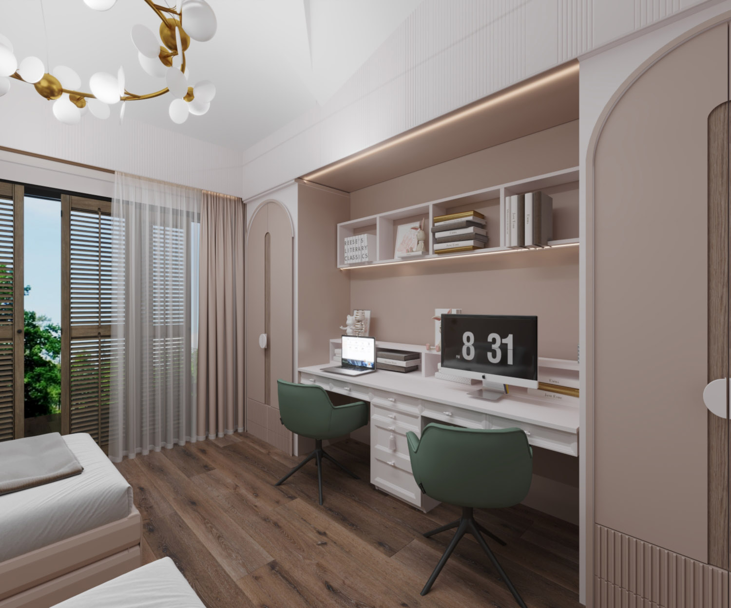 Удобные рабочие столы органично встроены в мебельный ансамбль, создавая идеальные условия для первых уроков и творческих занятий.