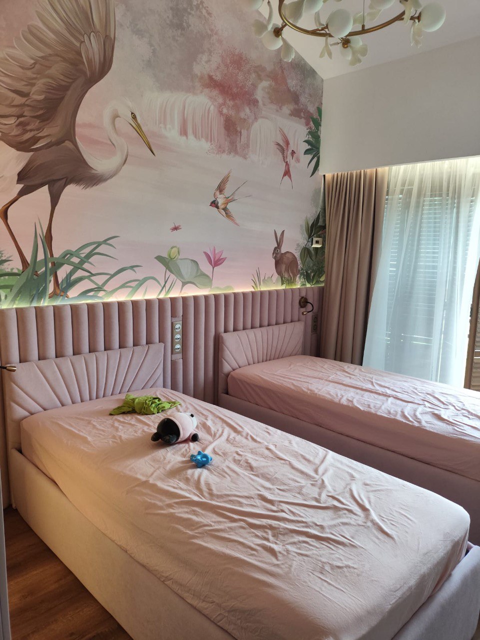 Нежные обои с изображением животных добавляют комнате мечтательности и уюта, не перегружая пространство. Они полностью соответствуют желанию маленьких заказчиц — погрузиться в сказочный мир природы.