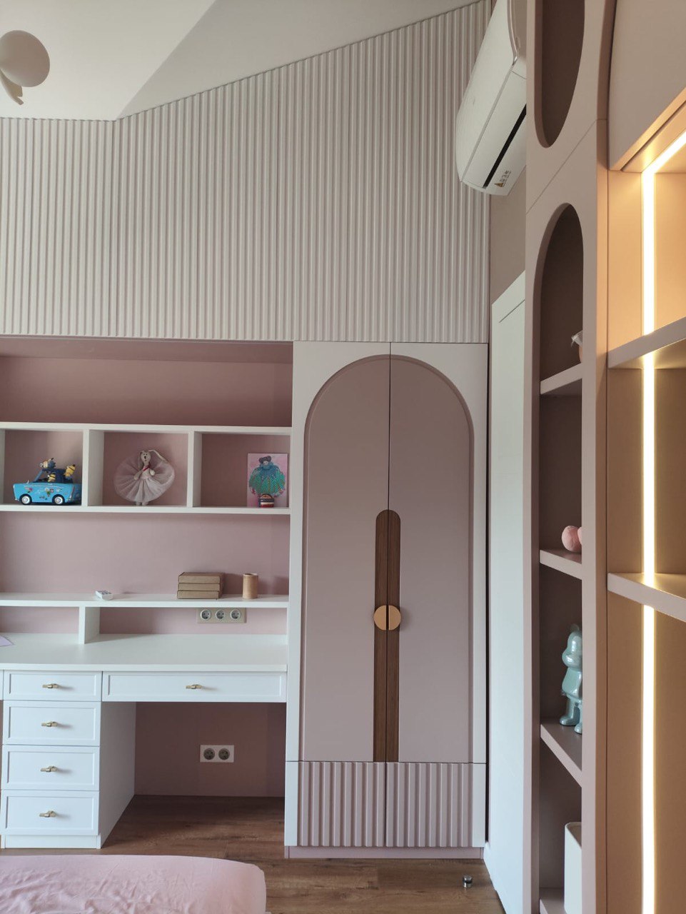 Встроенные шкафы и полки в нишах позволяют компактно хранить игрушки, книги и одежду, сохраняя порядок в комнате.