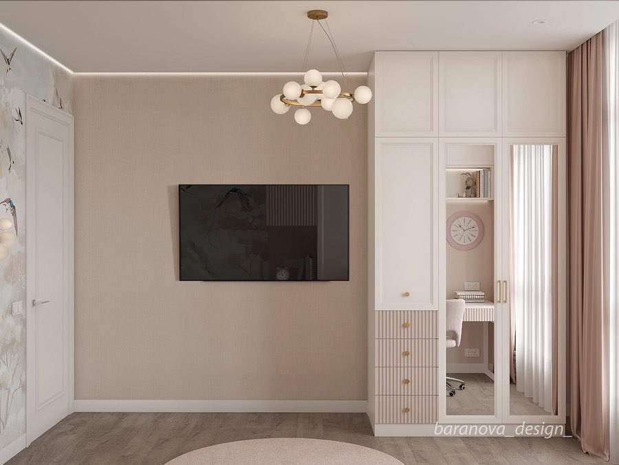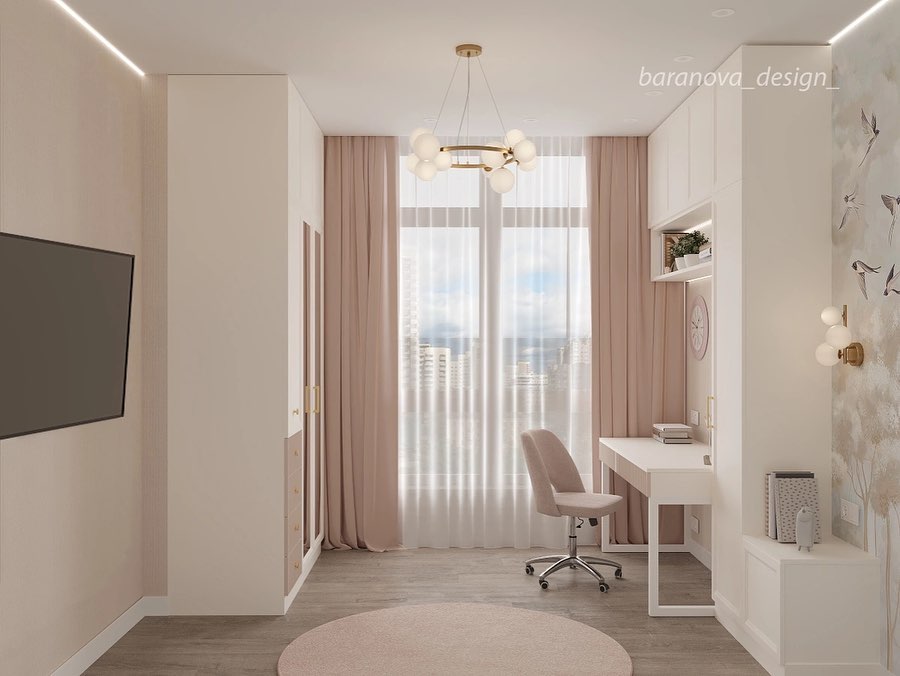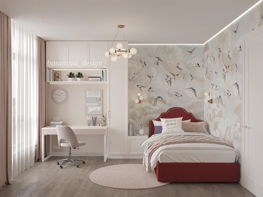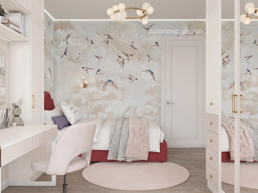 Детская комната для девочки. Площадь помещения — 12 м². Обои из коллекции FAUNA.