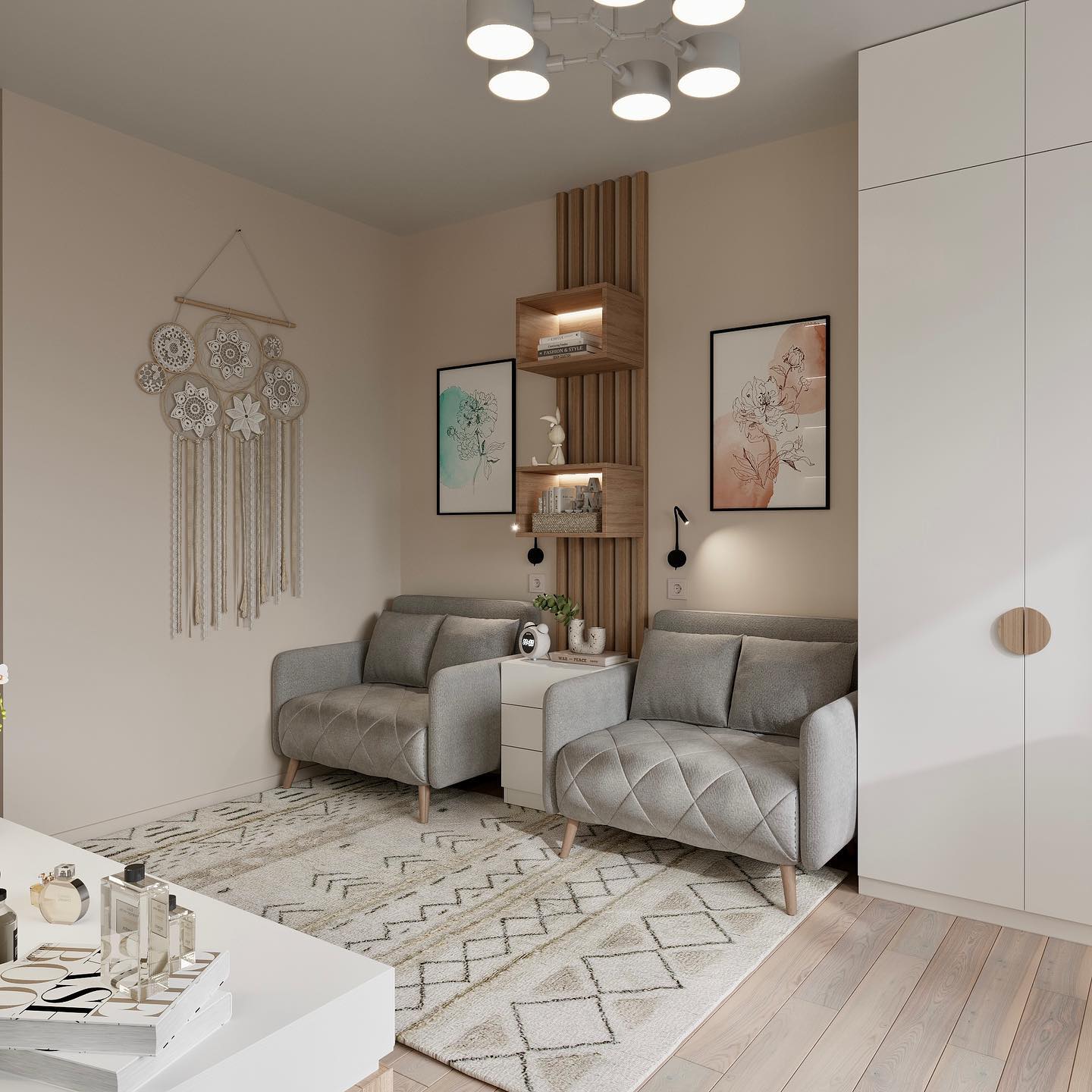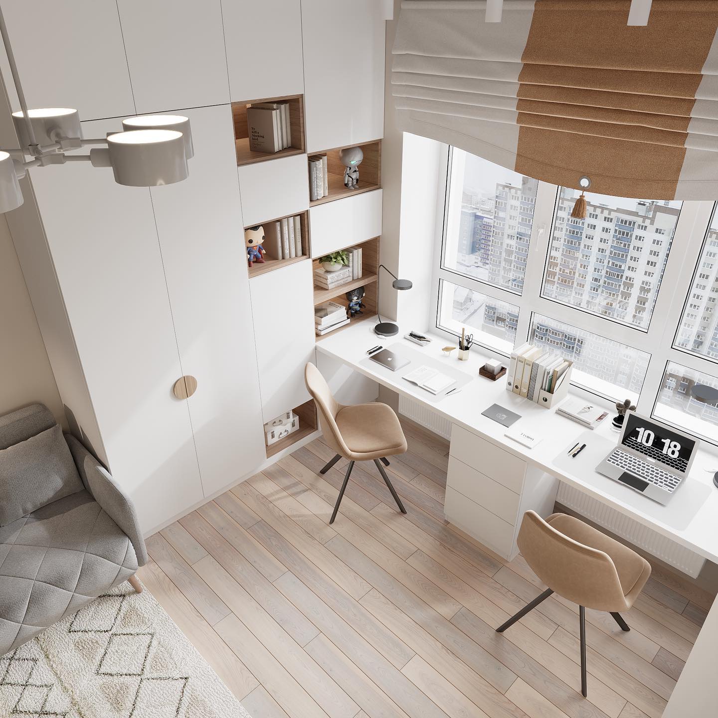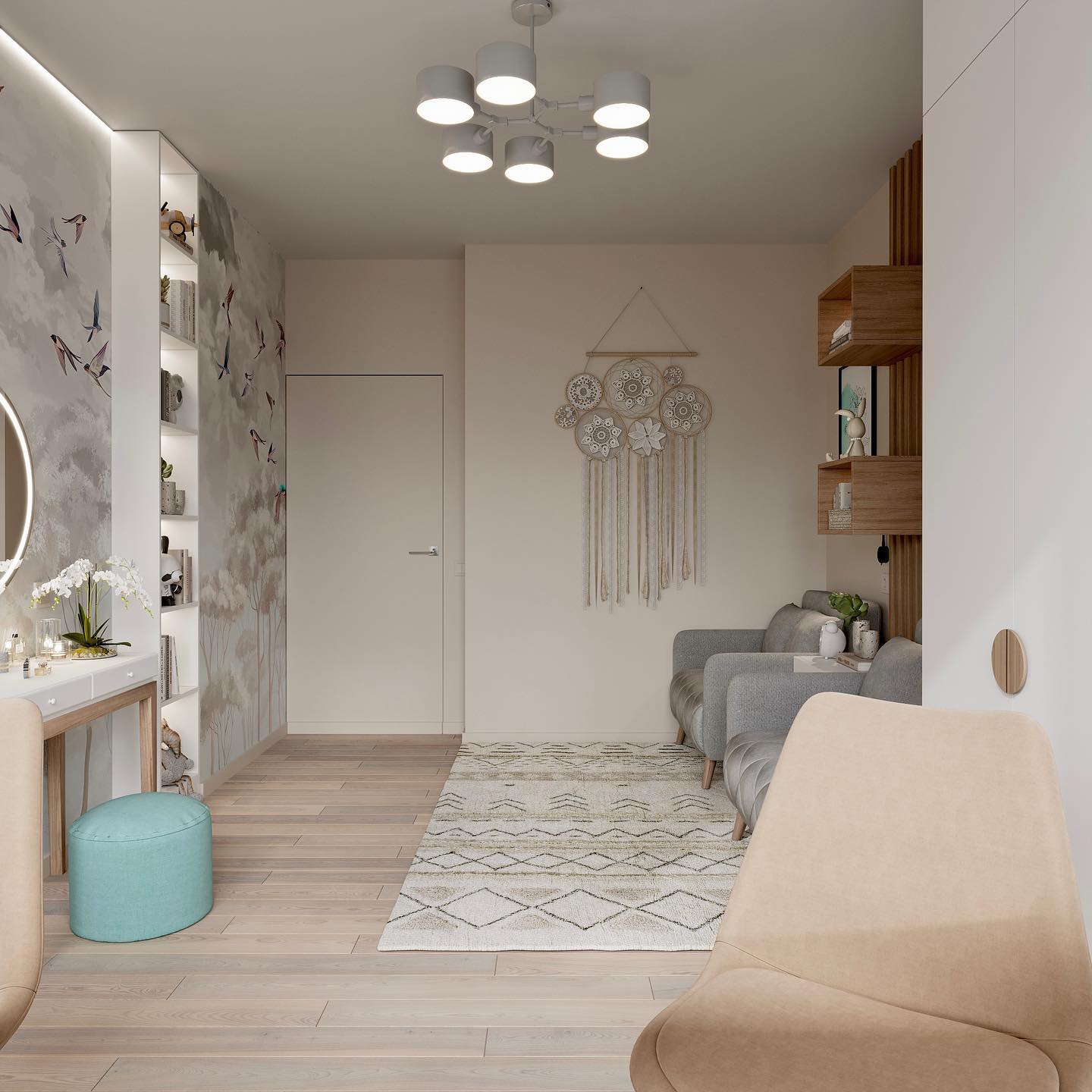 Детская комната для девочки Ксюши. В проекте были учтены все ее пожелания: обои и оттенки выбирала она и итоговое решение ей тоже понравилось. Важно обращать внимание, что хочет именно ребёнок, особенно в подростковом возрасте. Вторая кровать для подружек, если кто-то захочет остаться, ну и для братика, который ещё не подрос. Комната получилась нейтральная, декор и переставную мебель можно заменить со временем.