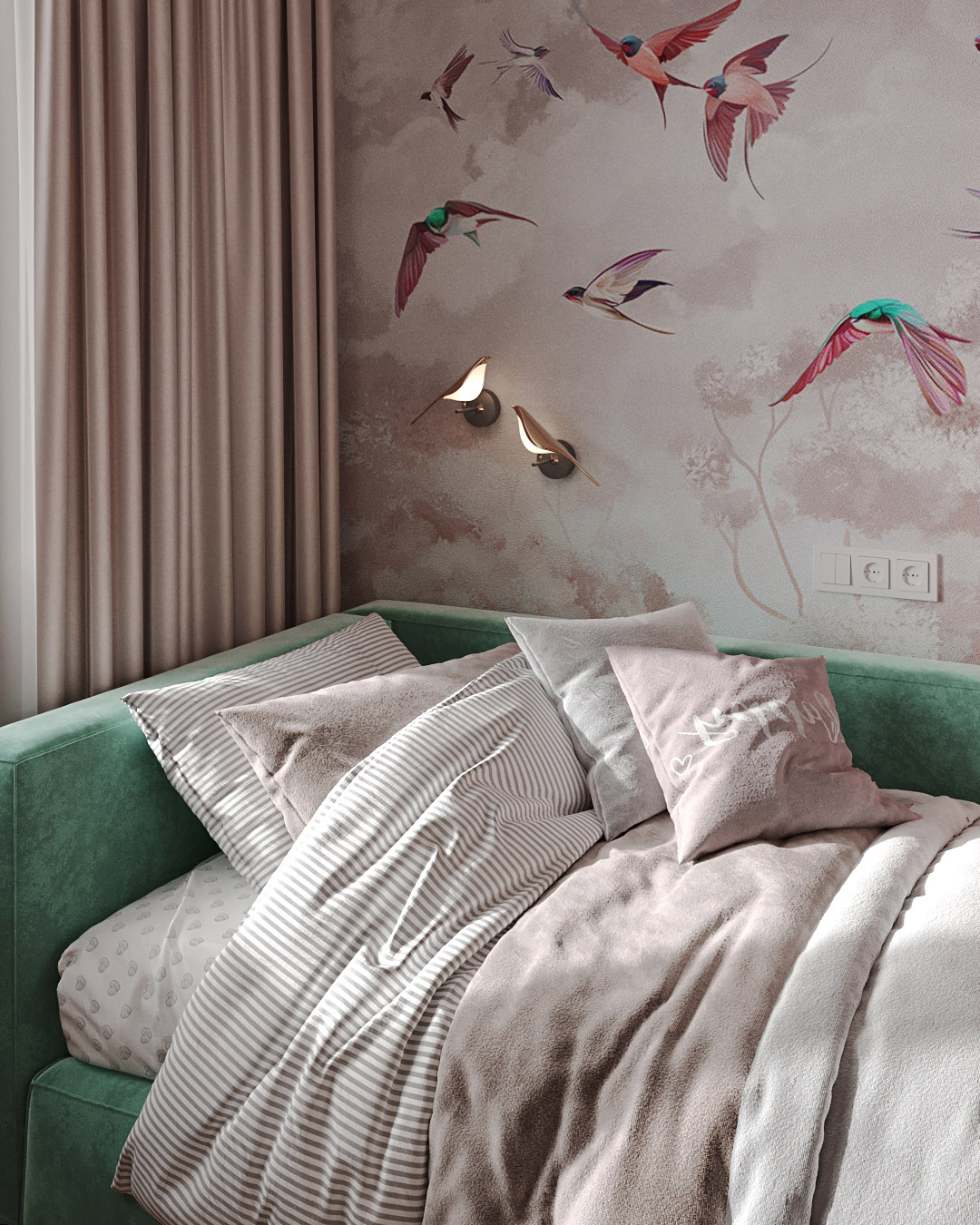 Детская комната площадью 15,5 м² для девочки 6 лет. Планировка в данном проекте получилась очень удобной и функциональной. При этом удалось сохранить достаточно пространства в комнате. Обои из коллекции Fauna замечательно дополнили и преобразовали пространство в зоне кровати. Так, в частном доме общей площадью 150 м² в городе Витебск Республика Беларусь маленькая девочка в скором времени обзаведется своим уютным и стильным интерьером.