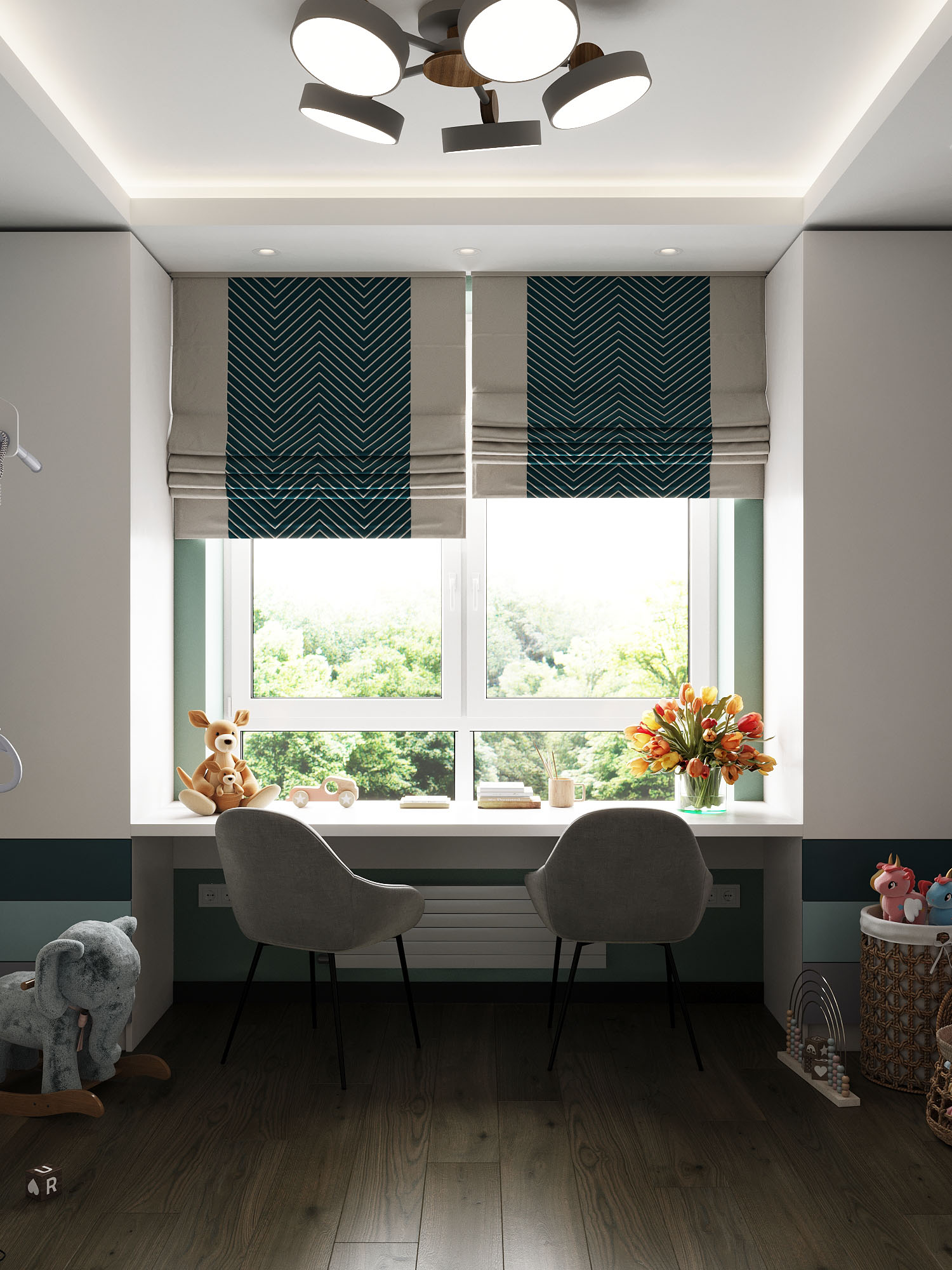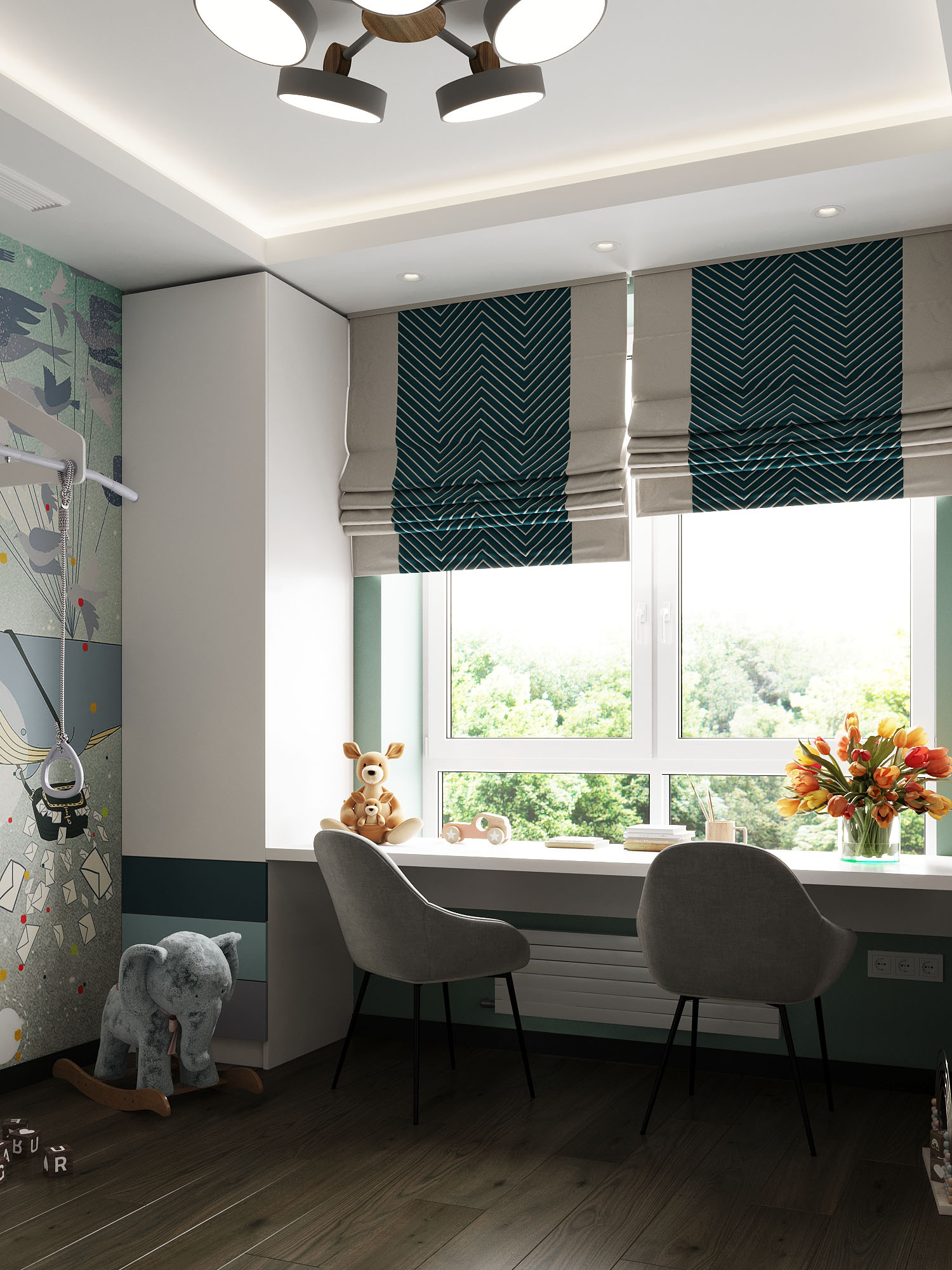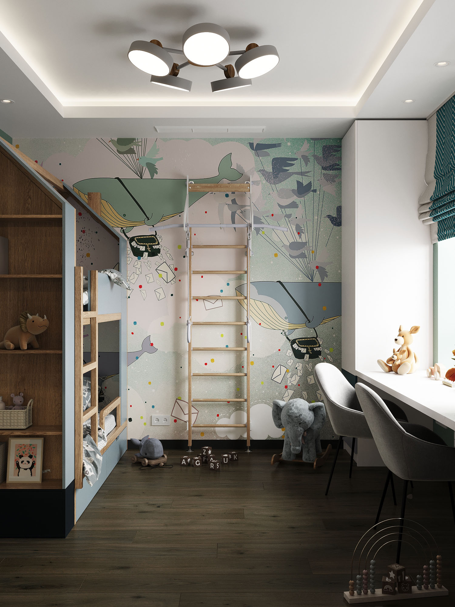 Проект детской на перспективу. Таким он был в самом начале. Дизайнер предложил нейтральный вариант с китами из коллекции «Felicita», которые давно не давали покоя. Цветовая гамма не делает намека на пол ребенка, и её легко трансформировать под определенные нужны.