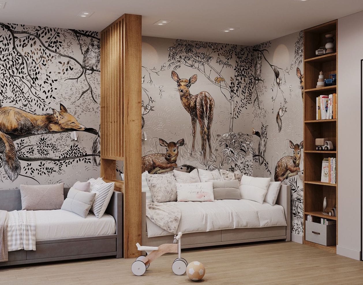 Детская комната для двух малышей-двойняшек. Обои из коллекции FERMA. Благодаря уютному сюжету и спокойным пастельным тонам дизайнеры коллекции превратят детскую в настоящий сказочный мир, который хочется разглядывать и развивать воображение!