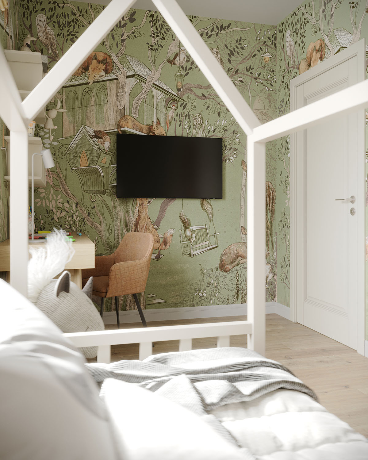 Комната для трехлетней девочки, которая еще верит в сказки и деда Мороза, поэтому обои выбирали «сказочные». Планировка комнаты выполнена таким образом, чтобы в будущем была возможность организовать рабочее место.