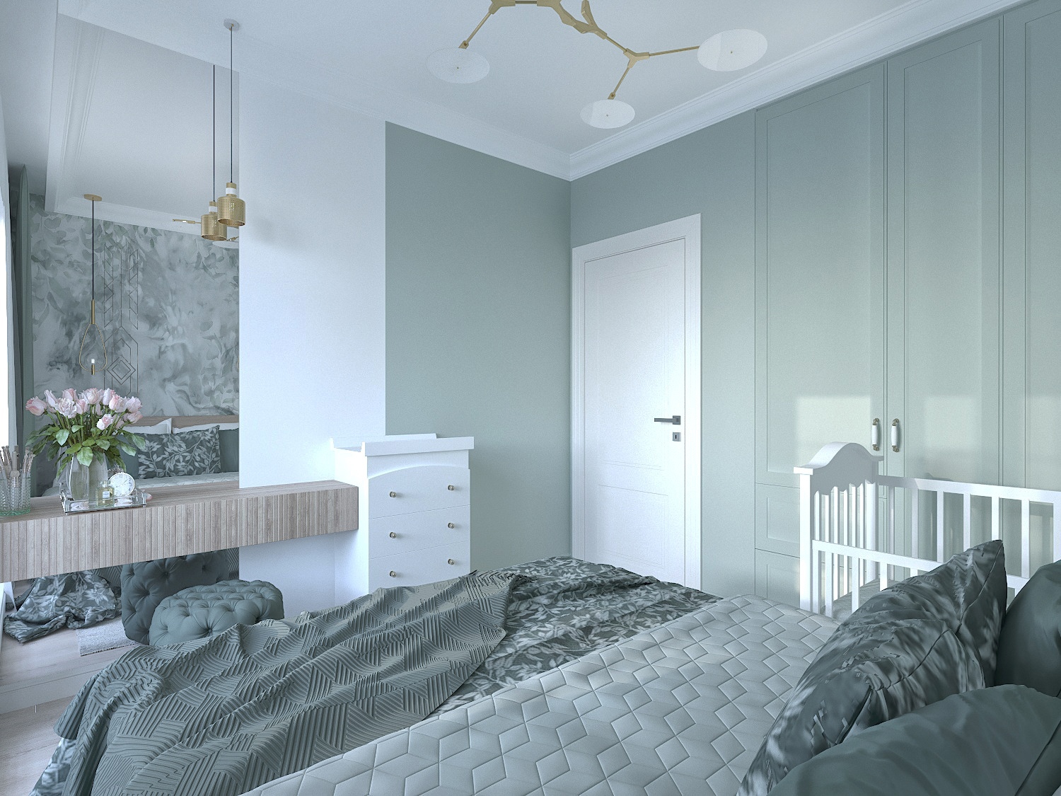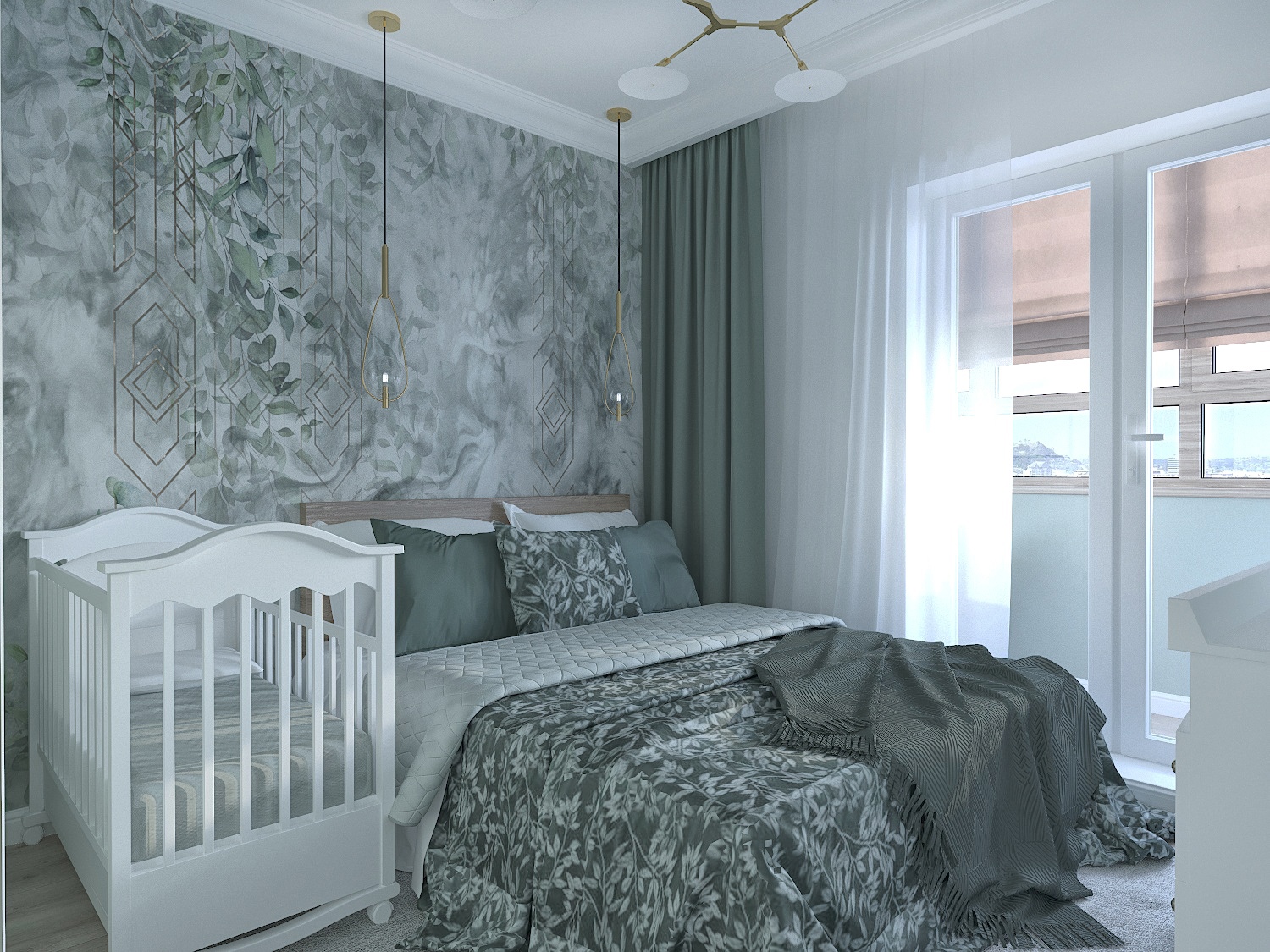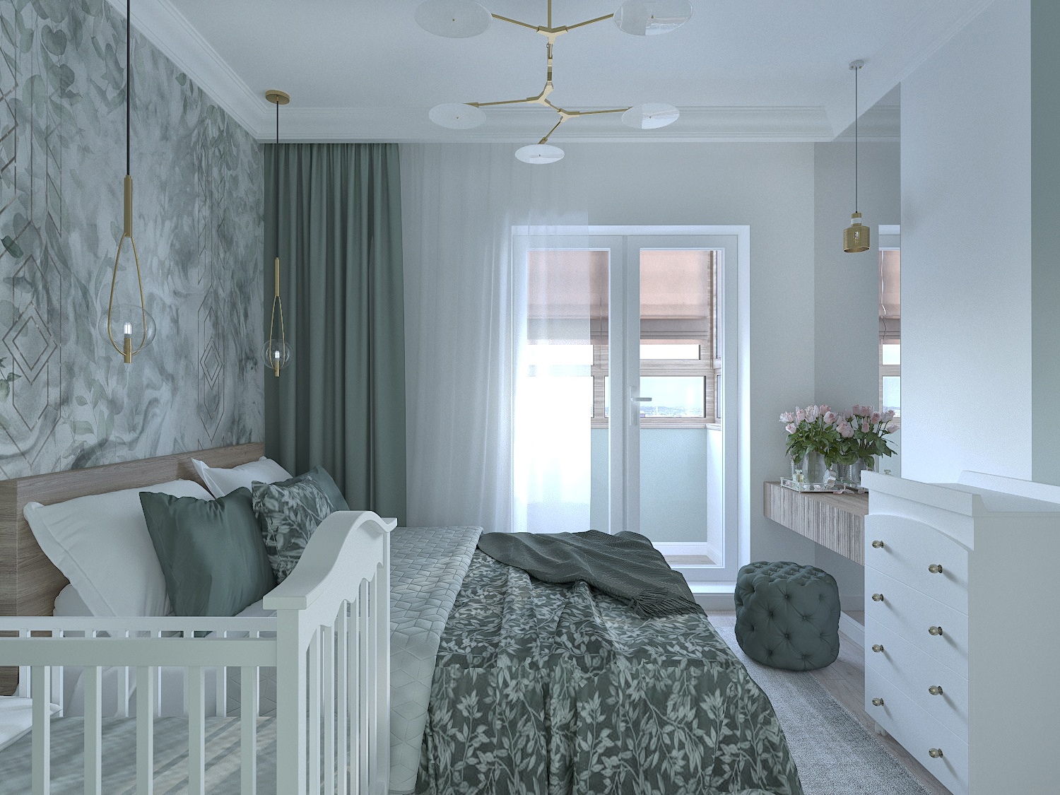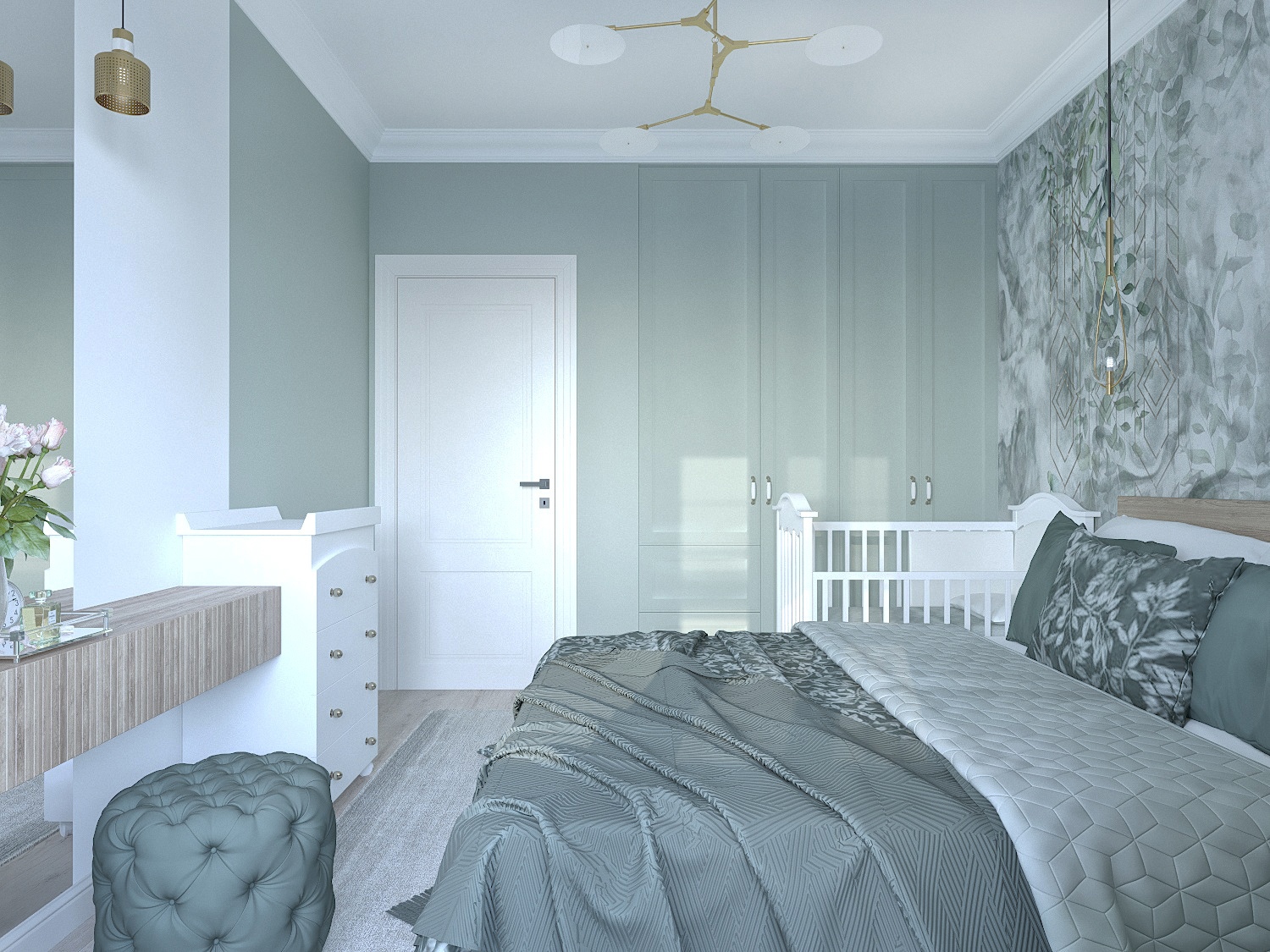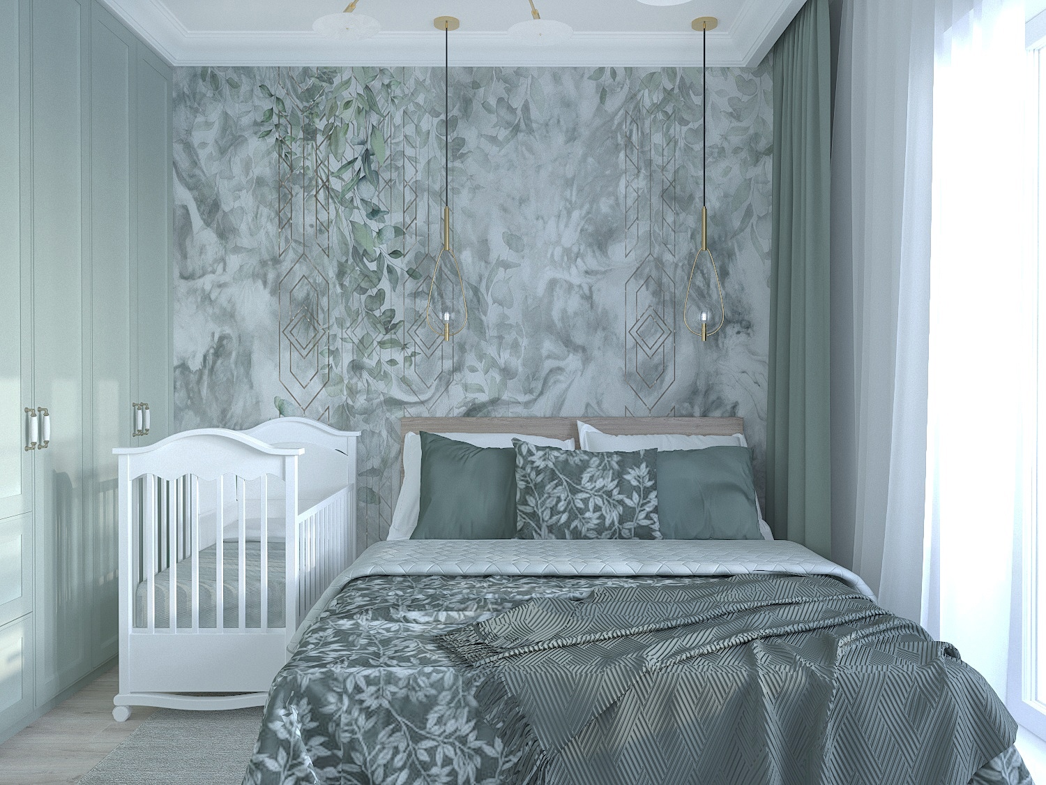 Спальня для молодой пары, ожидающей ребенка, г. Москва. Площадь комнаты — 9,5 м². Обои из коллекции Fiore. Неяркие природные зеленые оттенки создают в спальне атмосферу умиротворения.