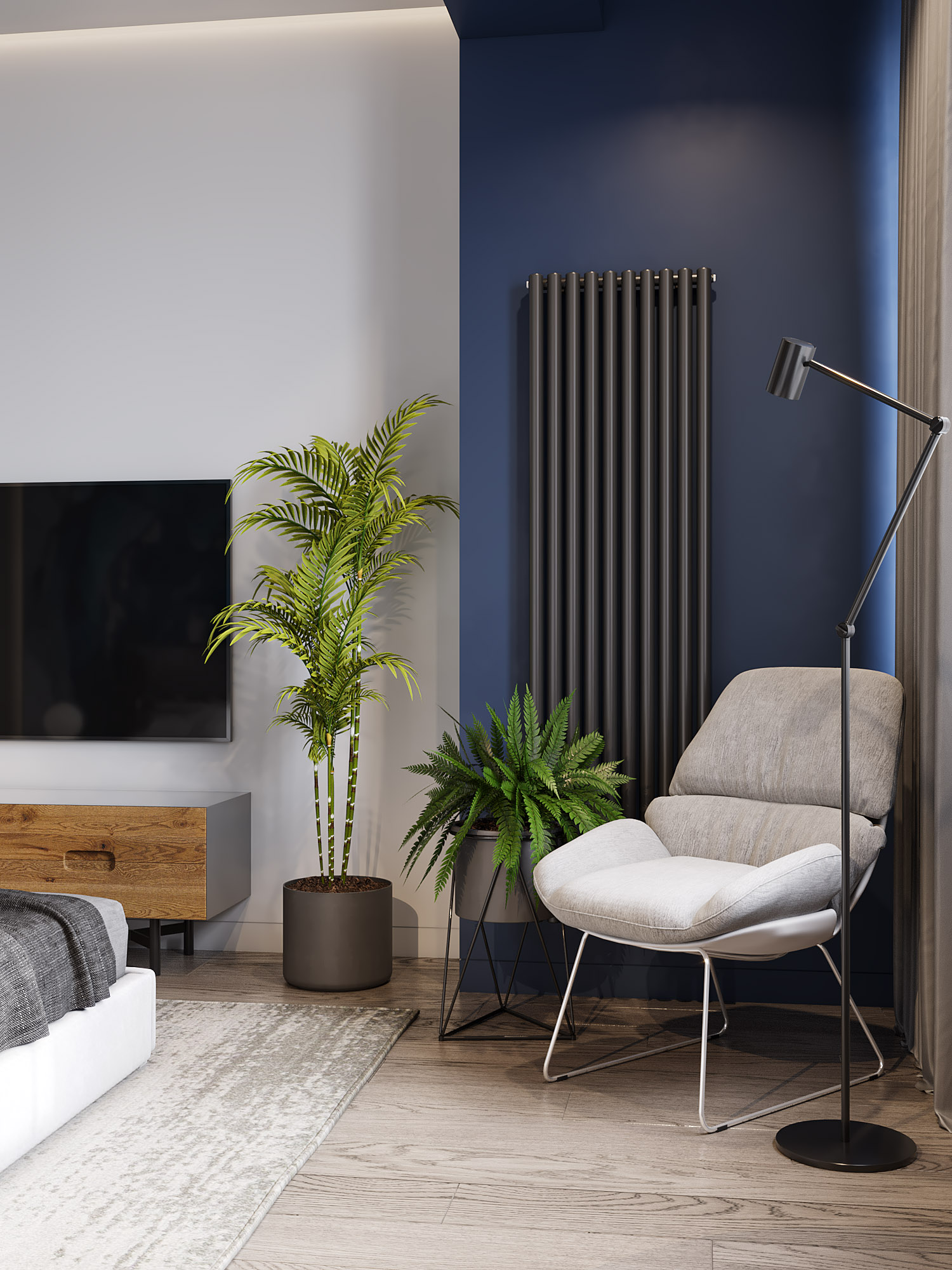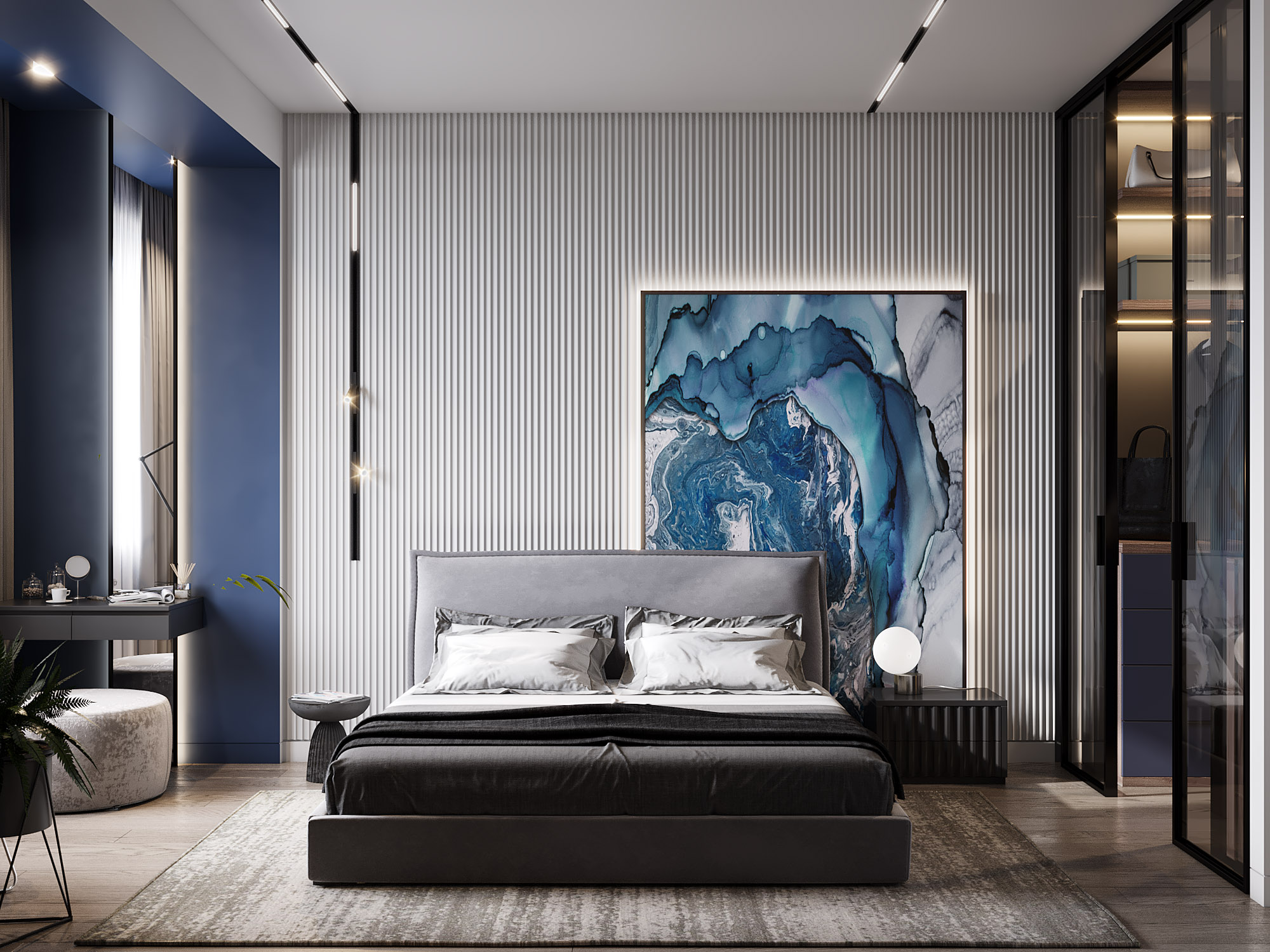 Мастер спальня в ЖК «Искра Парк», г. Москва. Акцентные обои «FLArt» задали цветовое настроение для дизайна всей квартиры и добавили море ассоциаций!