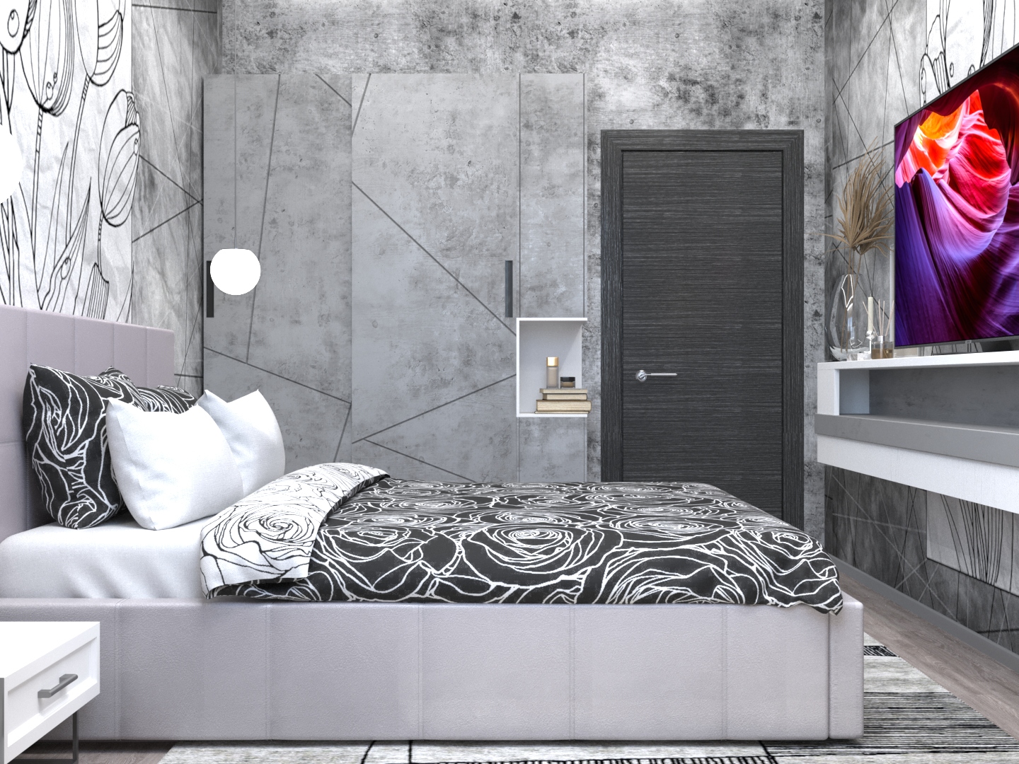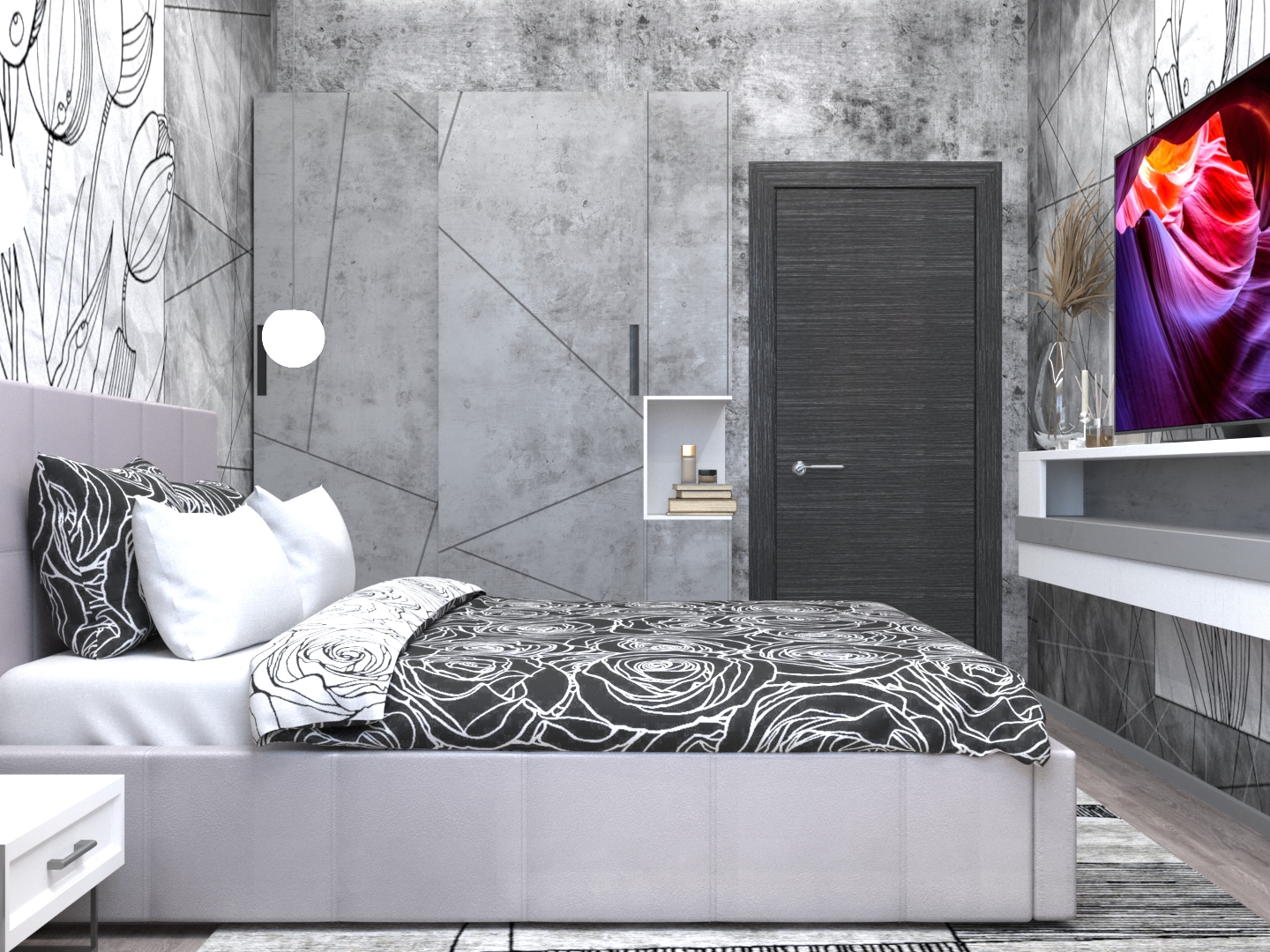 Нежная спальня в стиле «брутализм». Обои обеспечили плавное сопряжение жесткости бетона и мягкости пыльной розы.