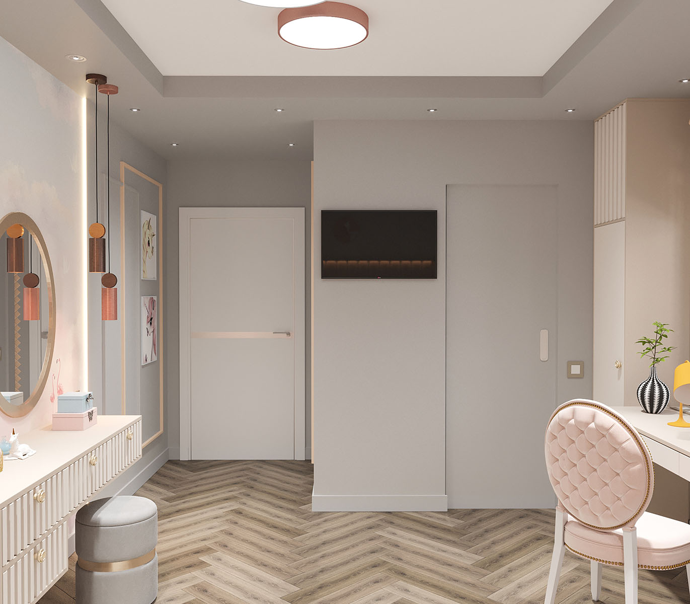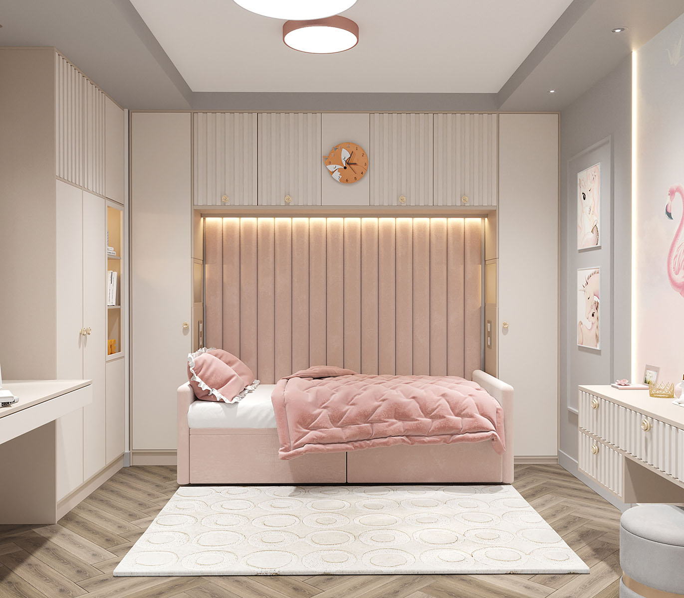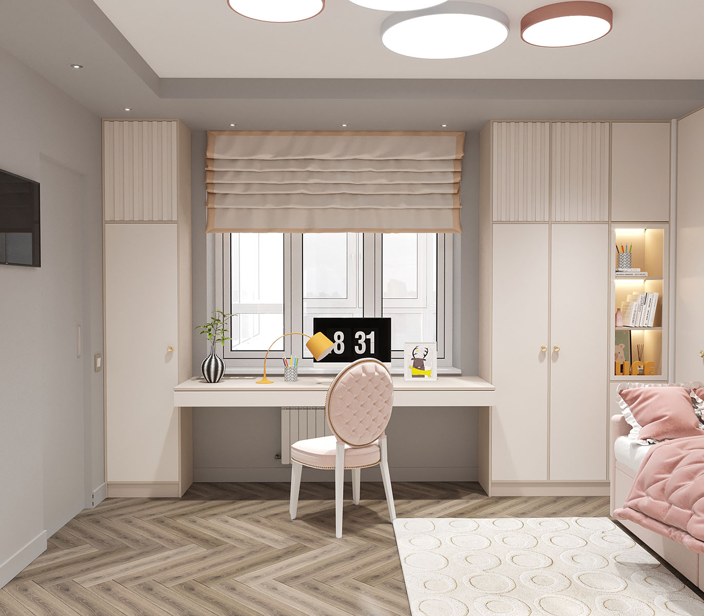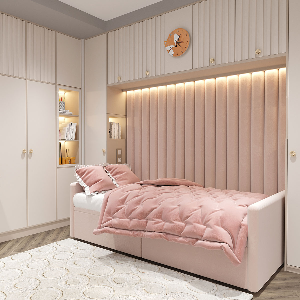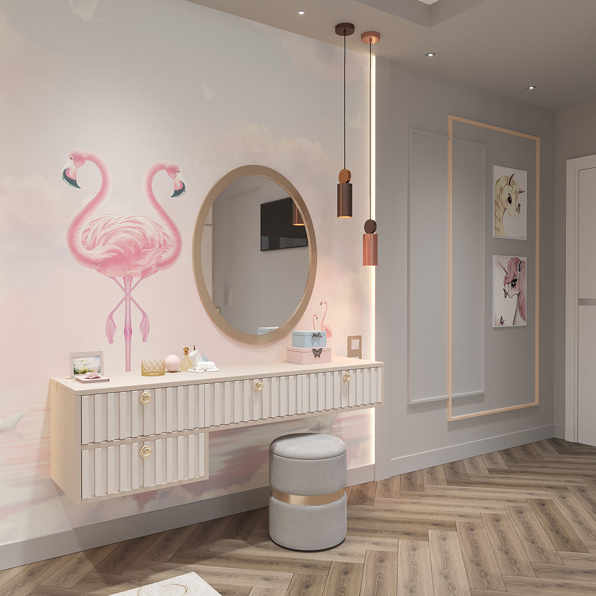 Детская для девочки, площадь комнаты — 17 м². Обои из коллекции FLY DREAM. В ней мы совместили пастельные оттенки, интересные иллюстрации и уникальные сюжеты — всё, чтобы каждый ребёнок ощущал себя в «своём мире» — лёгком, удивительном, непосредственном и свободном от гравитации.