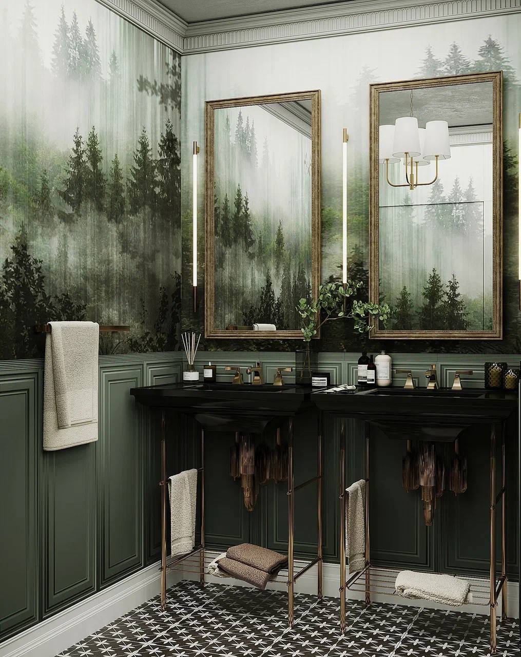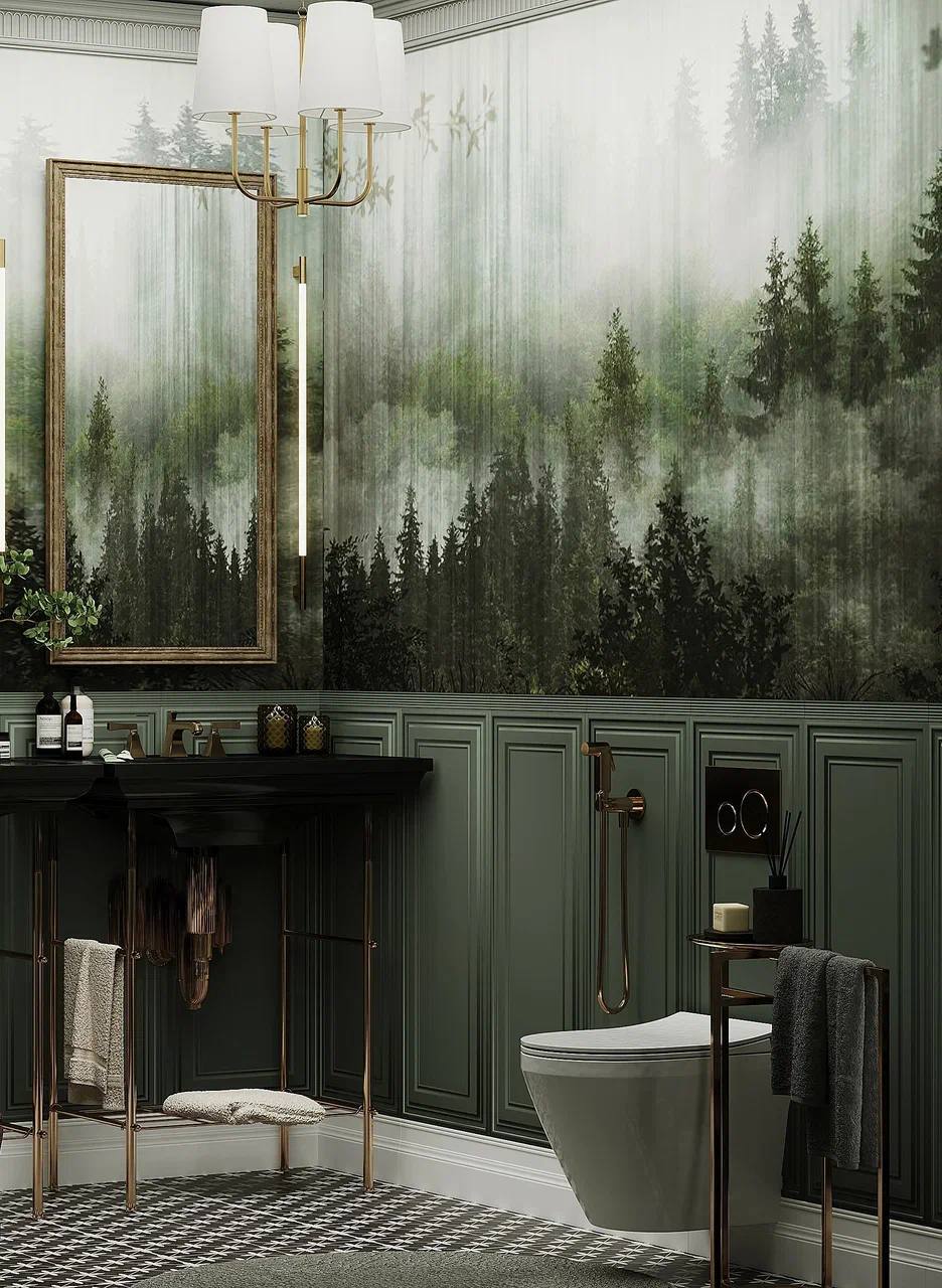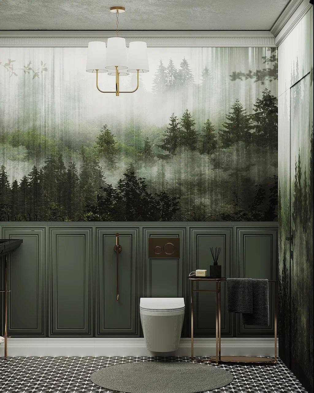 Необычные обои FORESTA в оформлении санузла. Размытые очертания деревьев создают неповторимую атмосферу. В нашей интерпретации лес скрывает легкая ткань, прозрачная и невесомая, не перегружающая, а наоборот, добавляет воздух в ваше пространство! Это выглядит очень красиво, ненавязчиво и очень стильно.