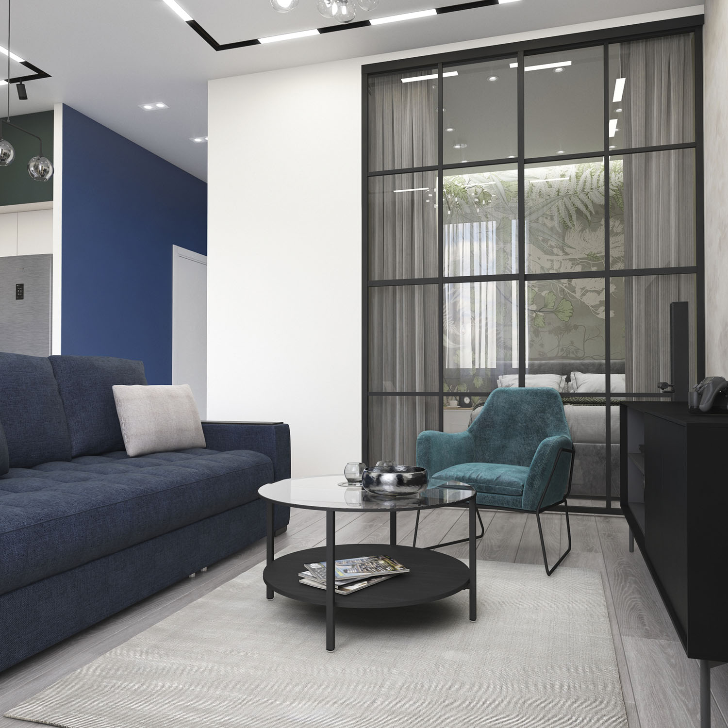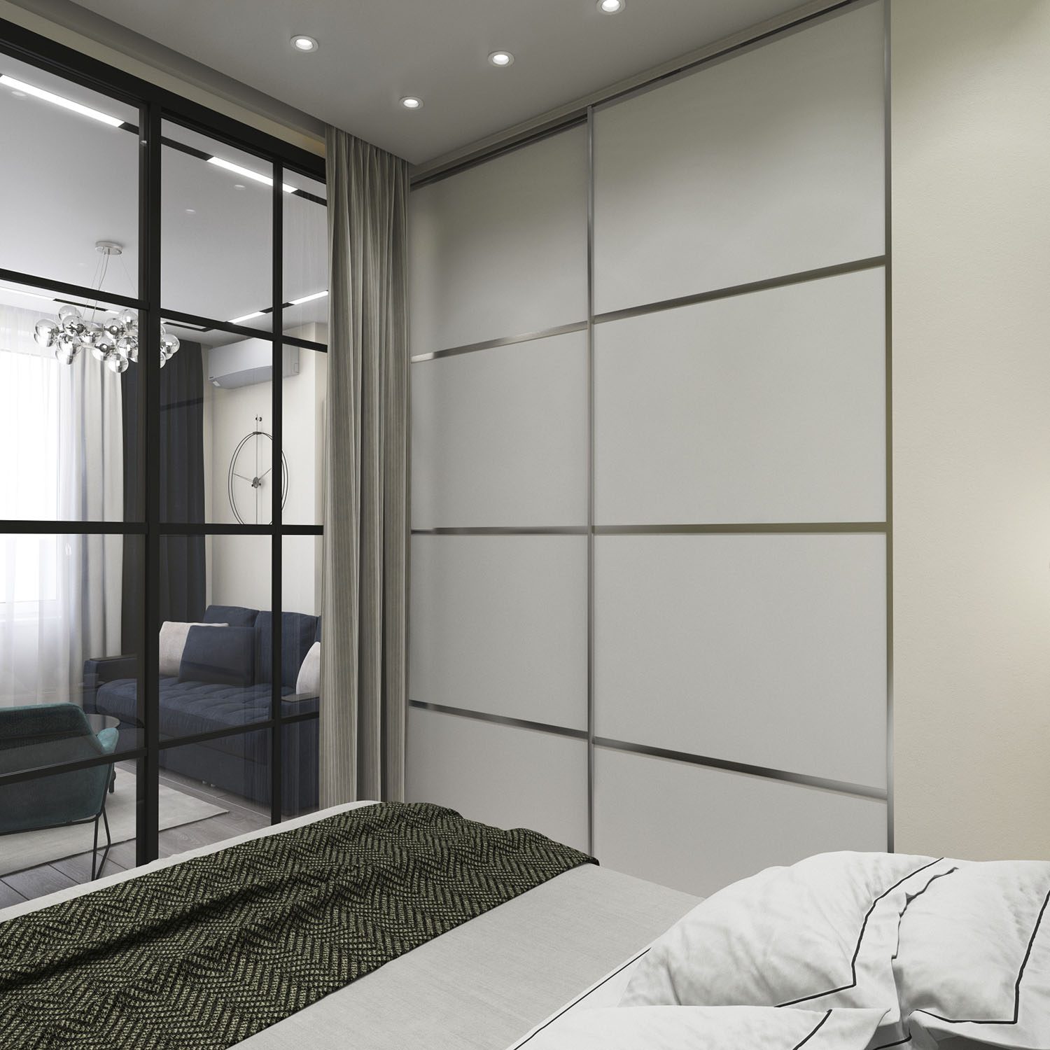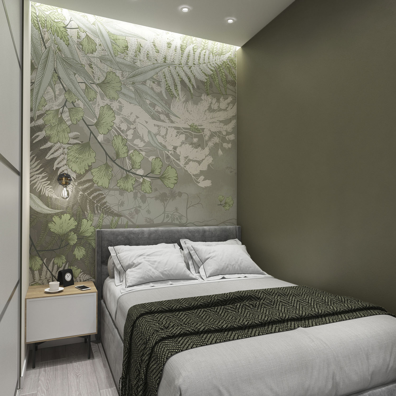 Порой бывает сложно убедить клиента в идее добавить немного мягкости в холодный мужской интерьер, но не в этот раз. Заказчик не смог устоять перед обоями Wall Street из коллекции FOREST и утвердил идею внедрения обоев в зону спальни. В сочетании с синими и серыми оттенками, холодными текстурами и стеклянными перегородками в стиле LOFT мягкий и глубокий зеленый стал отражением загадочной и вдумчивой фигуры клиента. Получилось очень уютно и вместе с тем стильно!