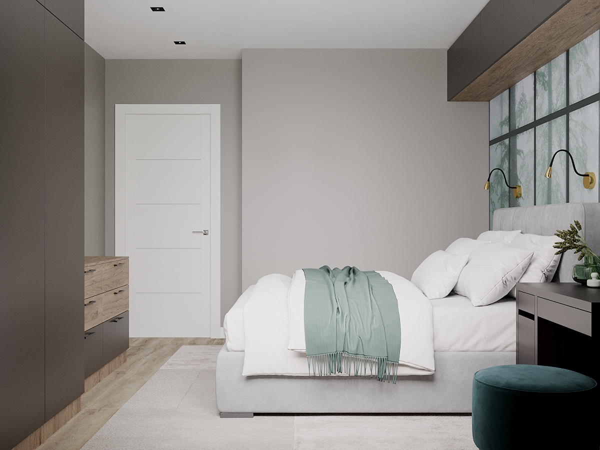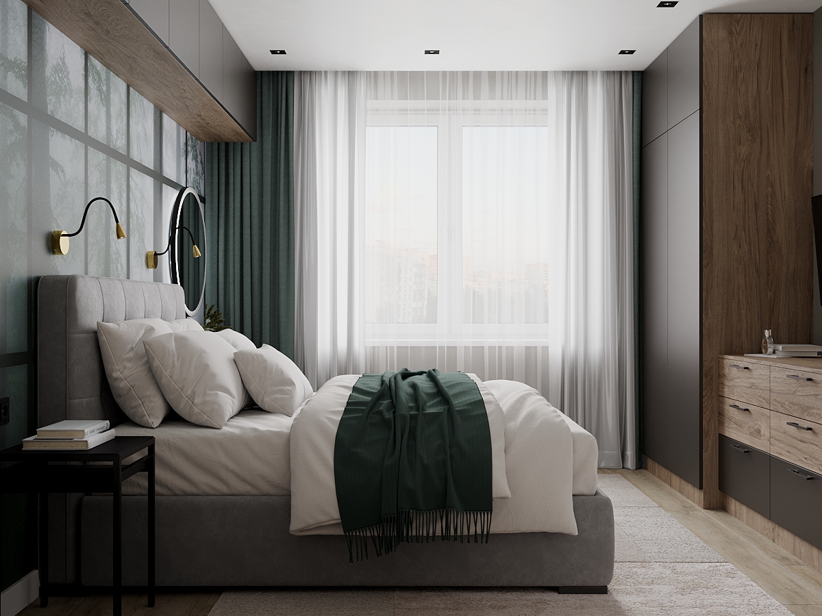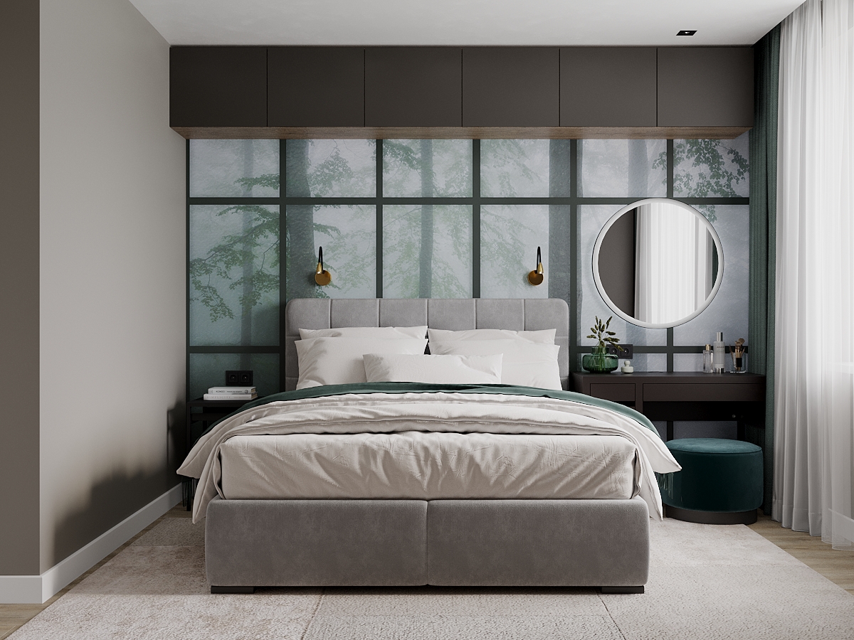 Небольшая, но уютная спальня площадью 12,7 м² в ЖК «Прага», г. Рязань. Фреска из коллекции «Frame-2019» задала настроение комнаты, в то же время расширив пространство, добавив уюта и воздуха.
