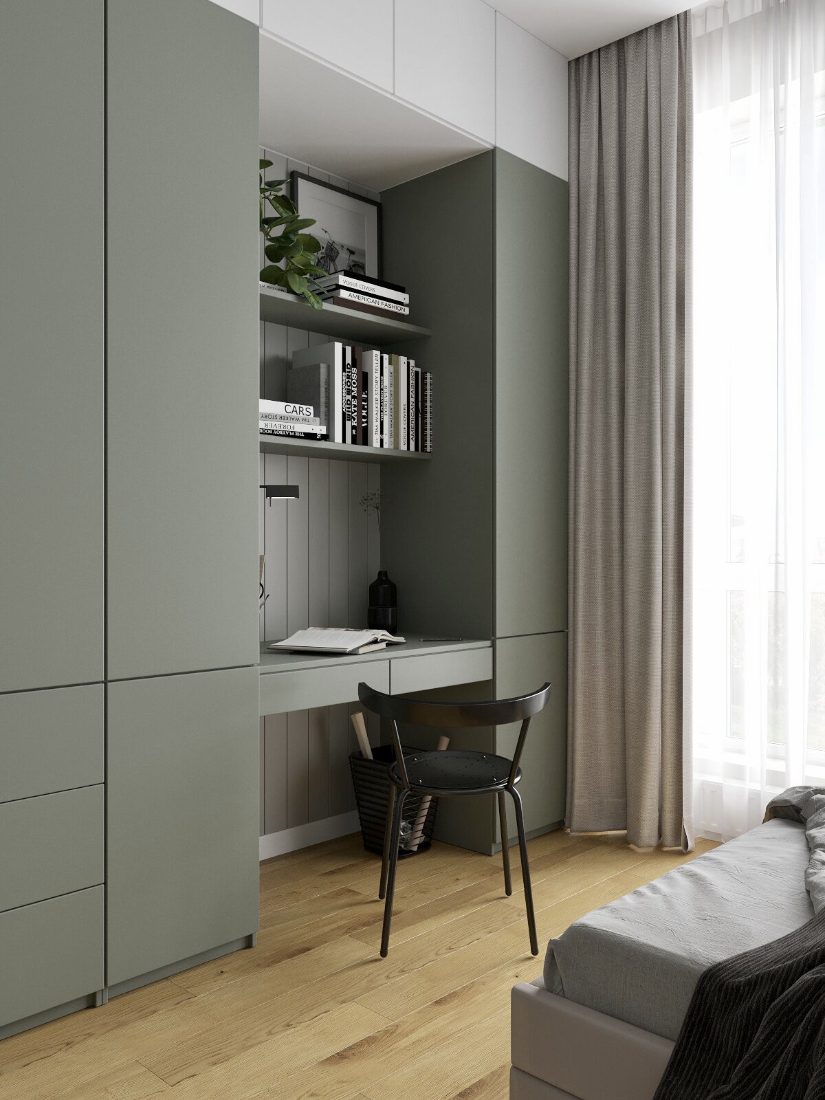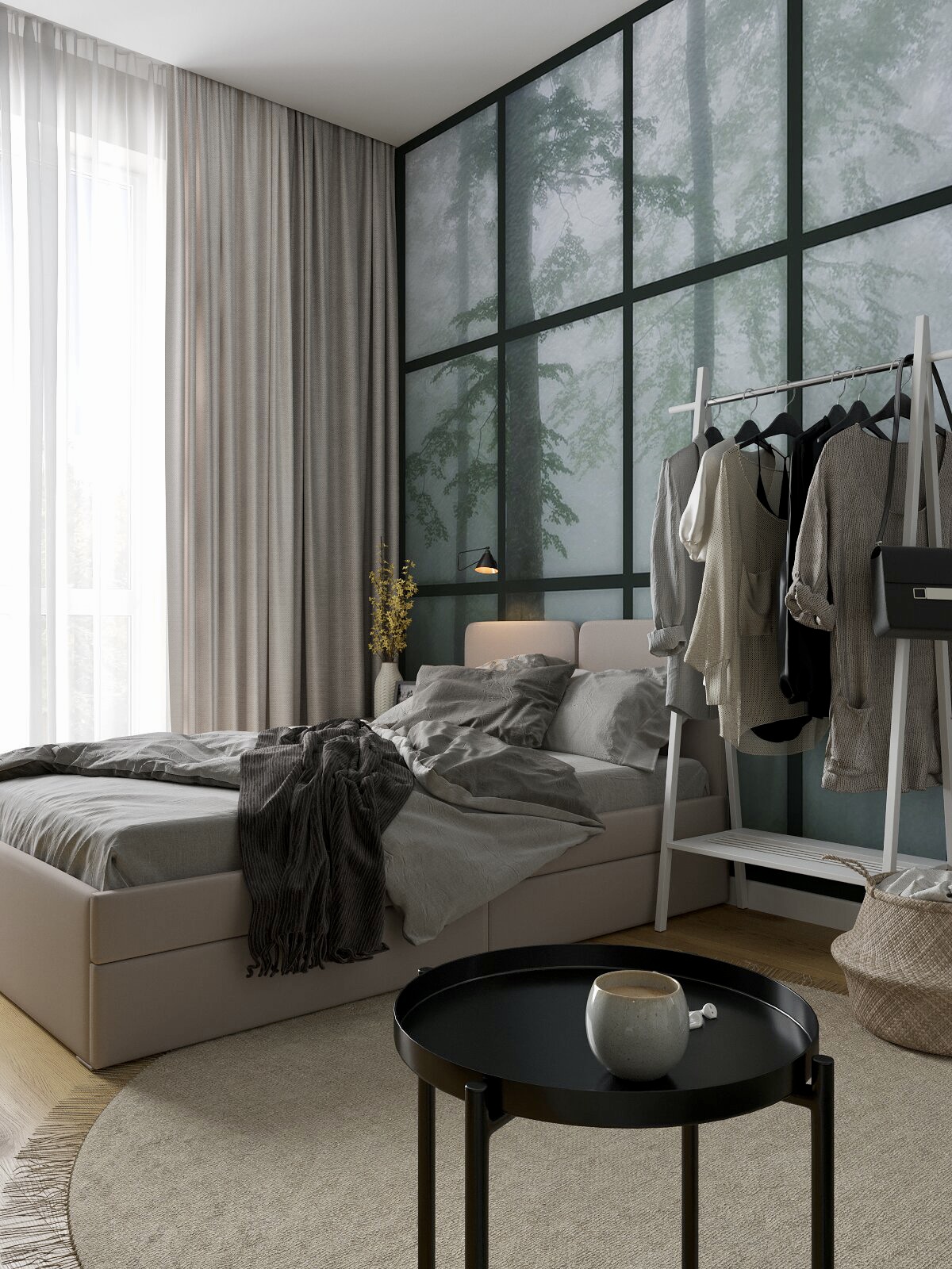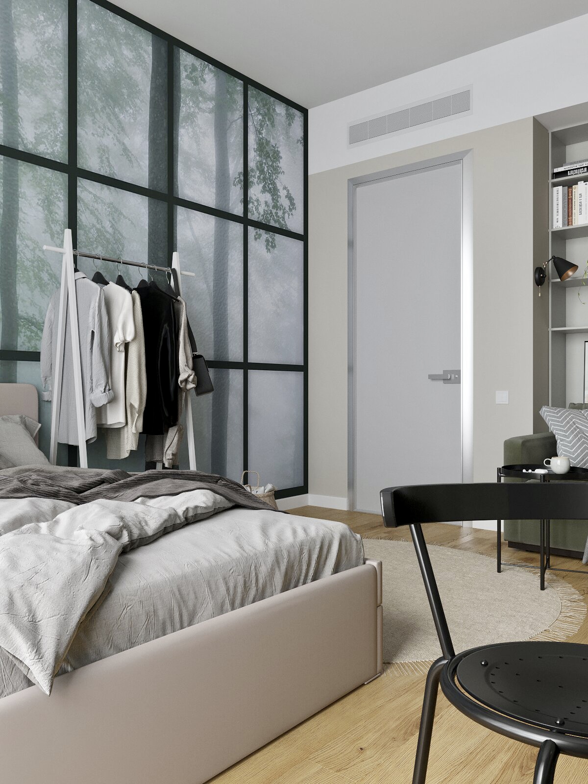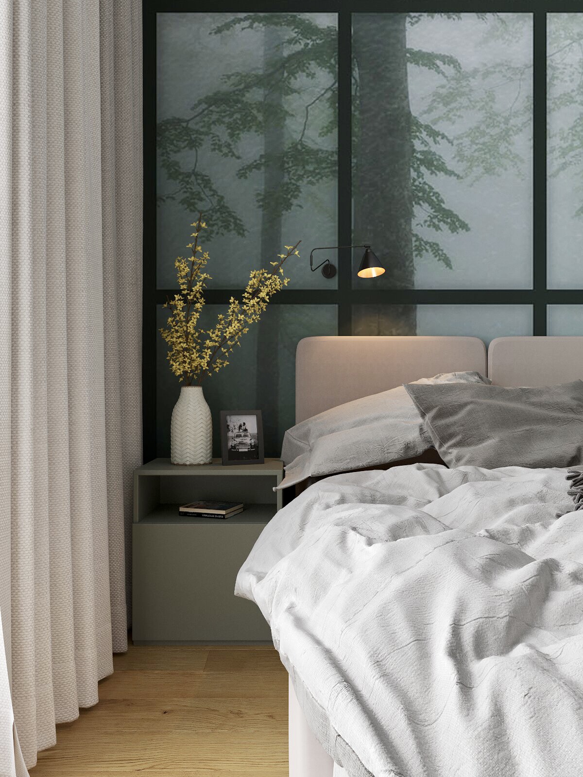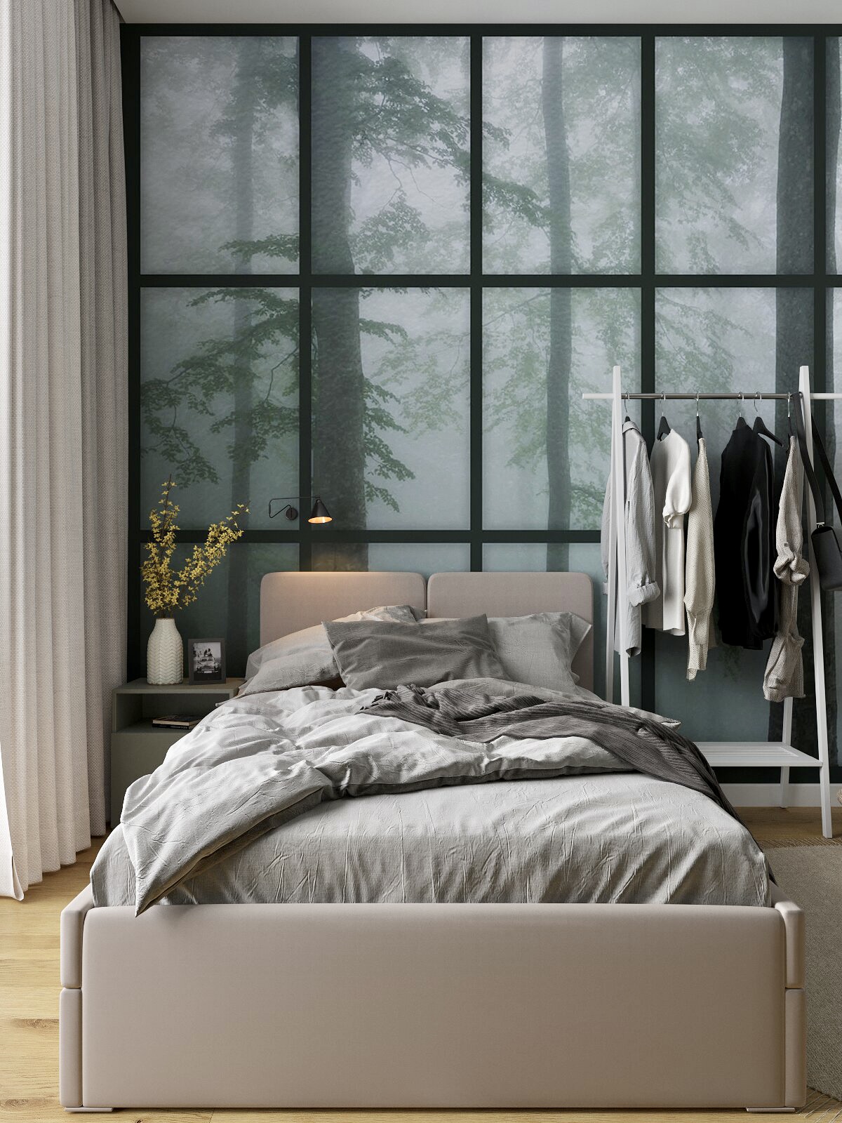 Проект комнаты площадью 22 м² в зеленых тонах для девочки-подростка с использованием обоев из коллекции «Frame-2019». Благодаря принтам этой удивительной коллекции в вашей спальне появится персональный телепорт в прохладный лесной массив. За имитацией стеклянных окон раскинулись зелёные заросли, которые так и манят своей свежестью и утренней прохладой.