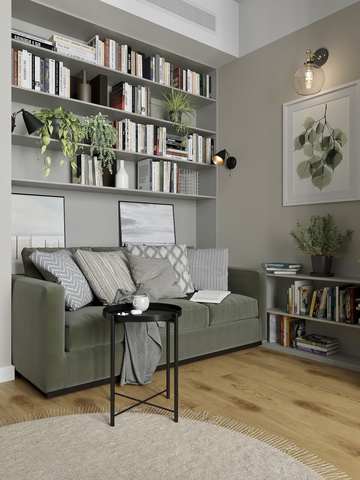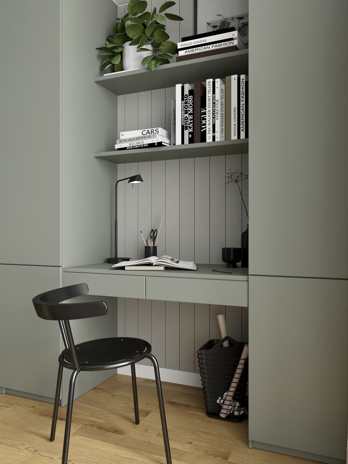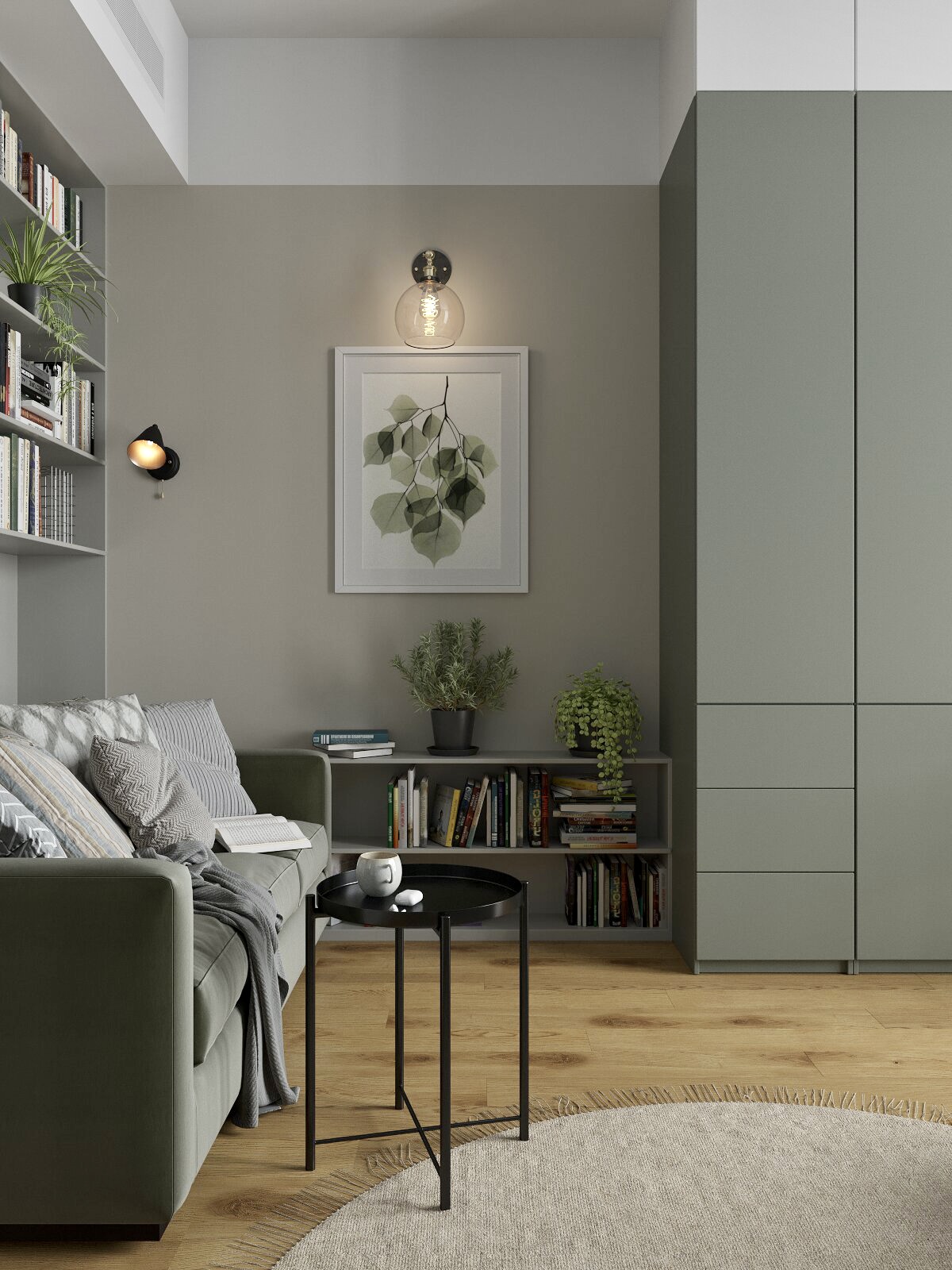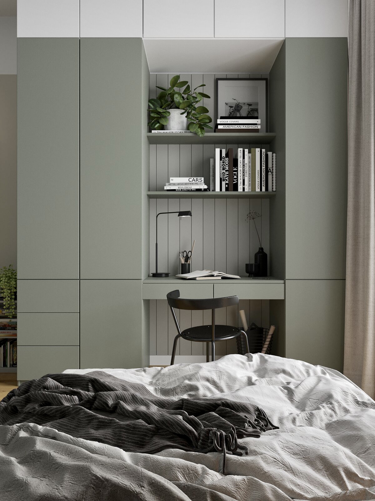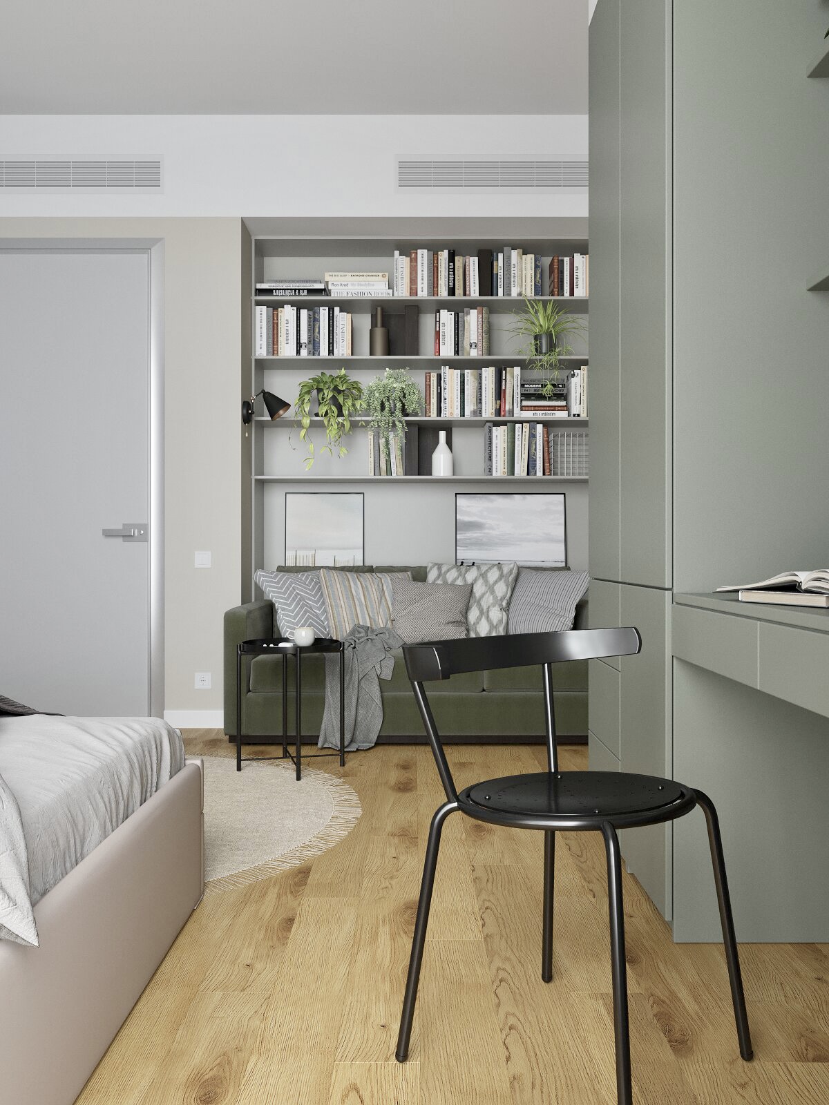 Проект комнаты площадью 22 м² в зеленых тонах для девочки-подростка с использованием обоев из коллекции «Frame-2019». Благодаря принтам этой удивительной коллекции в вашей спальне появится персональный телепорт в прохладный лесной массив. За имитацией стеклянных окон раскинулись зелёные заросли, которые так и манят своей свежестью и утренней прохладой.