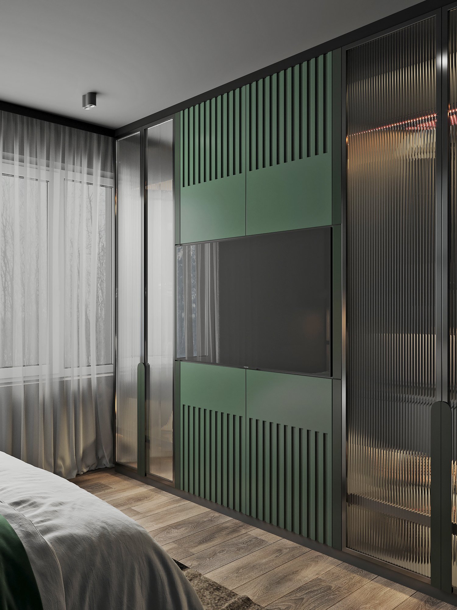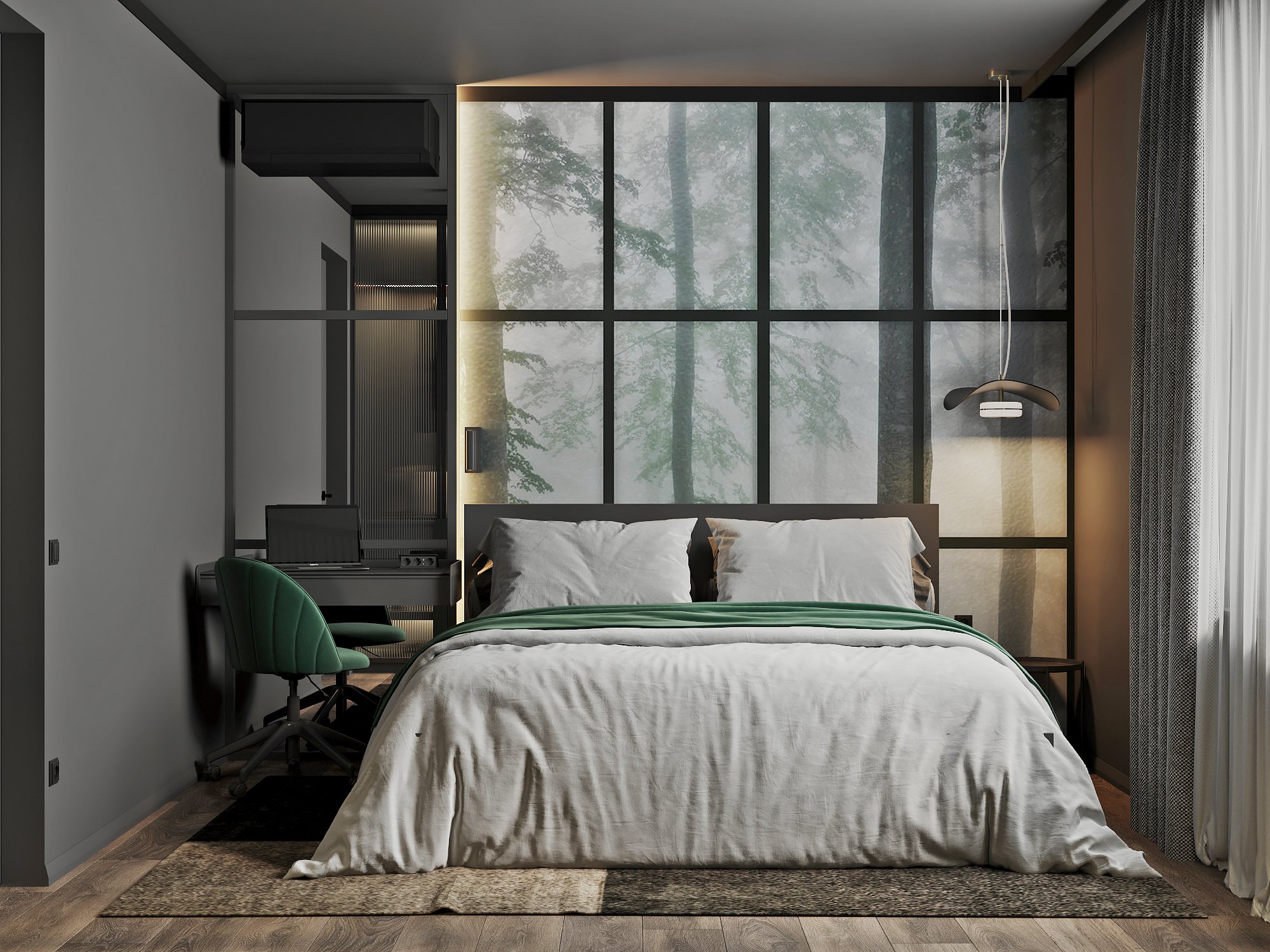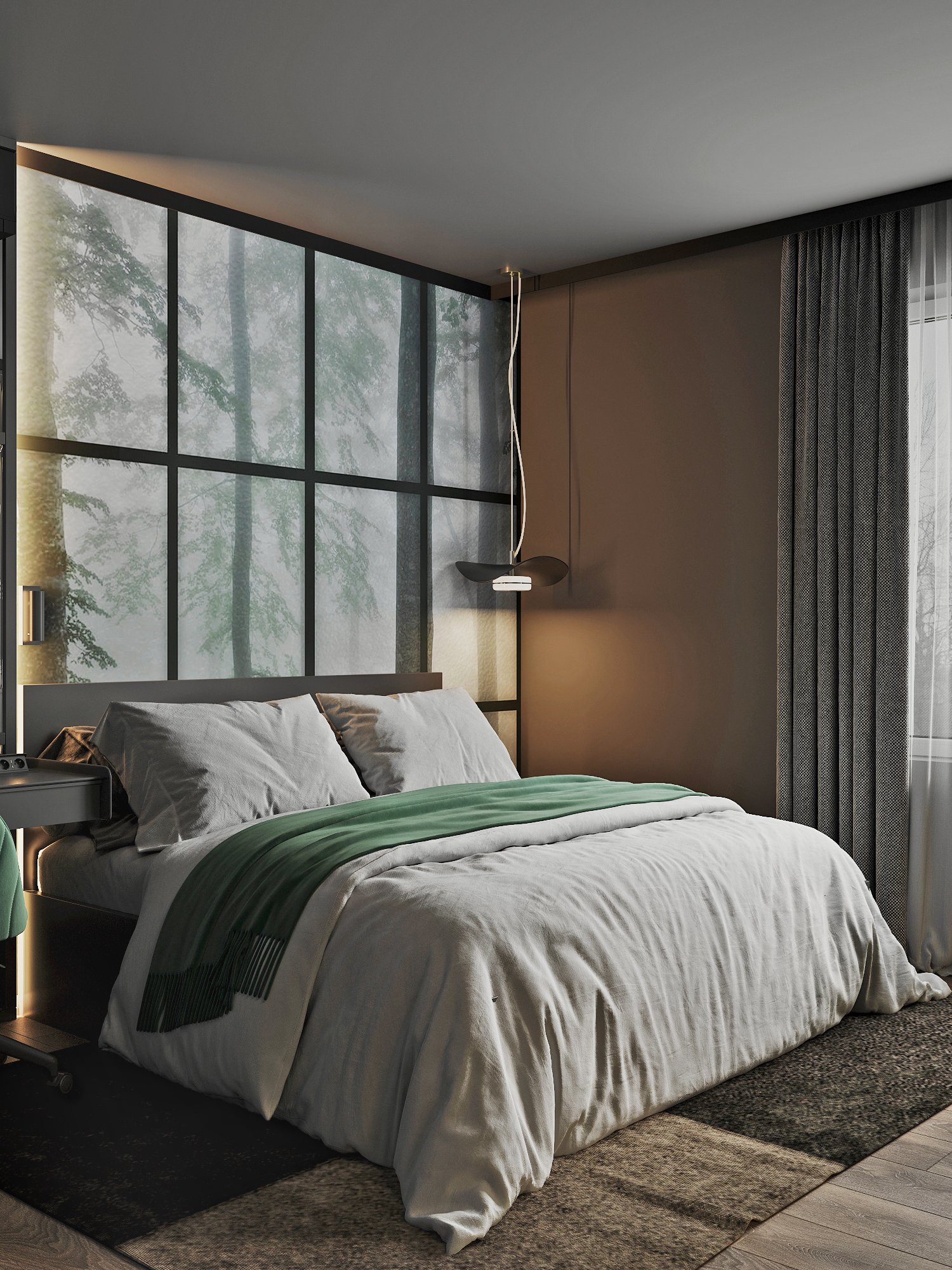 Спальня для молодой пары в ЖК Солнечный город. Обои из коллекции «Frame 2019» помогли визуально увеличить пространство комнаты и добавили помещению уютные природные нотки.