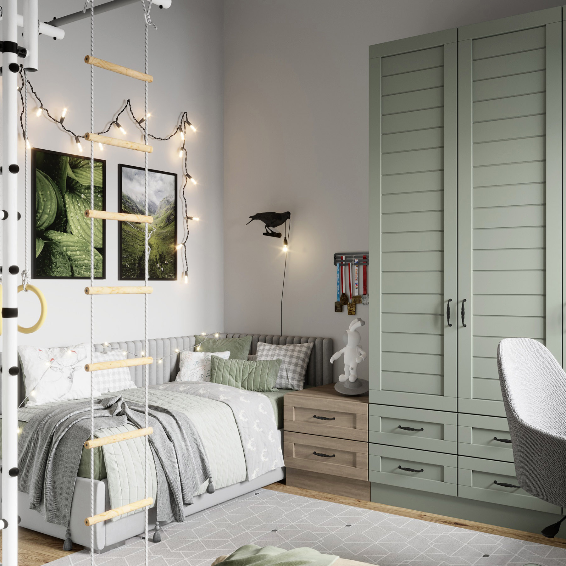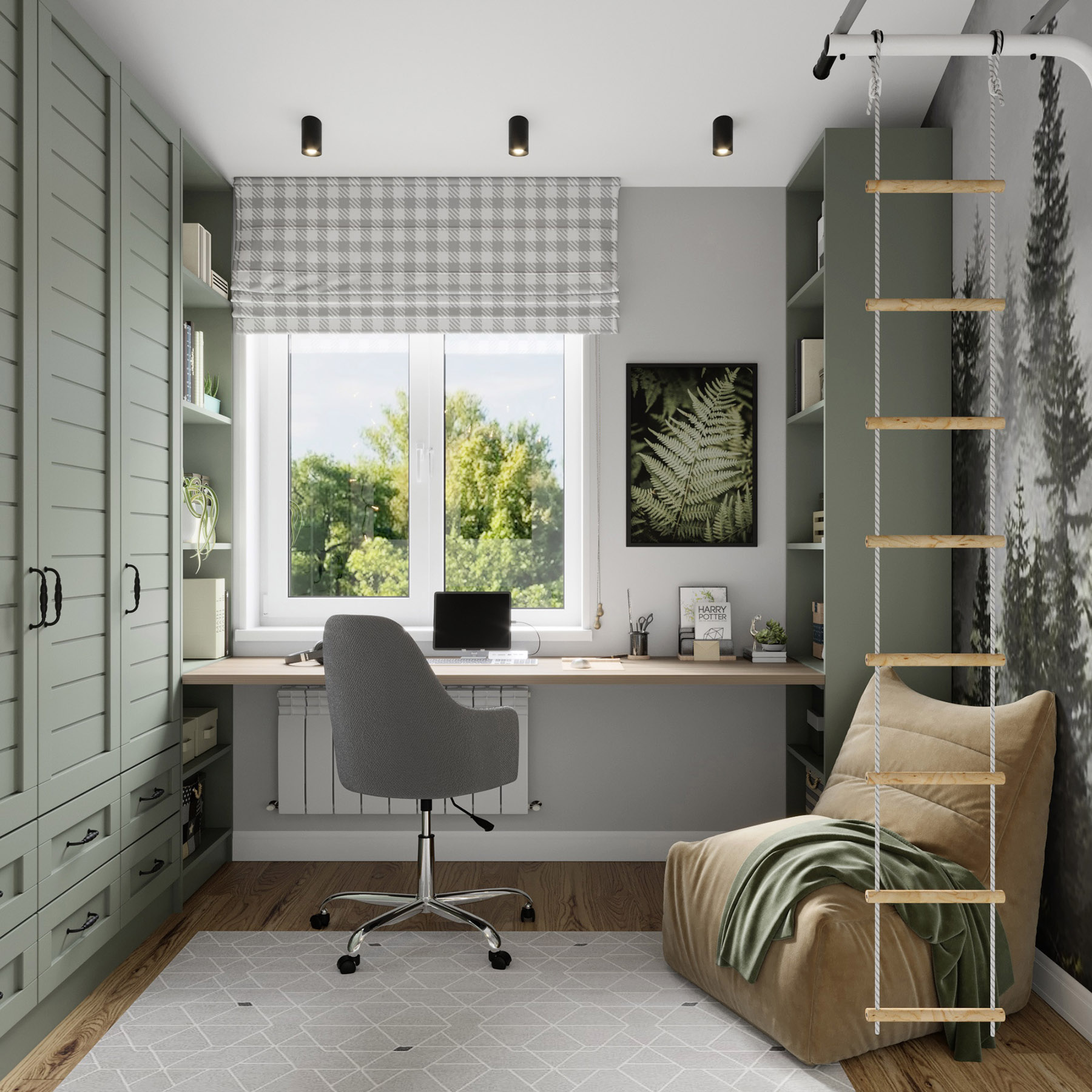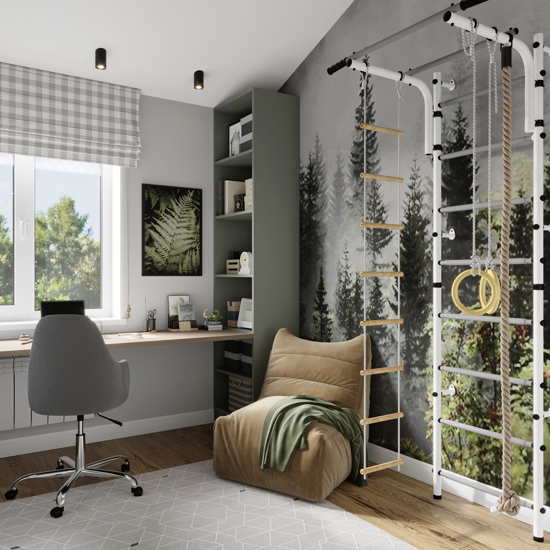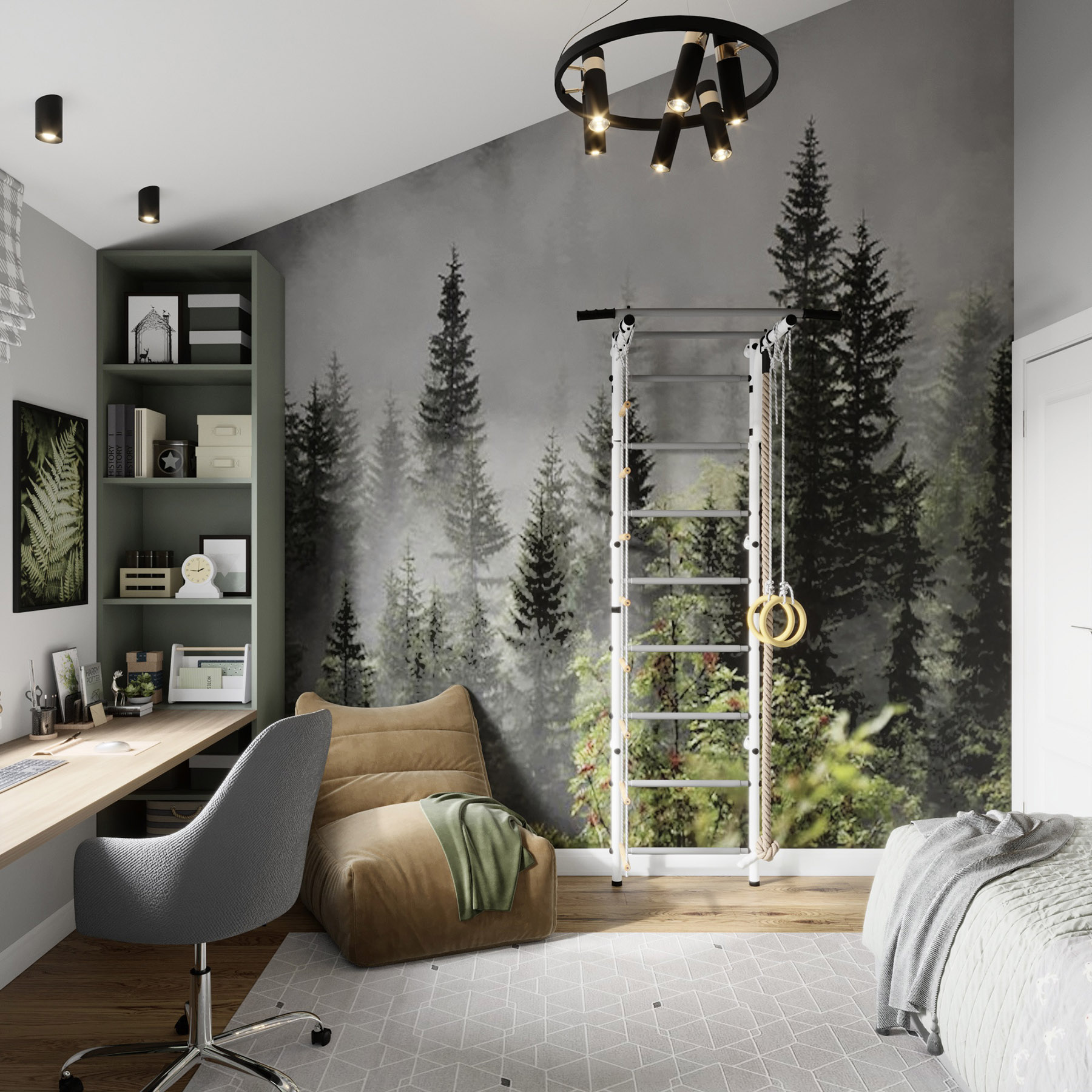 Проект детской в загородном доме. Дизайн комнаты продолжает тему природы, перекликаясь с пейзажами за окном. Обои из коллекции «Frame-2019» расширяют пространство и дарят атмосферу спокойствия и уюта.