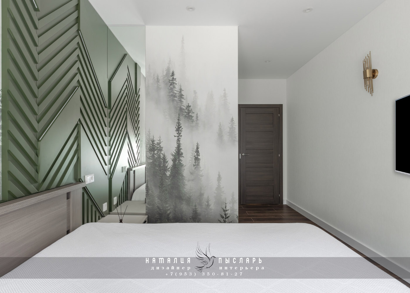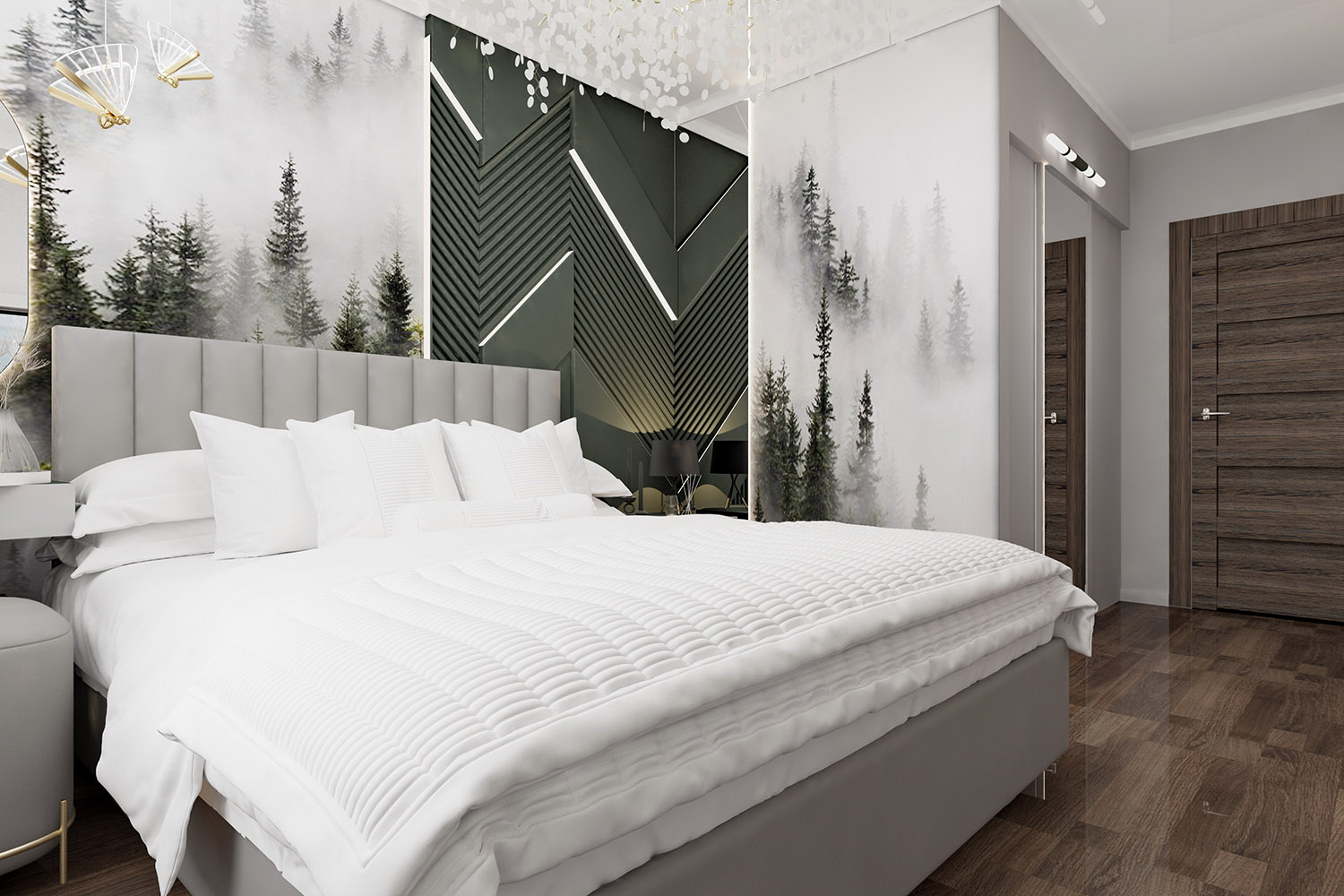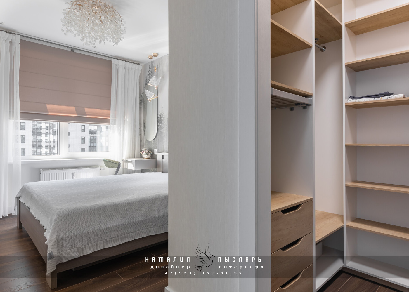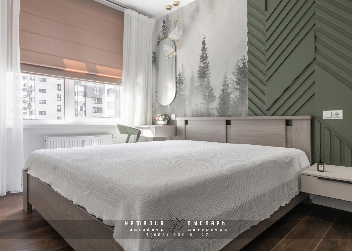 Спальня площадью 14 м² в трехкомнатной квартире в Санкт Петербурге. Компромисс в интерьере достигнут за счет зонирования на мужскую и женскую зону. Обои из коллекции FRAME-2019 добавили интерьеру уюта и воздушности.